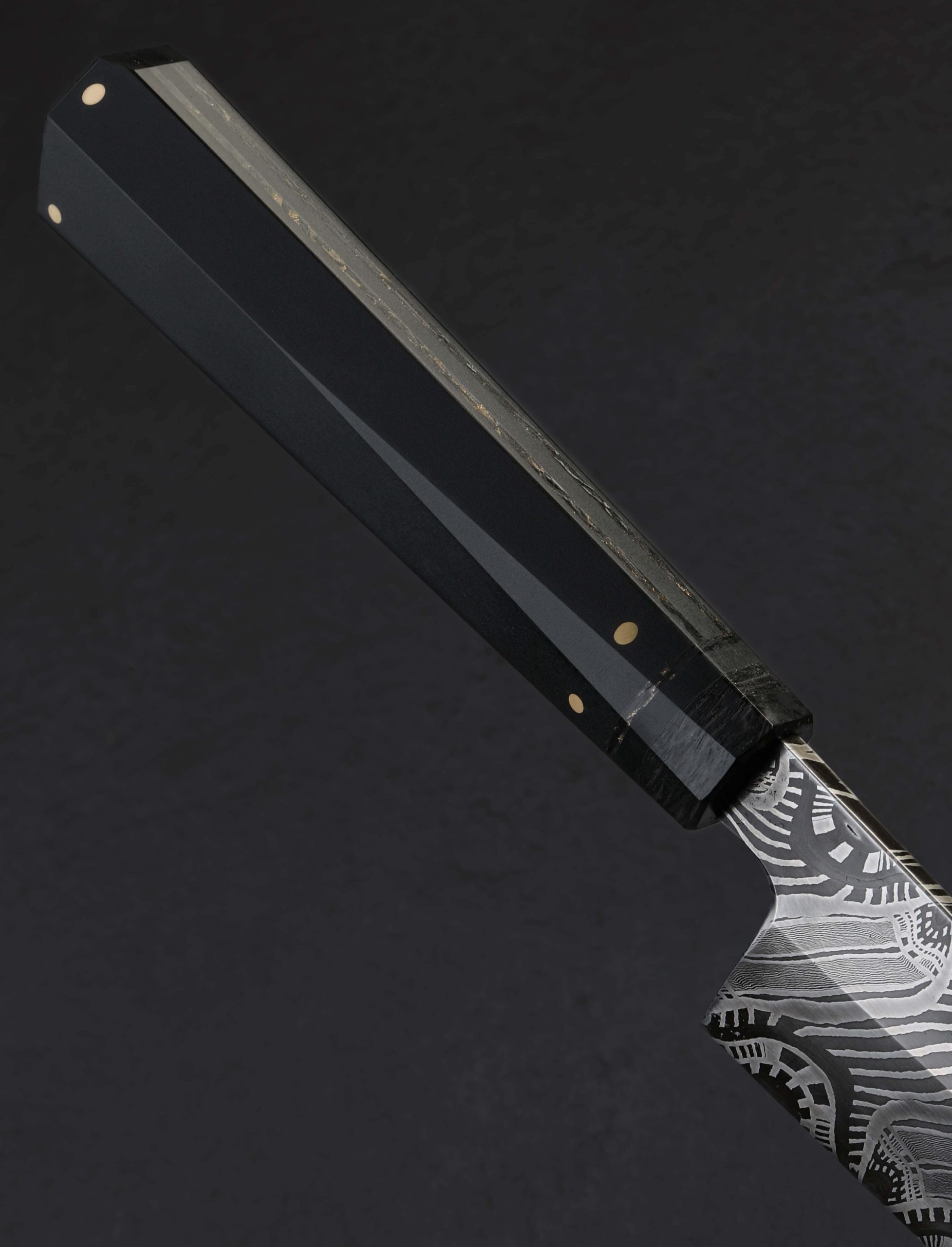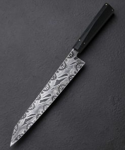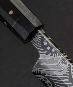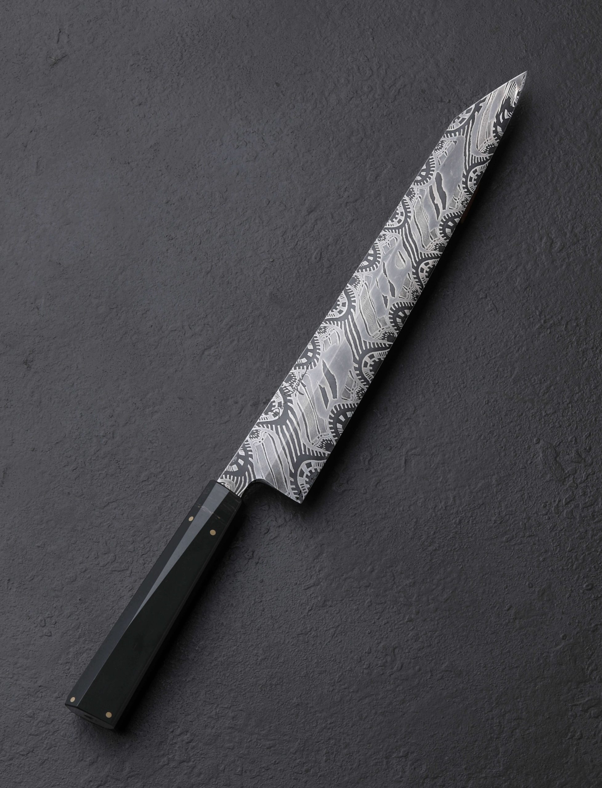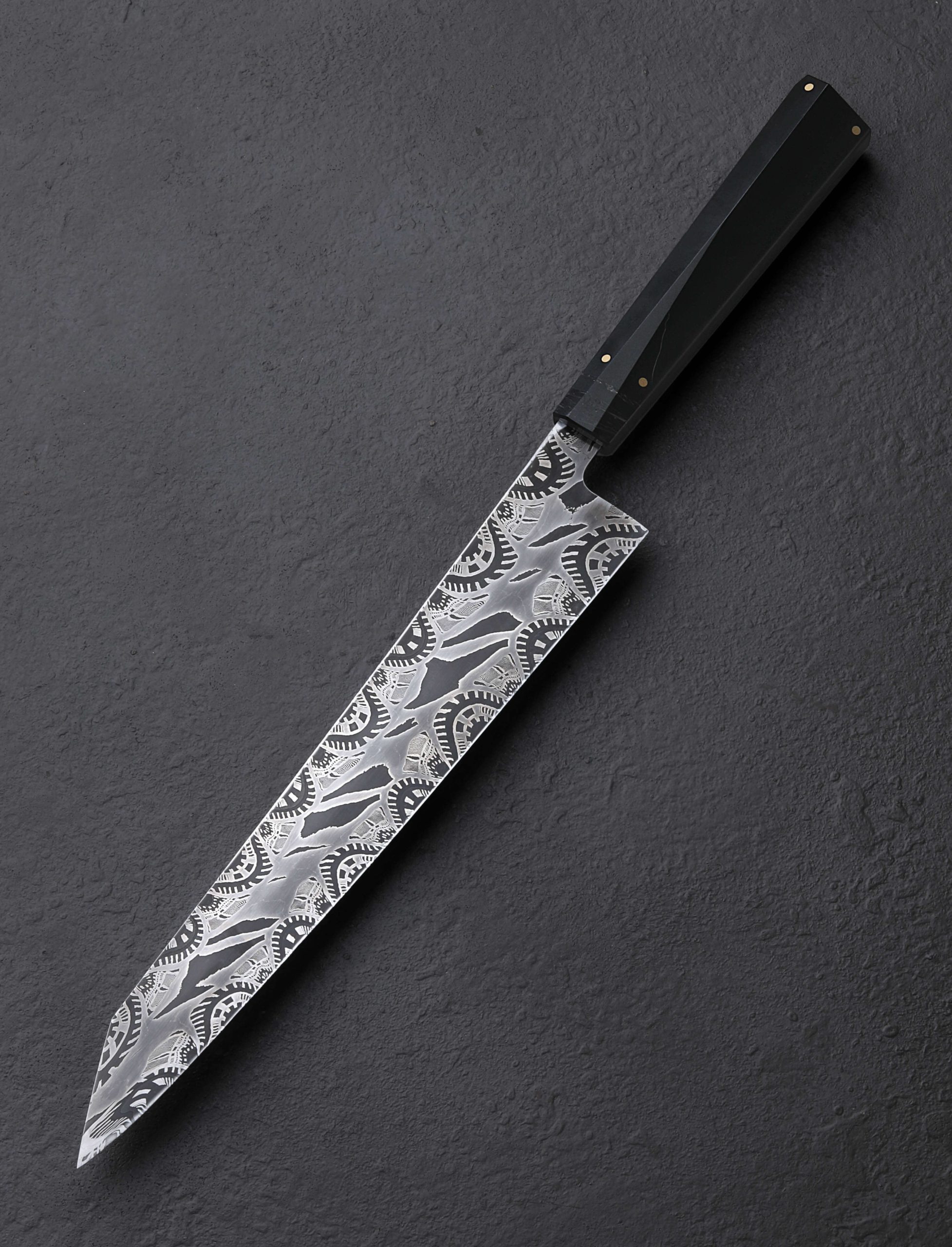 This extraordinary object of culinary might is the result of a collaboration between bladesmith and artisan Don Nguyen, maker of the finished piece, and Jason Morrissey, renowned mosaic damascus artist and creator of the blade’s steel. Jason has spent over two decades crafting and teaching metalsmithing and glass blowing, and it is the latter with which he credits many of his head-turning damascus patterns. During his tenure teaching at the Maine College of Art, his work was published in at least 20 international books. So, when a talented bladesmith and culinary knifemaker like Arizona’s Don Nguyen ends up with a piece of Jason’s storied steel, no ordinary build will do. For this project, Don selects a form for which he holds a depth of experience, and great respect: the sushi chef’s yanagiba. This high precision, single-bevel tool requires the utmost care to create, and Don pulls no punches as he designs and crafts the one-of-a-kind knife seen here. The 228mm / 9″ blade delivers a primary bevel on the right face with concave ura on the left face, the configuration required of a right-handed chef. Meticulously honed and highly refined at every point, from the razor-sharp, near zero edge, to the paper-thin, needle-like tip, the blade is designed for a singular purpose: slicing of the most coveted ingredients with the least disturbance to their cellular structure. And all in a size suited to both the home butcher block, where space can be limited, and the chef’s omakase kitchen alike. For unwavering control over the artful blade is a handle equally as handsome. Black paper micarta, carbon fiber, and shredded carbon fiber infused with brass, come together to form a faceted, shield-style wa handle, secured by flush brass pins, and completed at the rear with a stainless retention bolt screw that allows for the handle’s removal in the case the care or maintenance are needed. Comfortable, balanced, and natural in the hand, the feeling of the Perpetual Motion Yanagiba will not be soon forgotten.