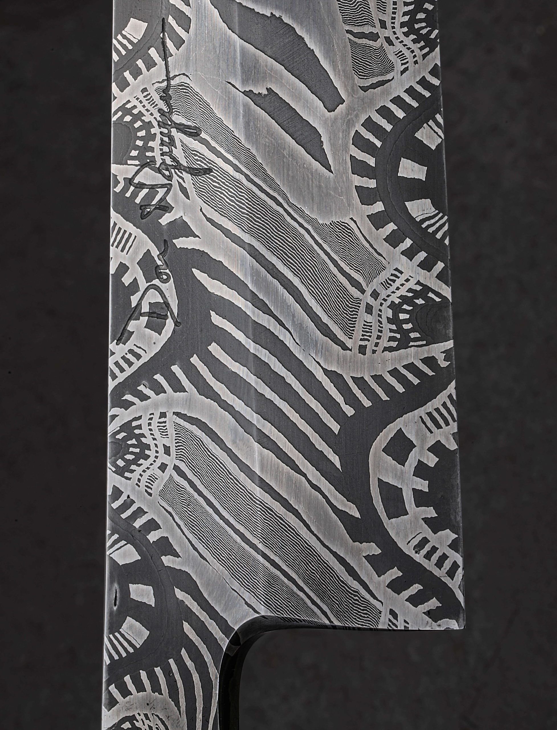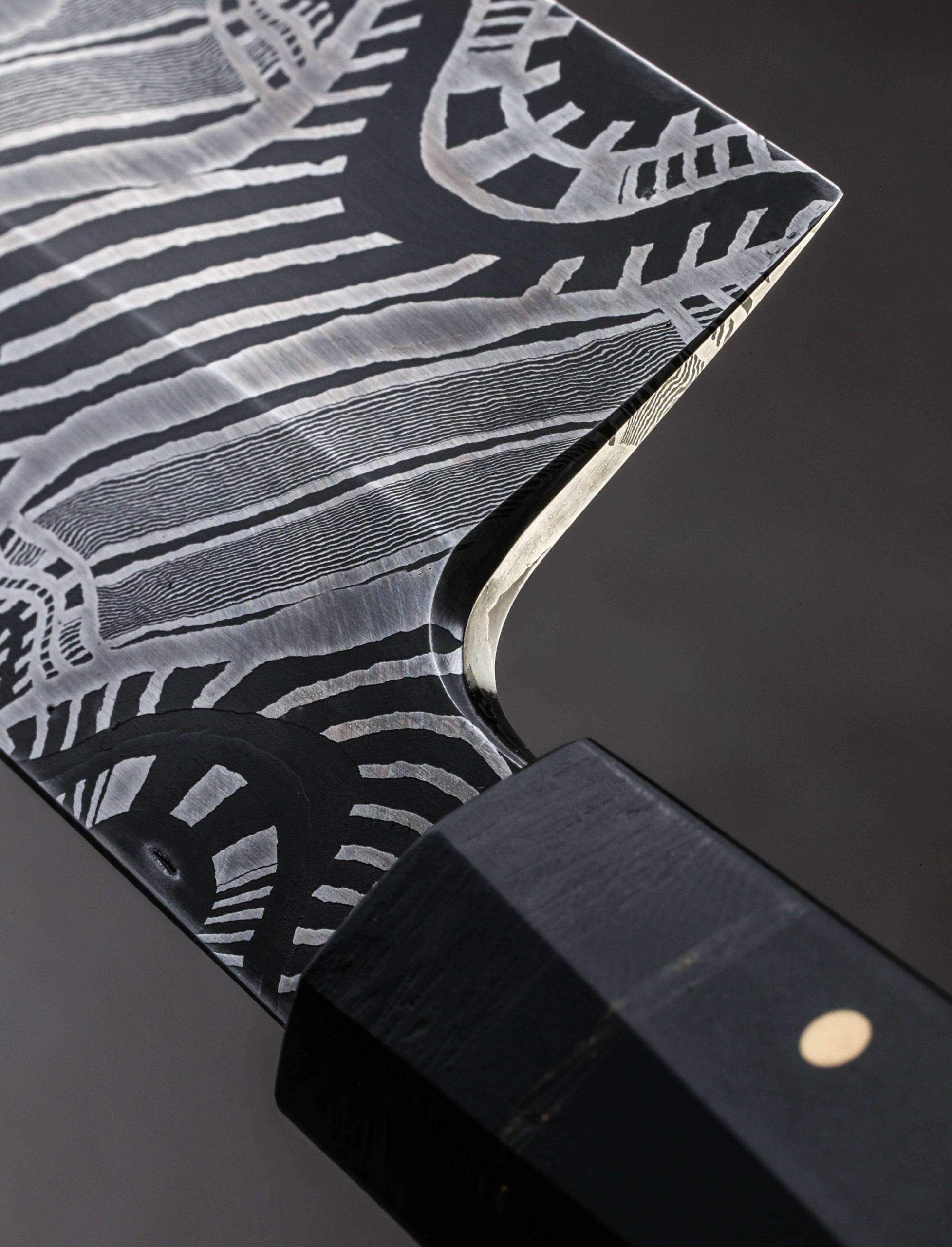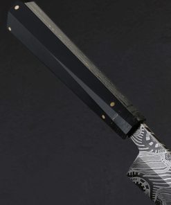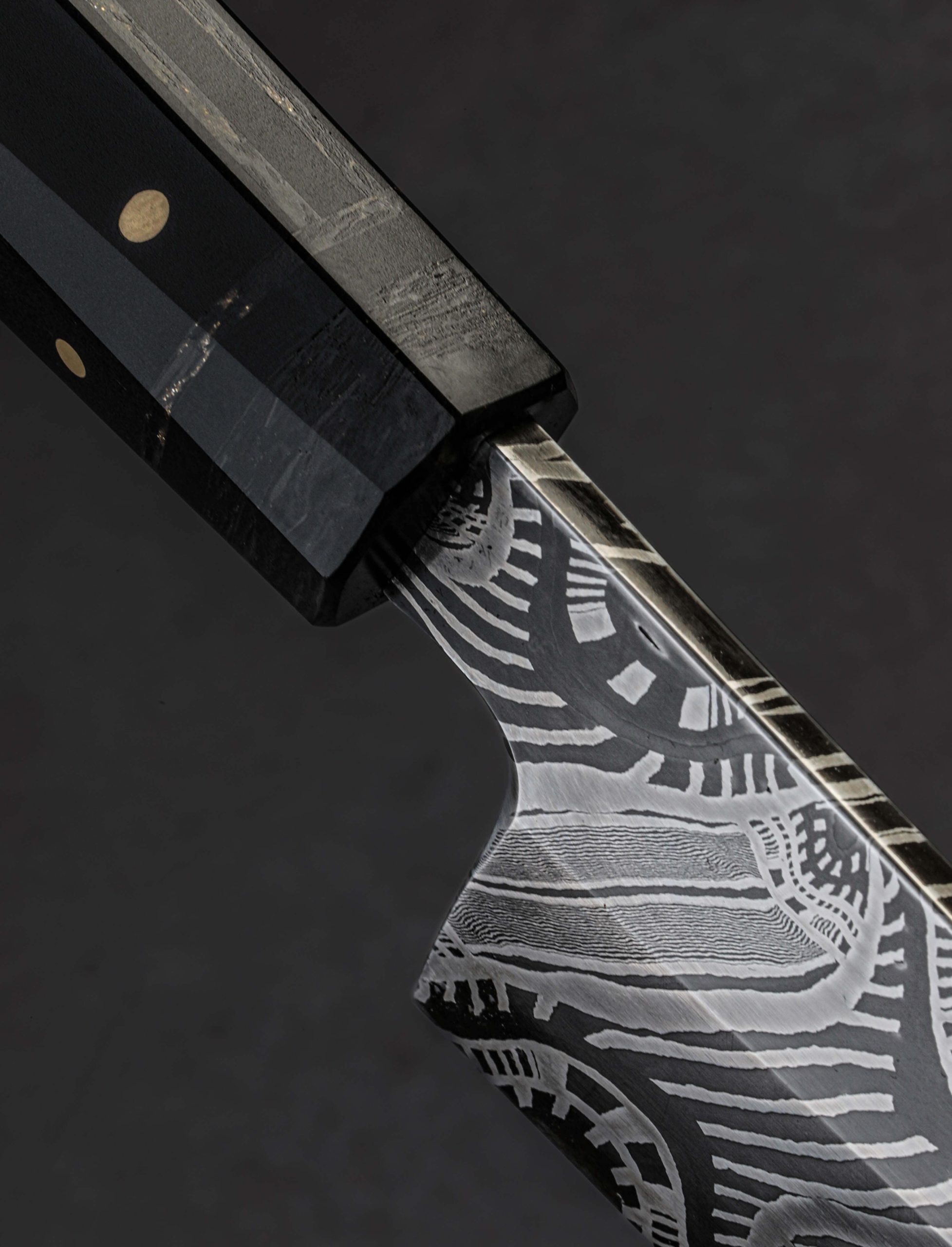 This extraordinary object of culinary might is the result of a collaboration between bladesmith and artisan Don Nguyen, maker of the finished piece, and Jason Morrissey, renowned mosaic damascus artist and creator of the blade’s steel. Jason has spent over two decades crafting and teaching metalsmithing and glass blowing, and it is the latter with which he credits many of his head-turning damascus patterns. During his tenure teaching at the Maine College of Art, his work was published in at least 20 international books. So, when a talented bladesmith and culinary knifemaker like Arizona’s Don Nguyen ends up with a piece of Jason’s storied steel, no ordinary build will do. For this project, Don selects a form for which he holds a depth of experience, and great respect: the sushi chef’s yanagiba. This high precision, single-bevel tool requires the utmost care to create, and Don pulls no punches as he designs and crafts the one-of-a-kind knife seen here. The 228mm / 9″ blade delivers a primary bevel on the right face with concave ura on the left face, the configuration required of a right-handed chef. Meticulously honed and highly refined at every point, from the razor-sharp, near zero edge, to the paper-thin, needle-like tip, the blade is designed for a singular purpose: slicing of the most coveted ingredients with the least disturbance to their cellular structure. And all in a size suited to both the home butcher block, where space can be limited, and the chef’s omakase kitchen alike. For unwavering control over the artful blade is a handle equally as handsome. Black paper micarta, carbon fiber, and shredded carbon fiber infused with brass, come together to form a faceted, shield-style wa handle, secured by flush brass pins, and completed at the rear with a stainless retention bolt screw that allows for the handle’s removal in the case the care or maintenance are needed. Comfortable, balanced, and natural in the hand, the feeling of the Perpetual Motion Yanagiba will not be soon forgotten.