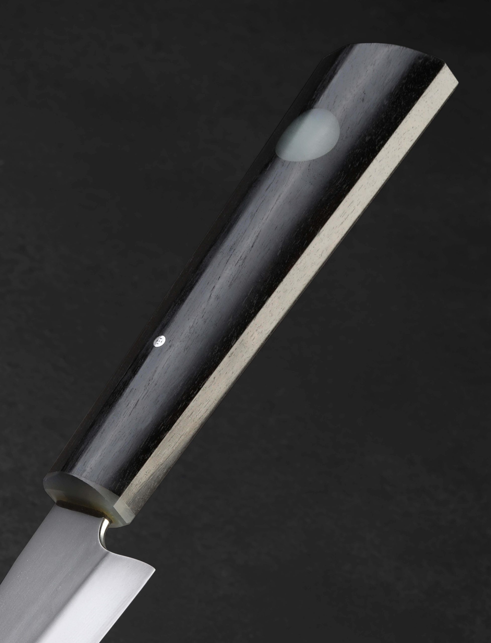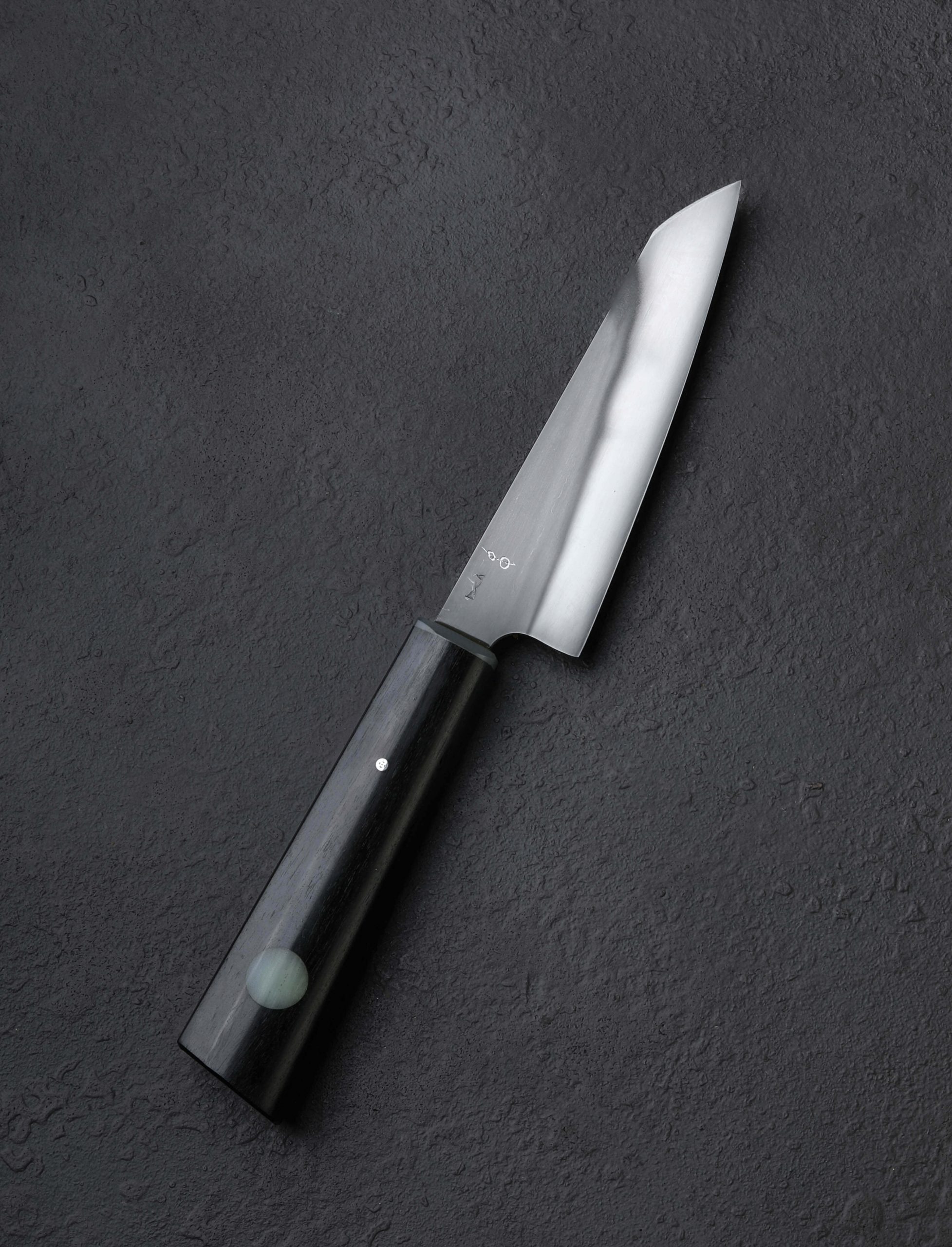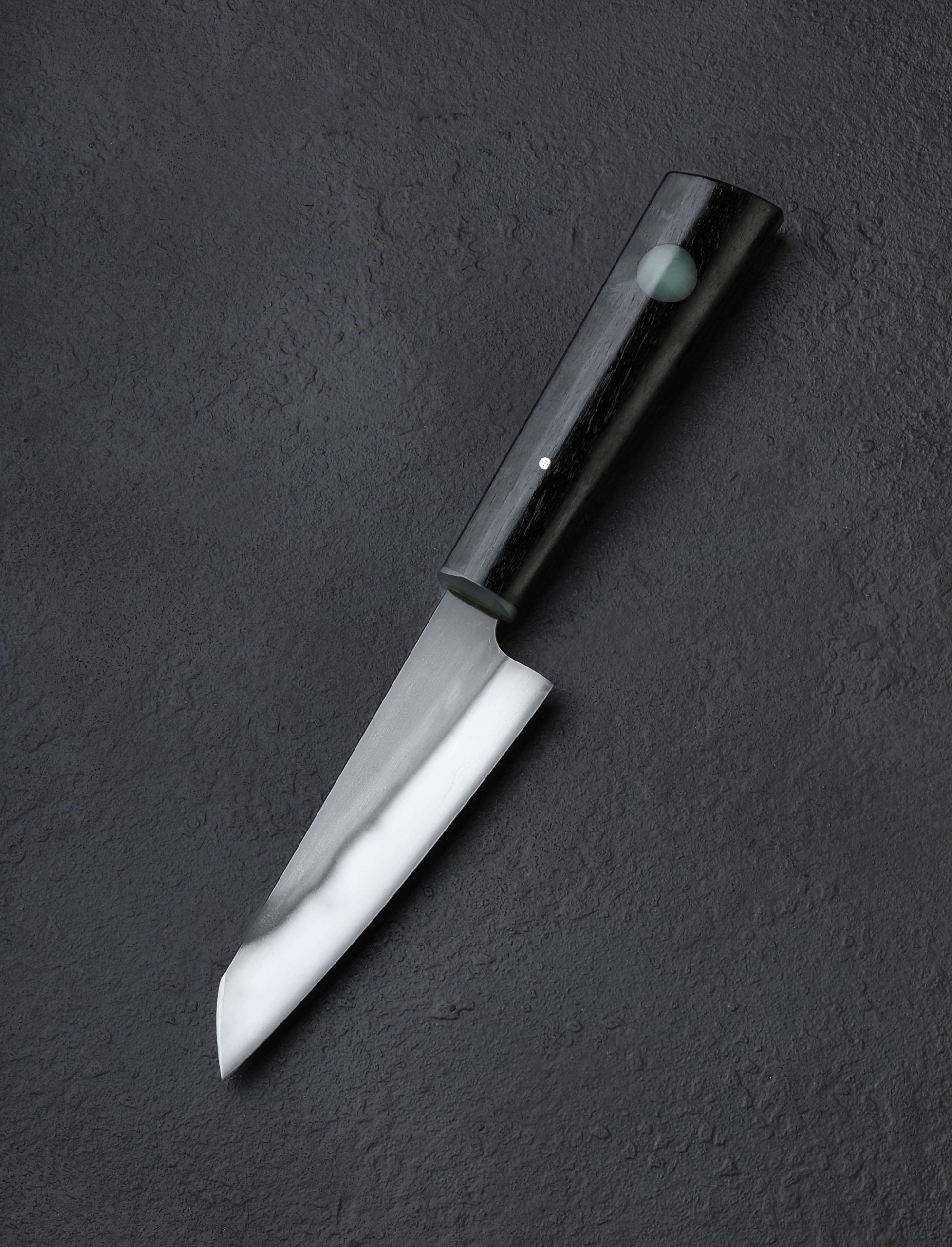 Petit in form compared with the average gyuto, this one-of-a-kind creation by artist Don Carlos Andrade is big on performance, toughness, and character. For the incredibly handy and versatile blade profile, Don selects 1065 carbon steel which he forges to shape by hand at his California studio. A formally trained chef and bladesmith of nearly two decades, Don employs this lesser known, medium-to-high carbon tool steel due to the fact that most culinary knives for much of the last couple of centuries would have been made out of similar steels, known for their durability, strength, and ability to take a sharp, hard-working edge. Prized for its use in traditional Japanese katanas, 1065 is ideal for blades requiring a sharp edge and resilience. From light butchery and breaking work with its pointed, triangular tip, to parting and slicing the hardest and densest ingredients, this 135mm / 5.3″ blade is designed as a workhorse of home or professional kitchens alike. As expected of Don’s work in any steel, the pronounced convex bevels receive a stunning, hand-sanded satin polish and etch that reveal the hamon line of Don’s differential hardening and careful quench. To control the razor-sharp edge is a handle in Don’s recognizable style, sculpting handsome African Blackwood into his shield-style wa handle rendition and finishing it with his trademark round inlay of translucent green G10, a matching ferrule, and a single mosaic pin. An heirloom chef’s knife handmade for generations of cooks.