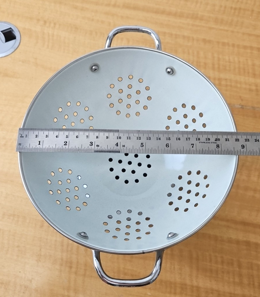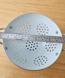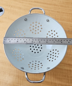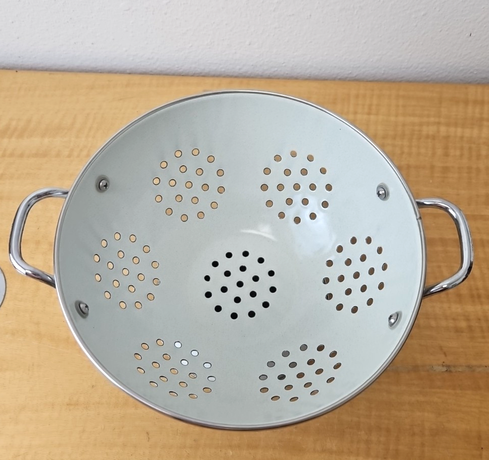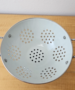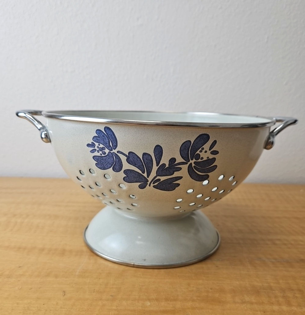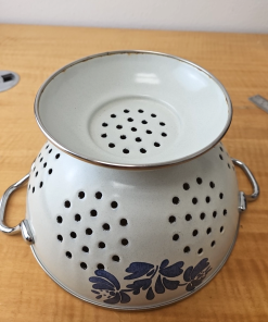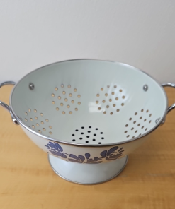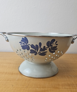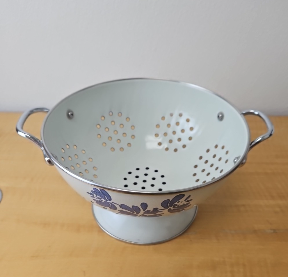 Pfaltzgraff “Yorktowne” Enamelware footed colander White and Blue 8 1/2″