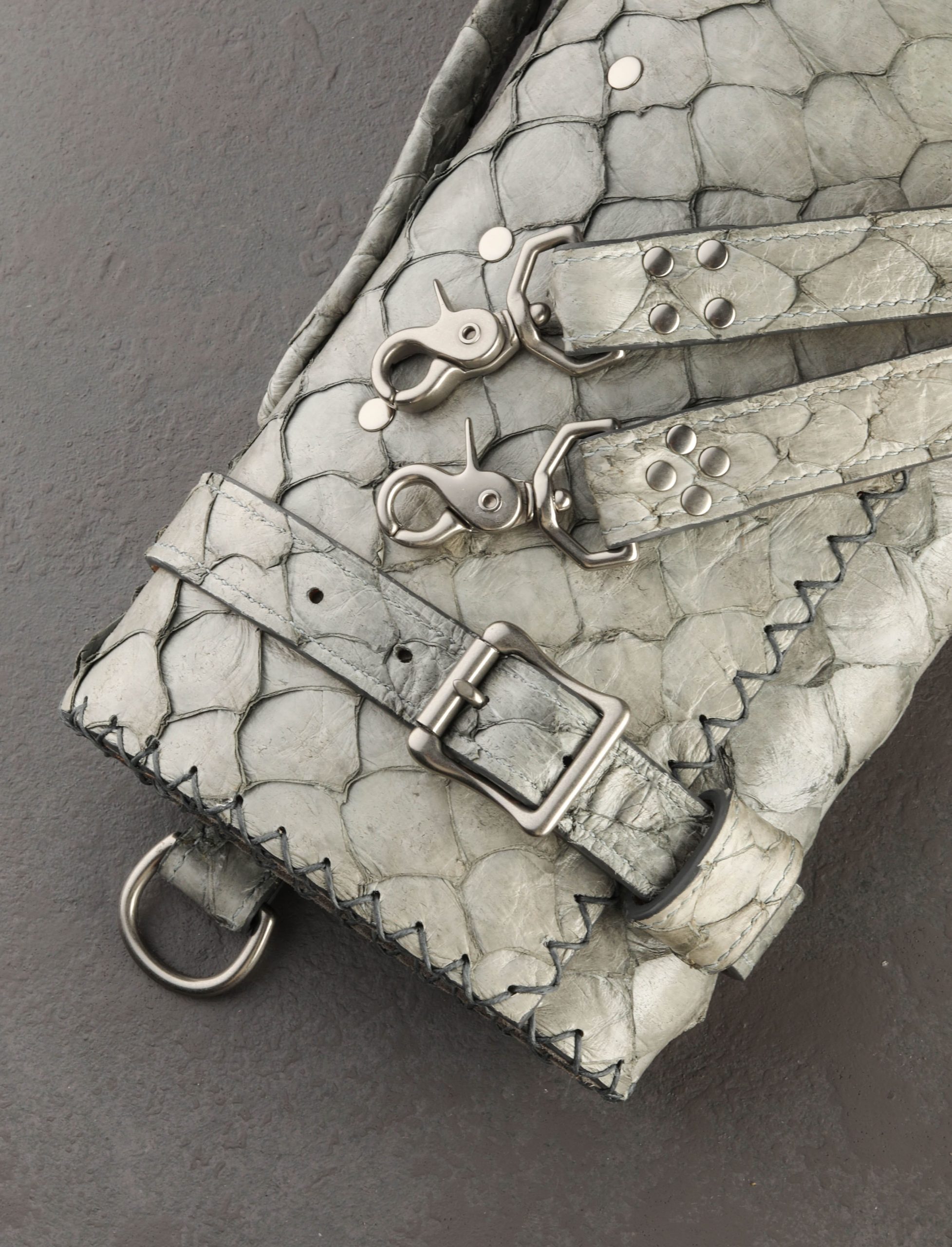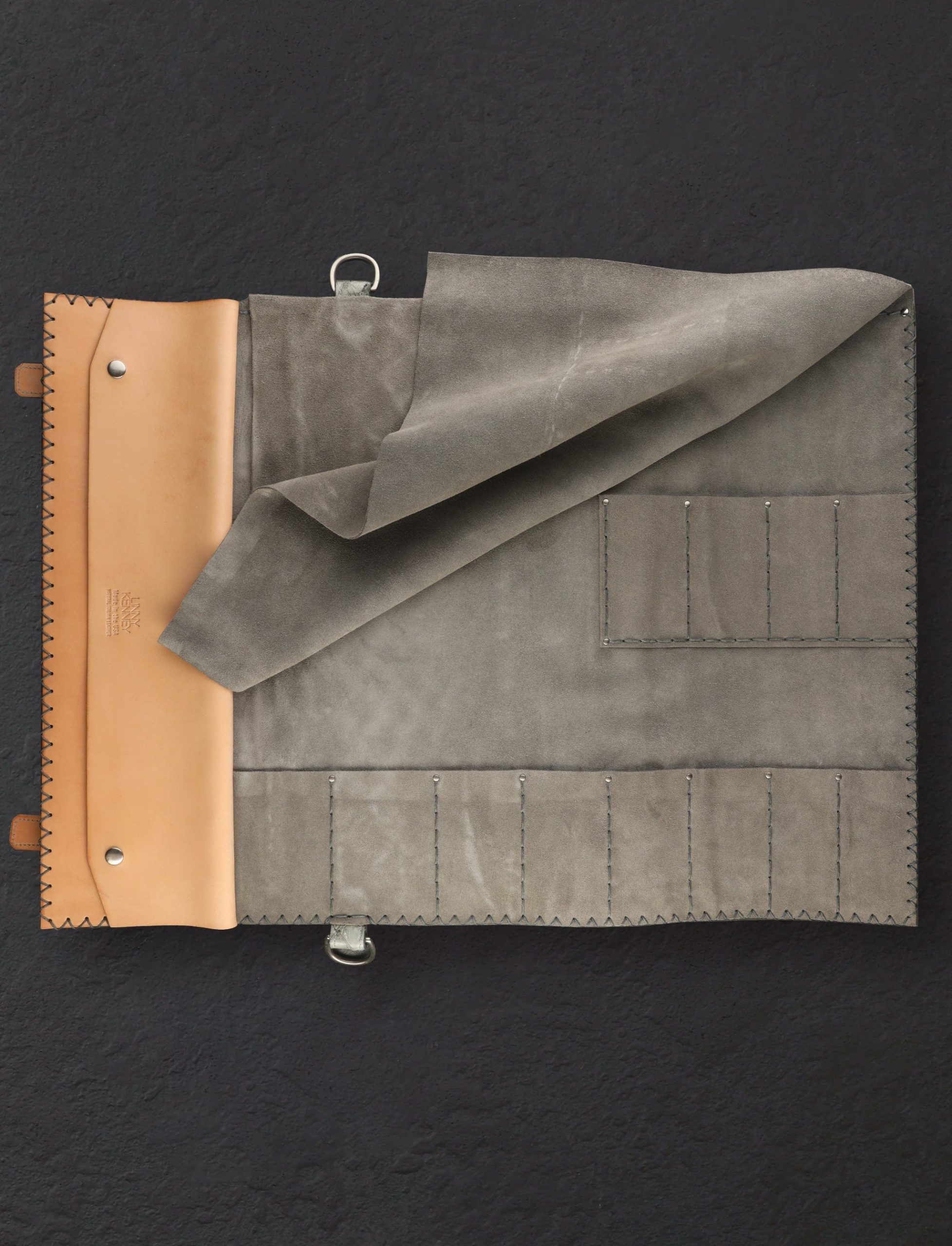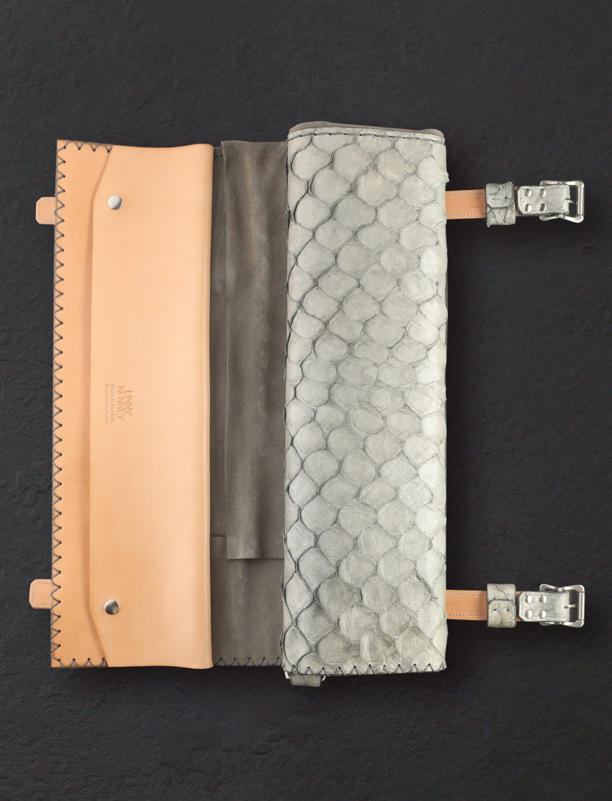 The picture of luxurious transport for your most coveted chef’s tools. Stitched by hand using waxed Irish linen thread, the Pirarucu Knife Roll is crafted from one of the only sustainable exotic fish leathers in the world. At her studio in northern New Hampshire, artist Linny Kenney combines the leather of the pirarucu fish, sourced from small fishing towns in Brazil supported by the sustainable harvesting of the species, placing it atop free-range Italian beef leather, with interior of bio-suede from Portugal. The hardware and clasps are made from nickel-plated solid brass. The roll carries 12 knives and has a 5″ X 18″ interior pocket on one end. There are two 3” pockets for extra fat handles, four 2.5” pockets and two 2” pockets along the bottom row. The top row has two 2.5” pockets and two 2” pockets. The roll measures 25.5″ X 18″ when fully opened.