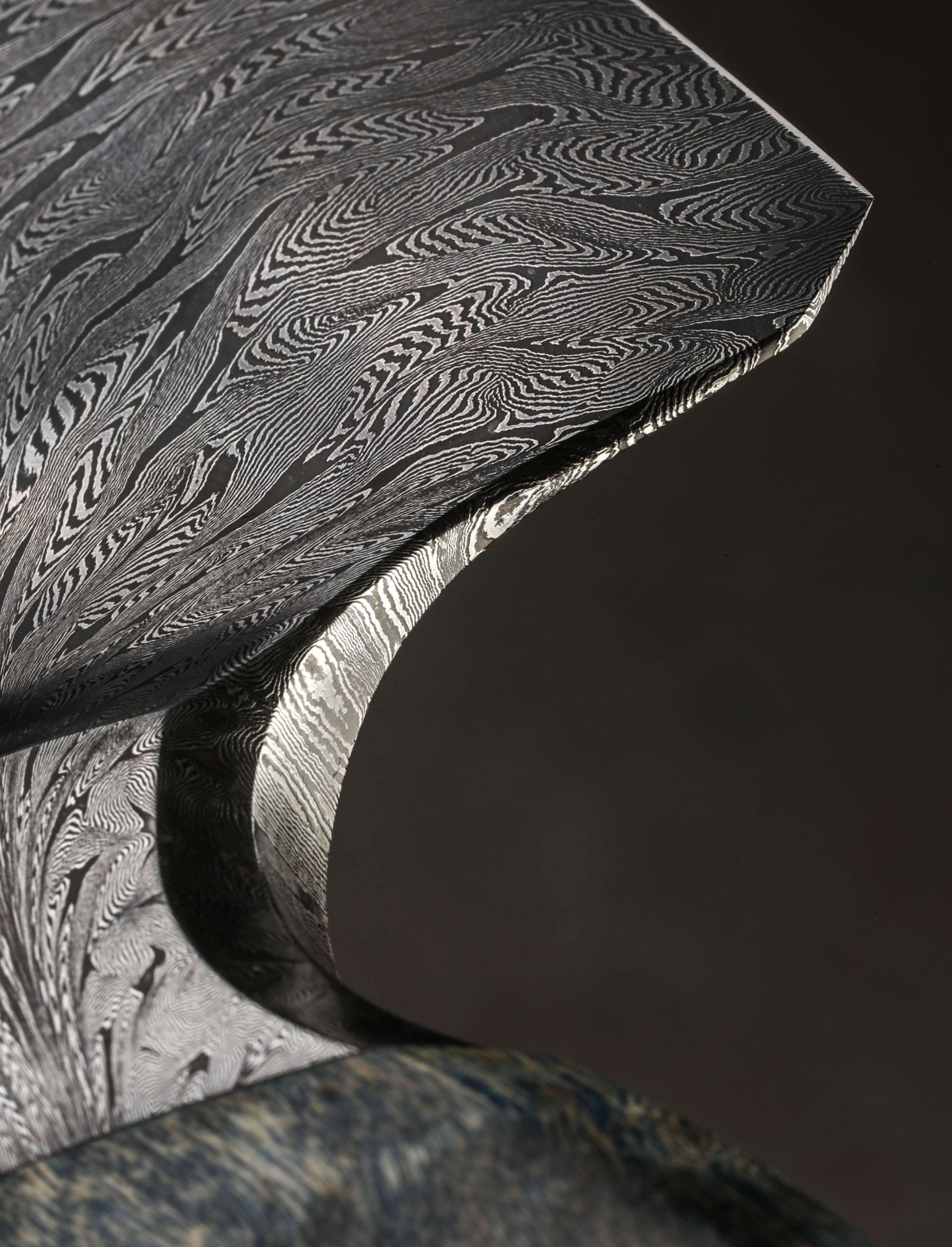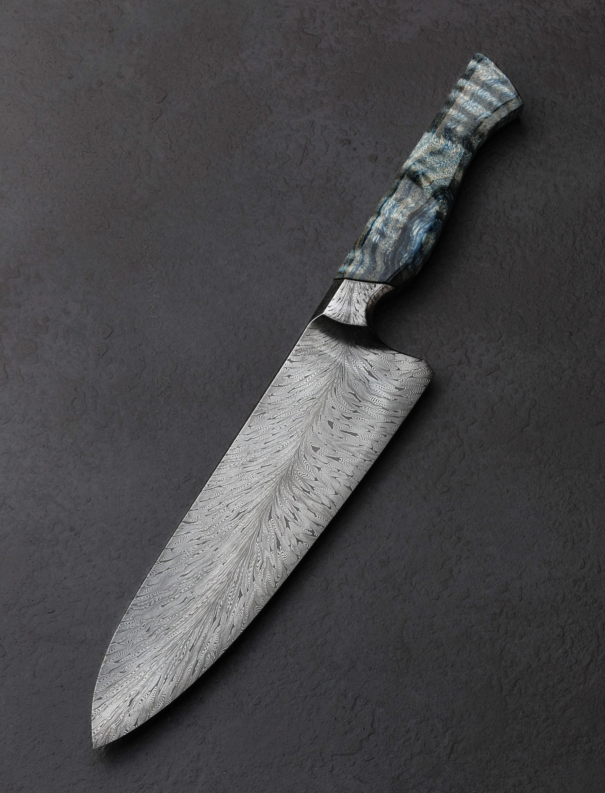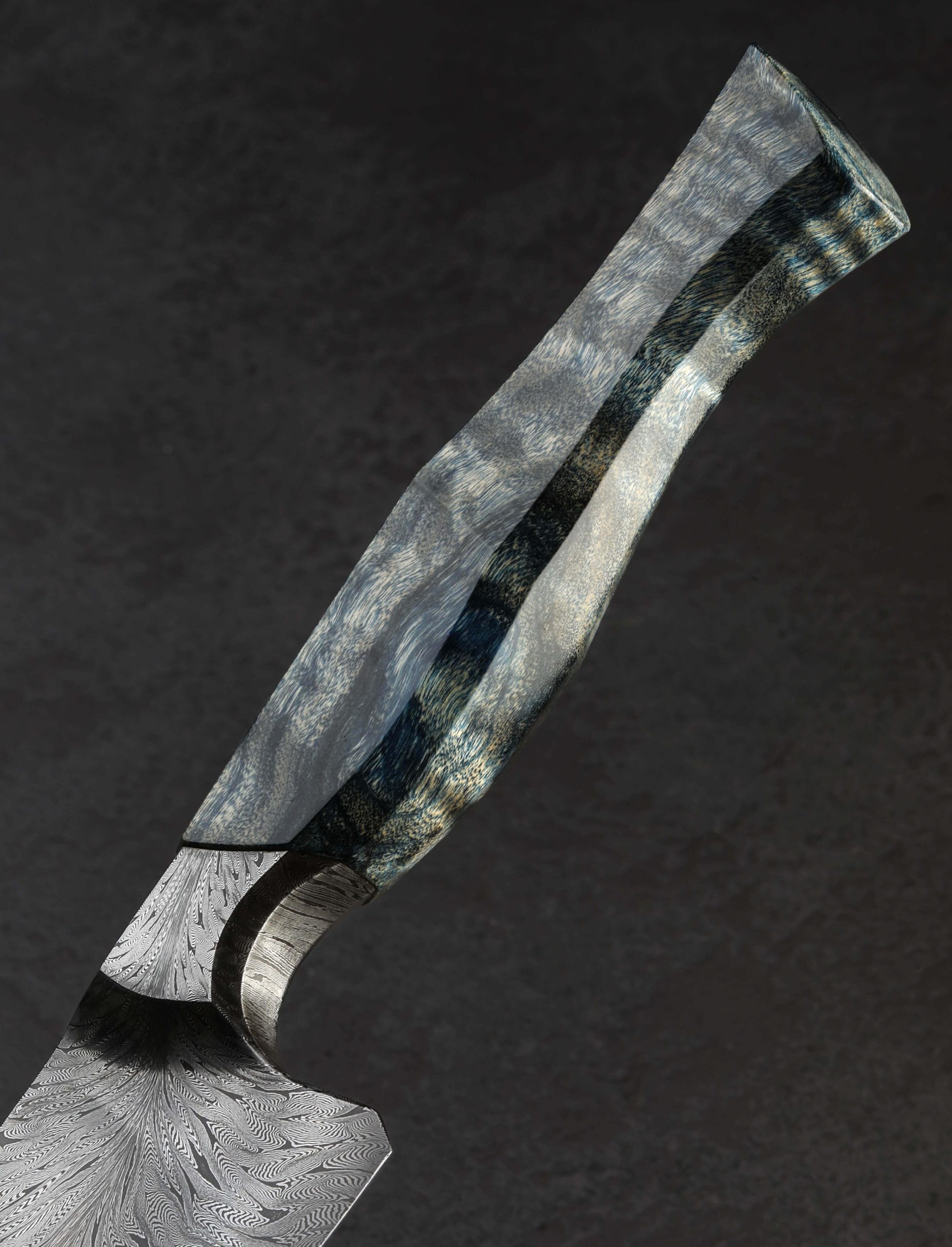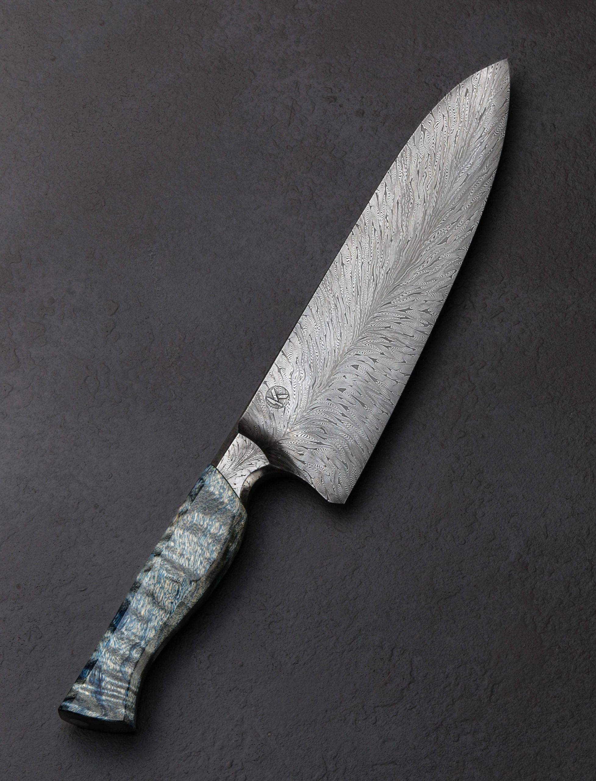 The third knife from artist Jeroen Knippenberg’s inaugural delivery is every bit as extraordinary as the first two, this time featuring a sculpted Western style handle in stunning poplar wood that shines with a chatoyance and depth of character we cannot look away from. In his versatile, workhorse profile, the blade of this one-of-a-kind tool is forged by hand from Jeroen’s own house-made carbon damascus in which a dense and intricate pattern is feathered lengthwise to produce the captivating effect witnessed in its finished, etched, and polished from. Without careful and thoughtful shaping for performance, though, the damascus is only a piece of steel. In this case, of the knife’s efficacy, there is no doubt: Jeroen’s compound ‘S-grind’ bevel geometry is superb, playing beautifully in tandem with his faceted blade spine’s full distal taper to produce a versatile, hard-working, and balanced cutting tool. Thin and especially sharp at the edge, the compound stretch of the primary bevels just above marries finesse with toughness, ensuring the densest vegetables and most tender proteins are each treated with the respect they deserve. The concave portion assists with food release and overall balance. Toward the tip the material slims to a needle-like culmination, thin and precise for detailed slicing work. For comfort and control, the handle begins the same as the blade, with feathered damascus forged into a striking, artful shape. With stepped, heirloom fit-up the metallic bolster, in which the material’s visual pattern condenses even further, meets the dyed and stabilized poplar wood. At the handle’s rear face is the cap of the mechanical construction’s retention bolt. A luxurious tool built for the rigors of daily meal prep.