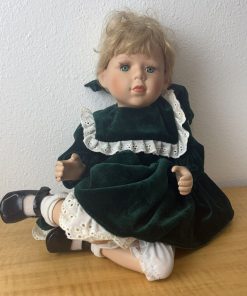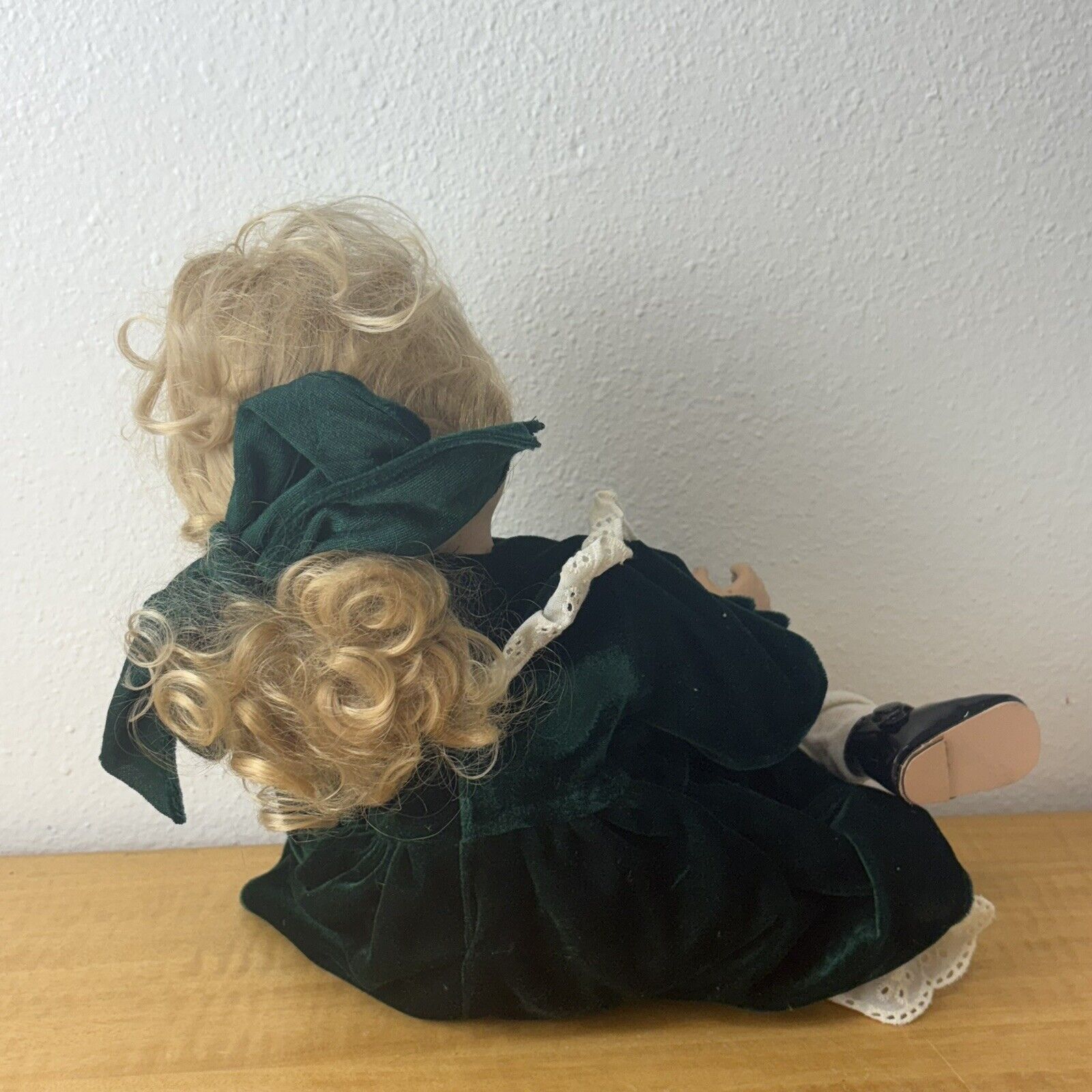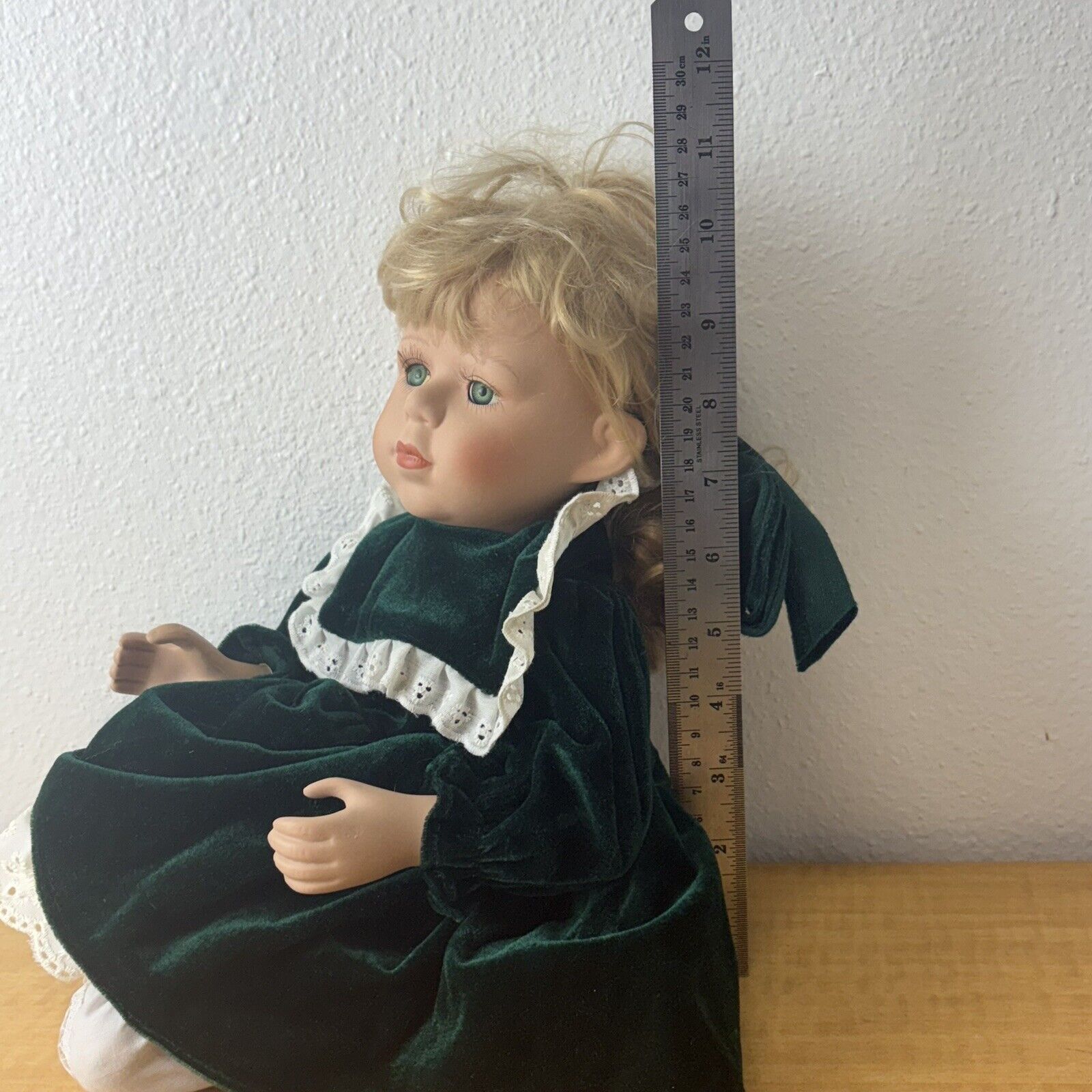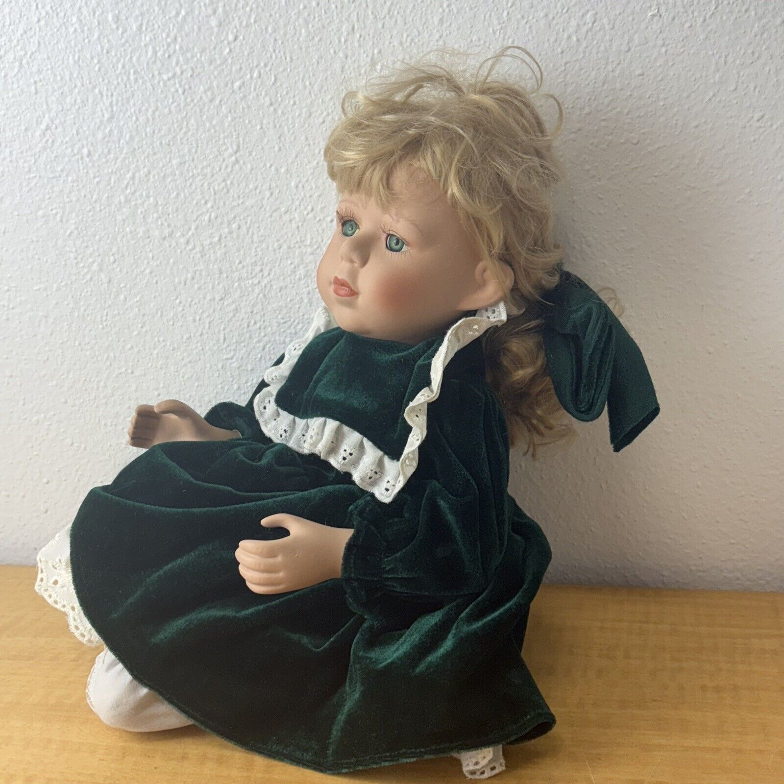 Porcelain Doll Vintage Sitting Blonde Hair Green Velvet Dress