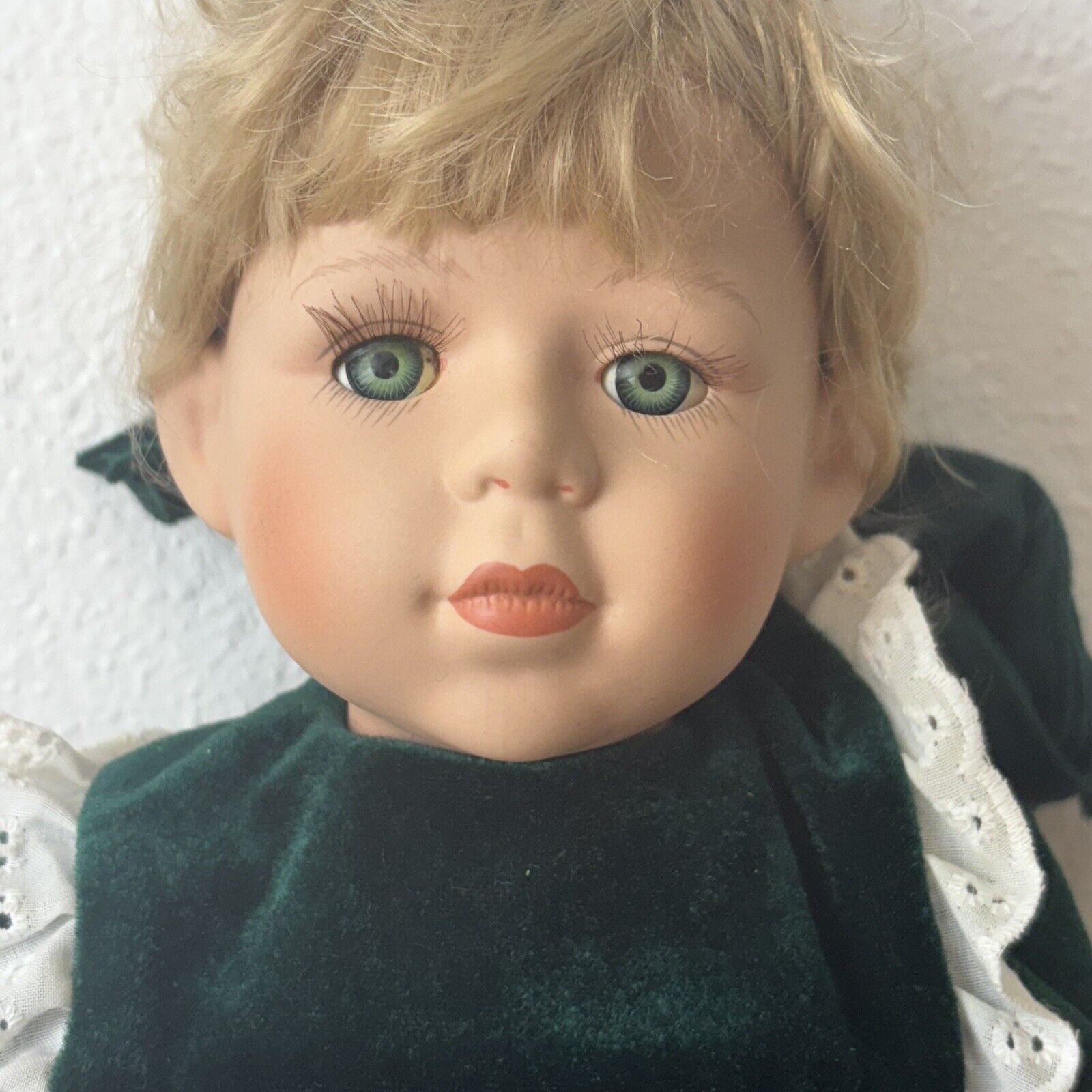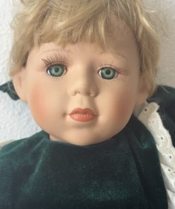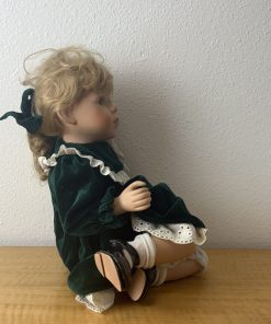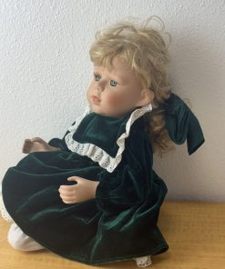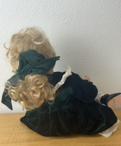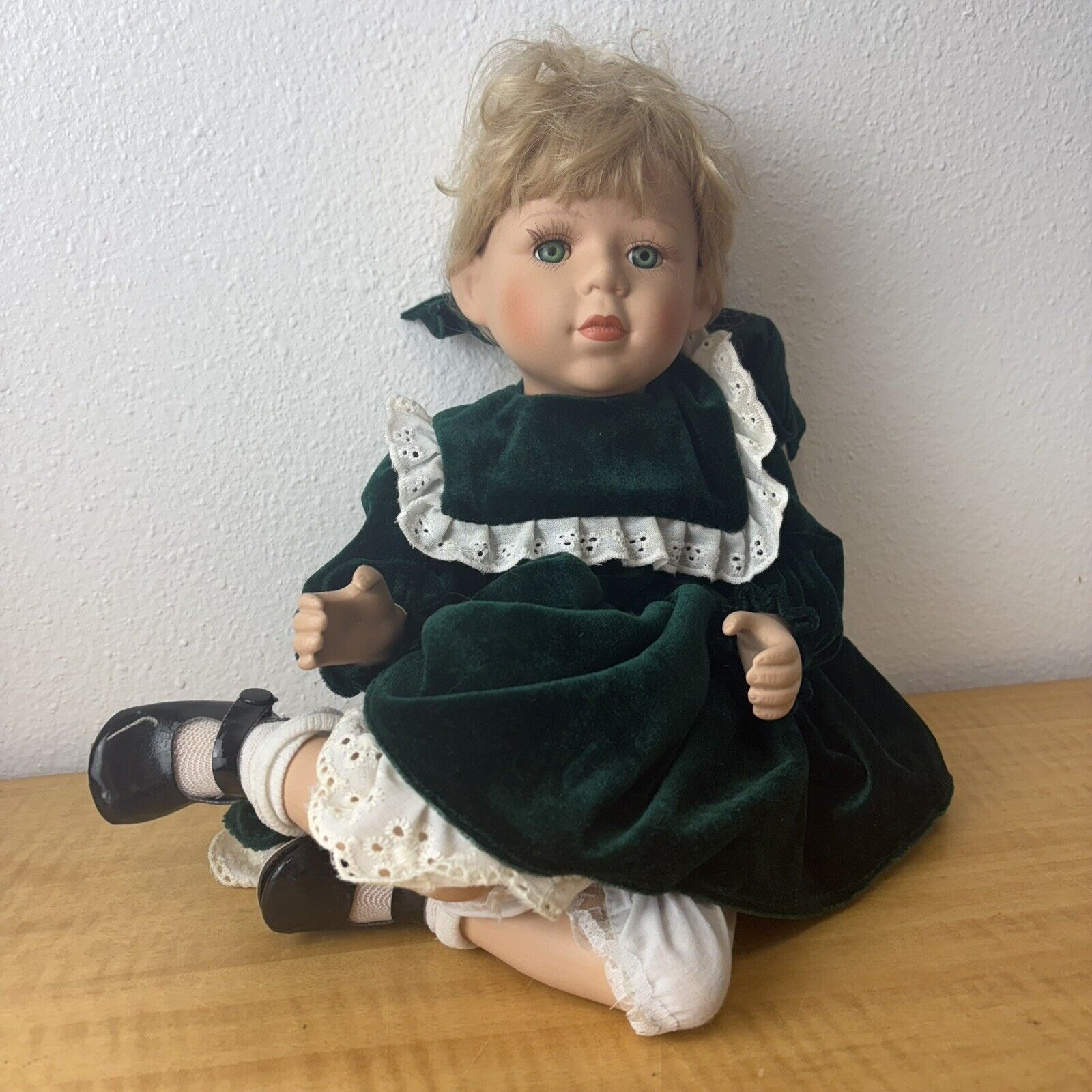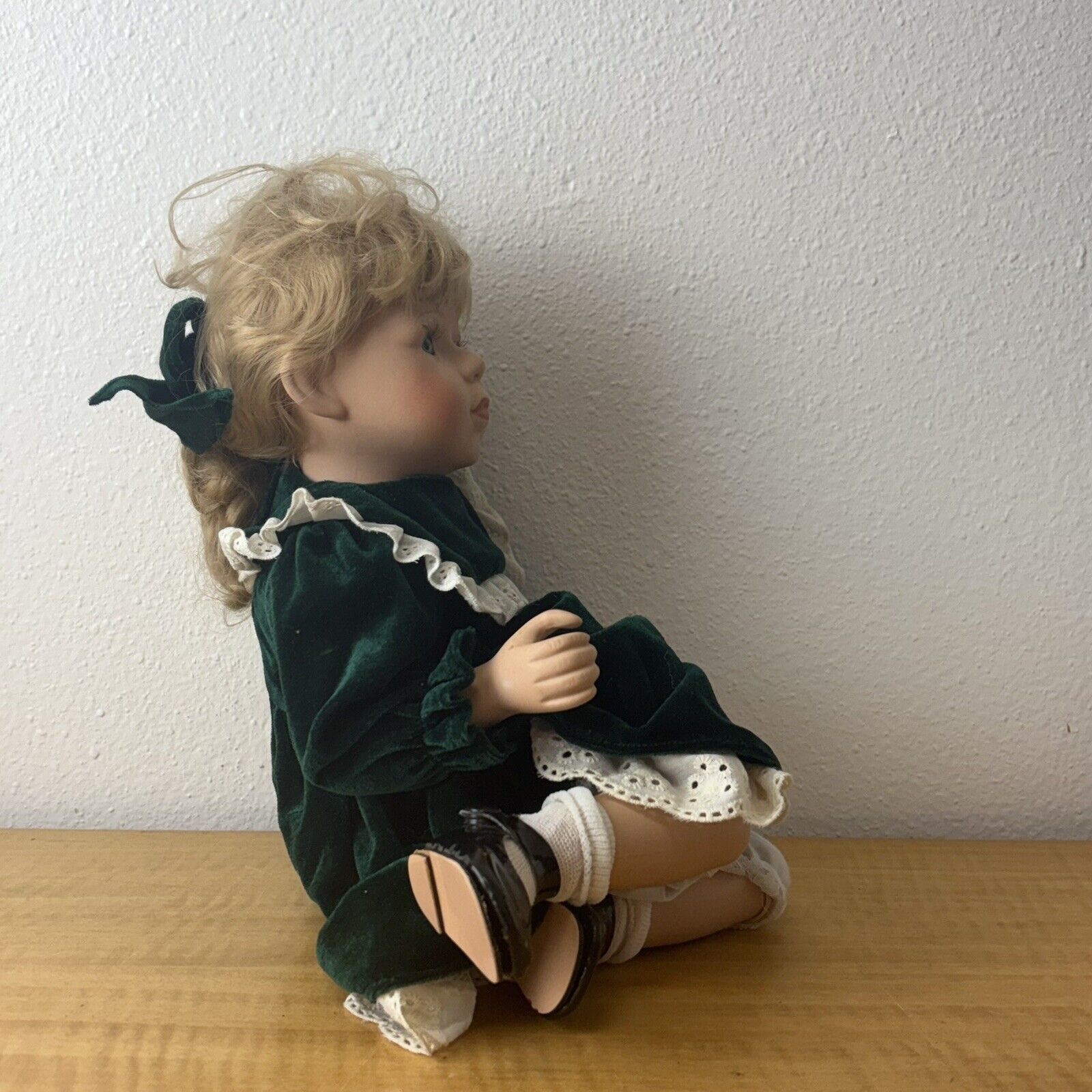Porcelain Doll Vintage Sitting Blonde Hair Green Velvet Dress