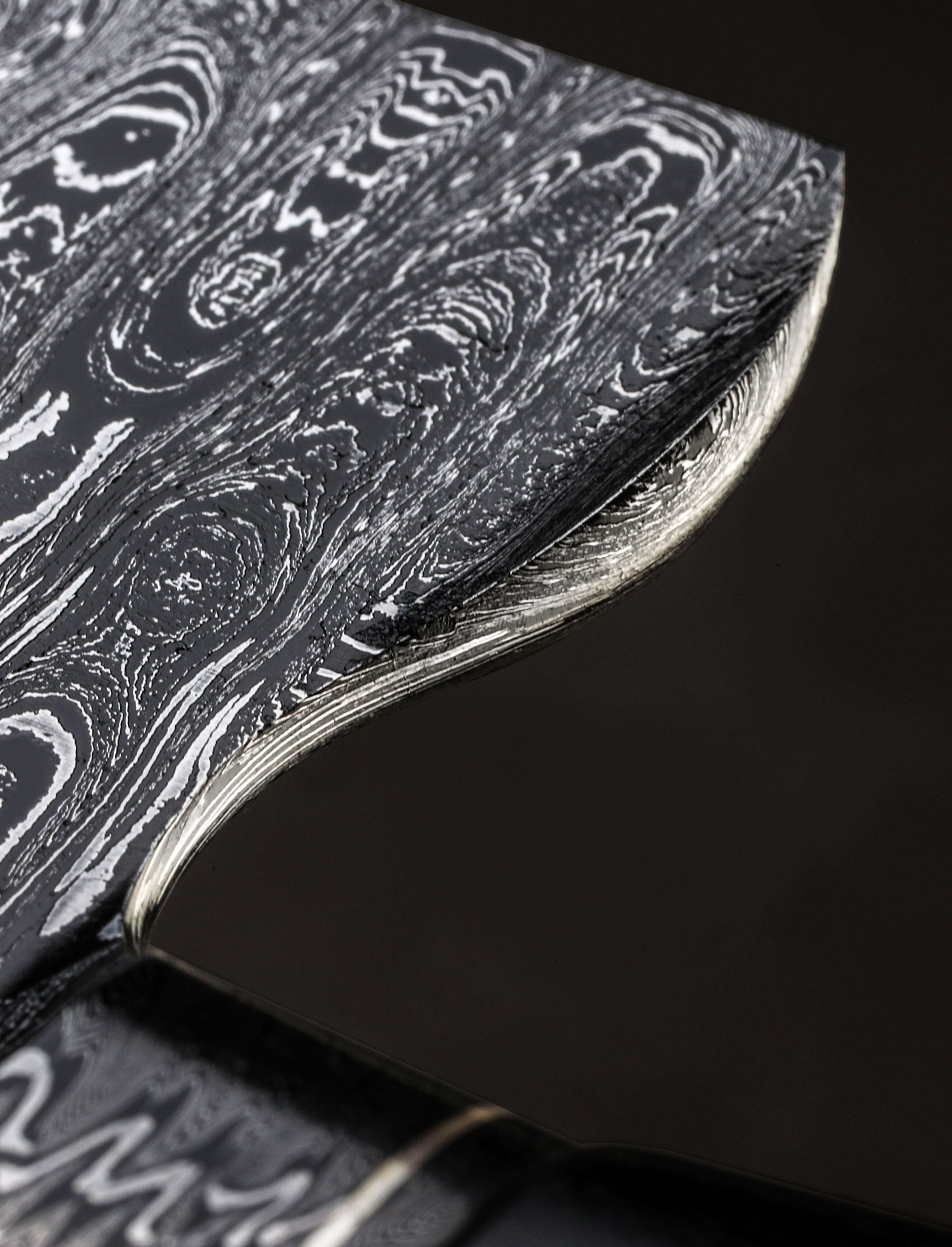 From the full-distal taper along the blade’s spine leading to a needle-like tip and the balanced amount of lateral flexibility it provides, to the integral bolster’s sculpted beauty and fine silver inlay, to the head-turning modified W’s pattern carbon damascus steel, this pre-owned, unused, like-new William Porto creation is as striking as it is functional. Every detail is accounted for: an heirloom fit transition where bolster meets ebony is complemented by a broad face at the curvature of the blade’s choil where the middle finger rests comfortably in the pinch grip, elements that complement each other visually, as well. Thin and hard at the edge below slightly convex bevels, the 253mm / 10″ blade stands 64mm tall at the heel, a long, straight section of the edge’s upswept, Western profile ideal for chopping, leaving the curved belly and fine tip perfect for slicing and detail work. Especially thin at the edge, this dynamic and versatile full-size chef knife is weighted and steady in the hand, its center of mass lying just in front of the bolster’s silver inlay, giving the blade a quick and nimble feel on the cutting board. Completing the gently sculpted, Western style handle is a dark, elegant piece of ebony carved into an exceedingly comfortable, voluptuous form that fills the hand to leave a lasting memory. Included is a custom made ostrich leather saya.