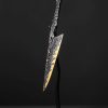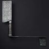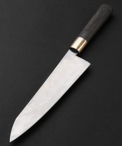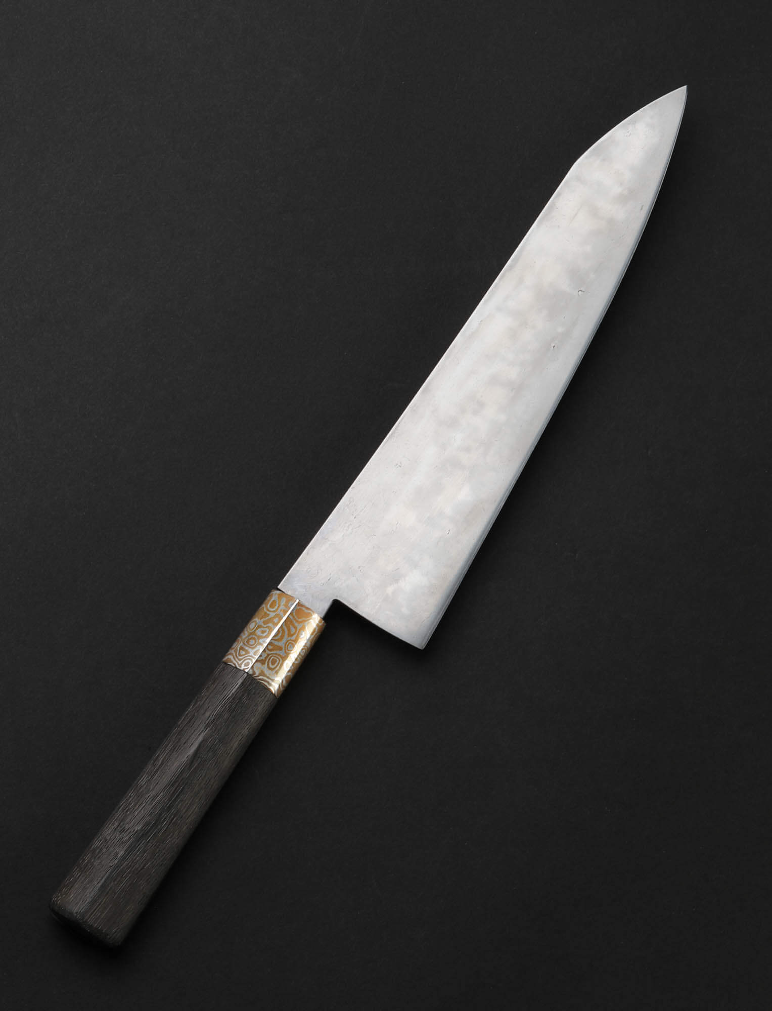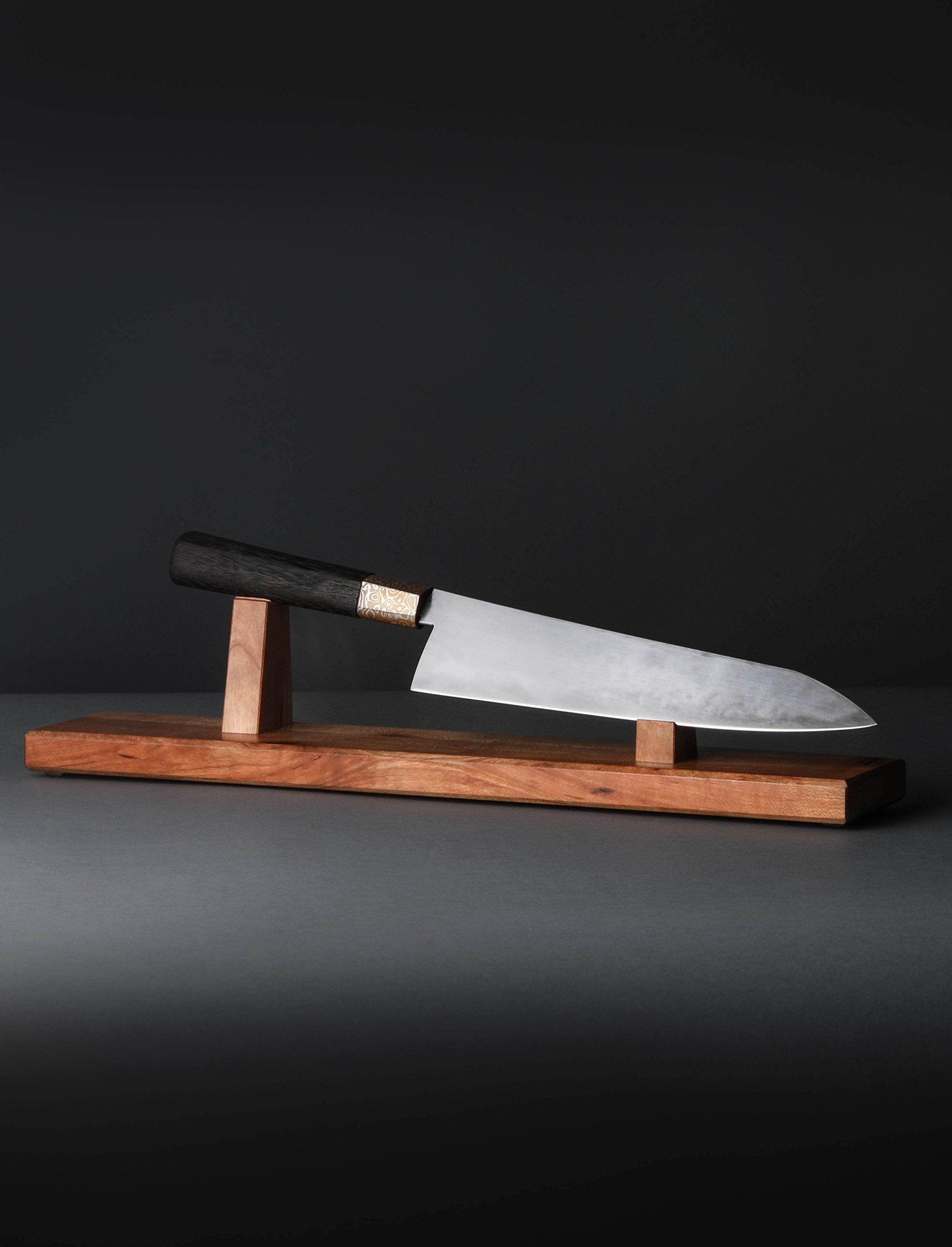 New Jersey artist Emiliano Carrillo’s contribution to The Art of Cutlery, a gyuto called “Precious Steel,” on show during summer 2024 in Tribeca, NYC, is named for the homemade tamahagane from which it is forged. This traditional approach to steel making, and in turn, this work of functional art, receive their moniker from two Japanese words: tama, meaning ‘precious’ and ‘hagane’ meaning steel. Emiliano, who has long studied traditional blacksmithing and tool-making techniques, first collects sand from a particular beach in Connecticut, isolating the raw iron ore using a magnet. He then fashions a one-time-use-only bloomery furnace from clay, mud, and peat to combine the iron with carbon under high heat to form raw steel. The raw steel, or bloom, is then forged and folded by hand repeatedly, forming the bar of steel which is then shaped into the finished blade. The D-shaped wa handle, configured for right-handed users, is sculpted from ancient bog oak and finished with a mokume gane bolster made from sterling silver and copper. A wooden display stand is included, as well as small amounts of both the iron ore sand and resulting raw bloom. This knife is razor-sharp and built to cook with.