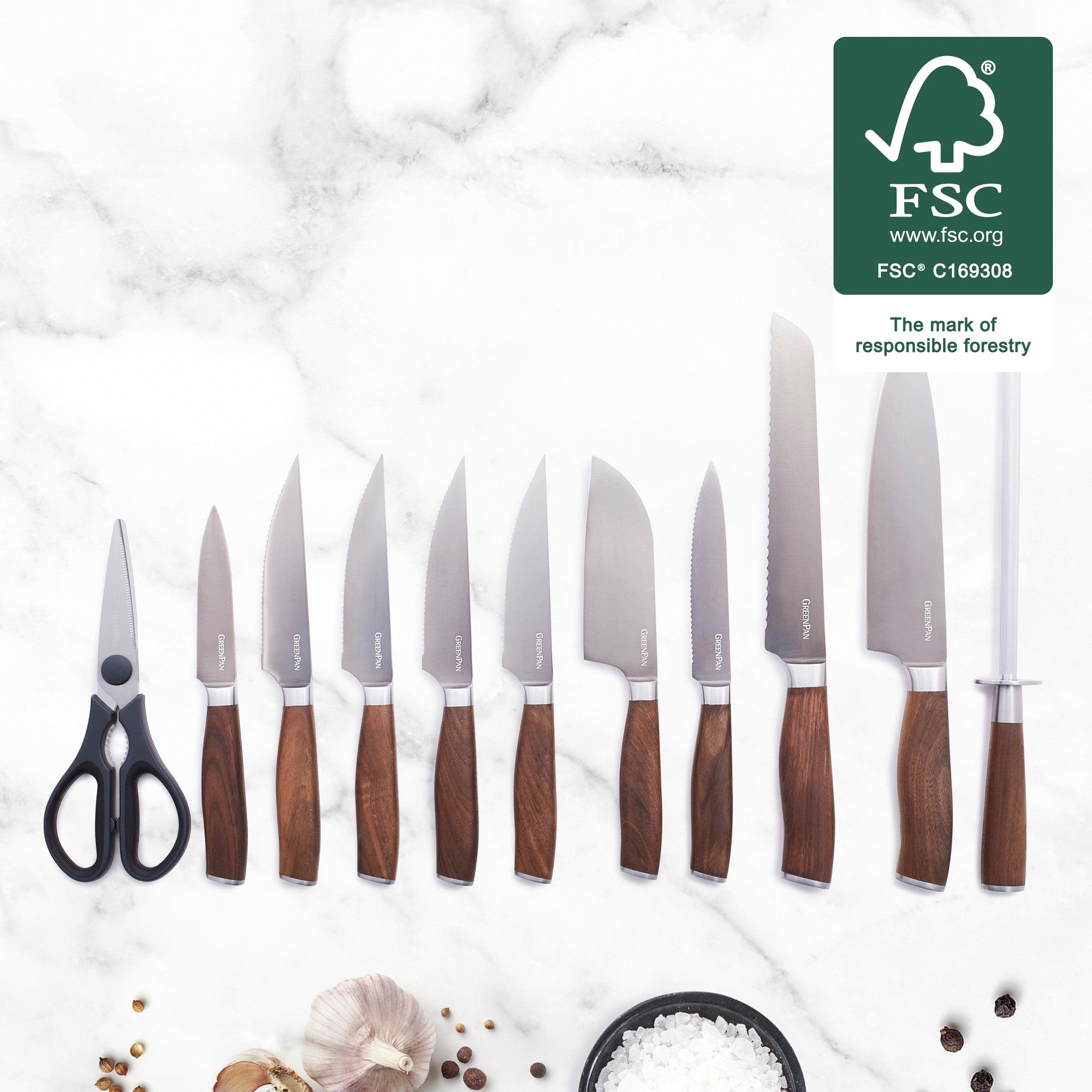 Crafted from recycled steel and eco-friendly walnut handles to minimize its environmental impact, each blade of this set is cryogenically treated to remove residual stresses, hand sharpened and coated with titanium for long-lasting performance.