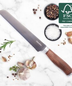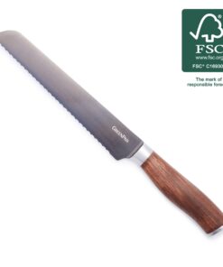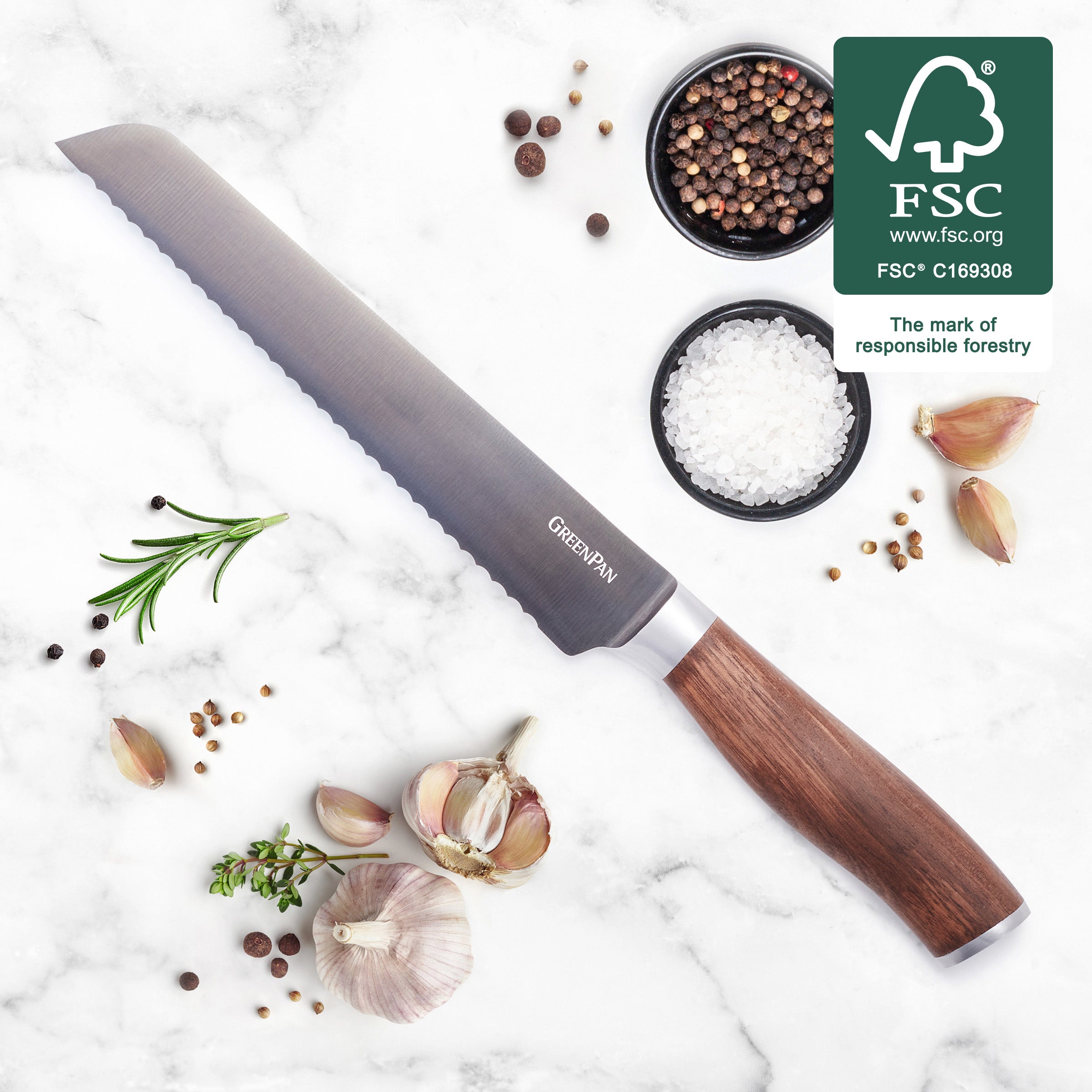 Slice through crusty breads without worrying about crushing them with this handy bread knife. The blade is cryogenically treated to remove residual stresses, then hand sharpened and coated with titanium to deliver long-lasting performance.