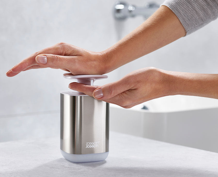 This hygienic pump soap dispenser can easily be operated with your wrist or forearm when your hands are messy.