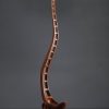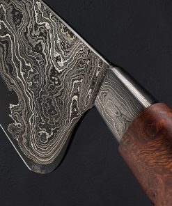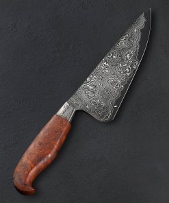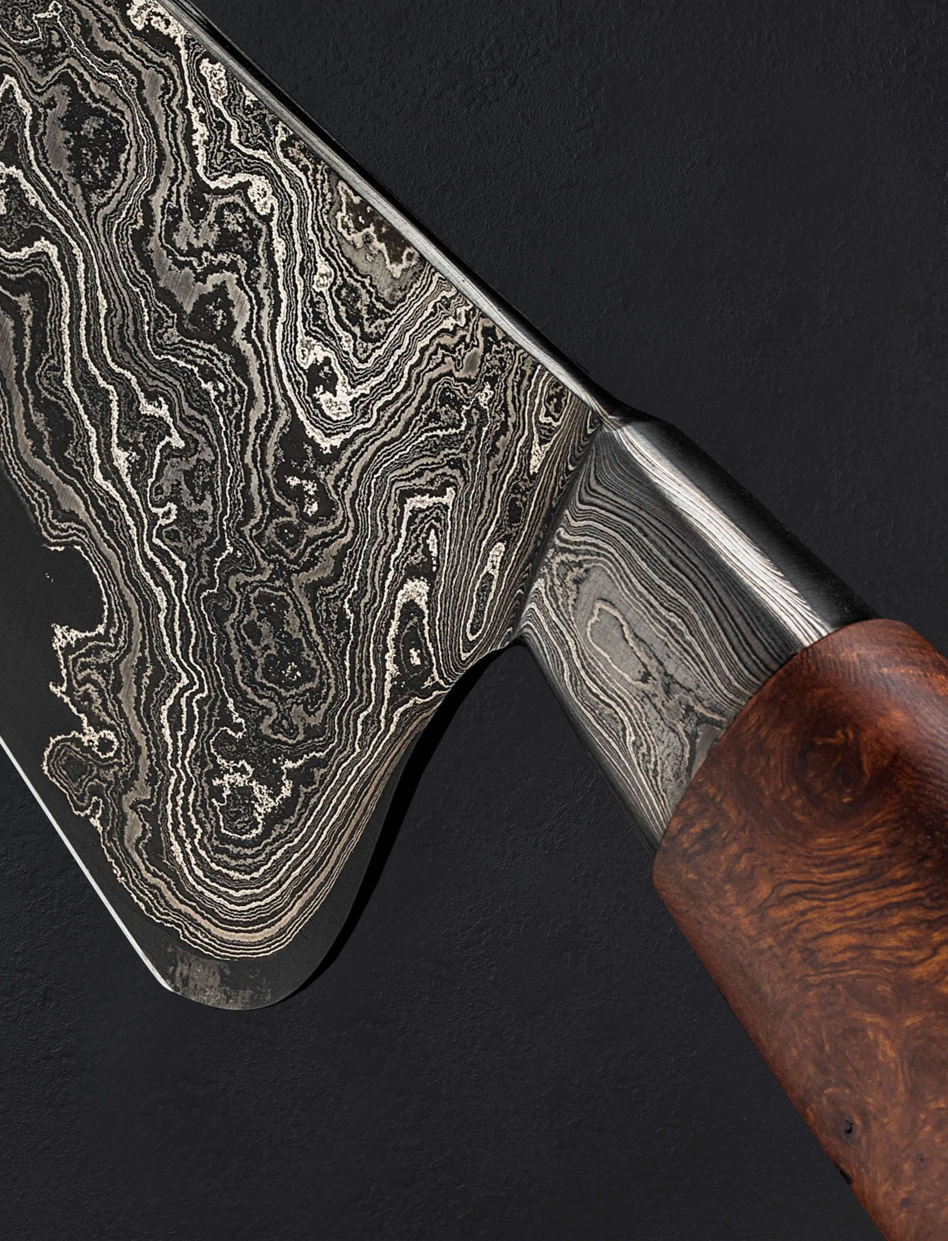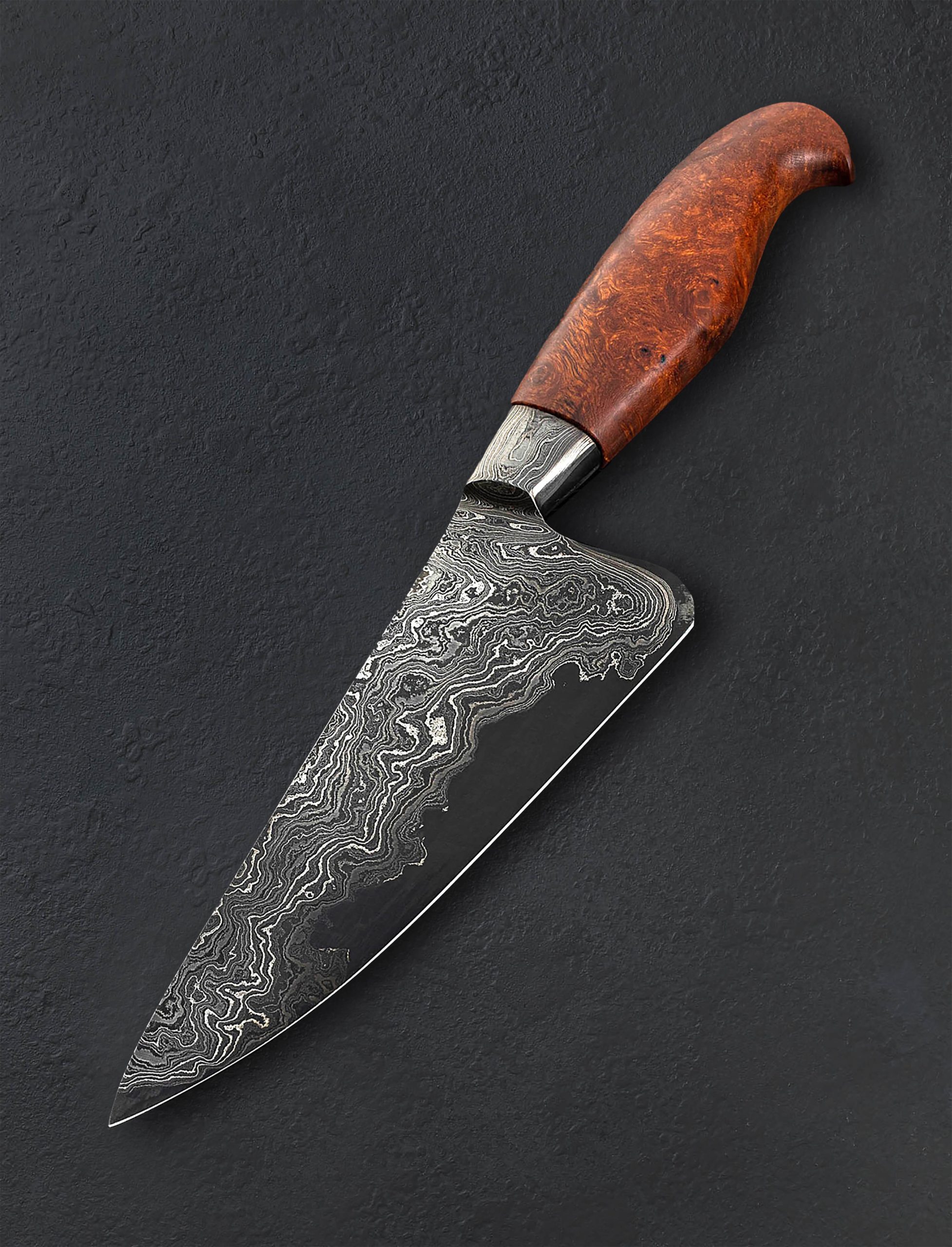 You’ll find no marks on the knife to indicate who its creator is, yet you’ll not soon forget the work of bladesmith Joshua Prince. In unused, like-new condition, this pre-owned chef knife was crafted in Joshua’s Rhode Island studio and features a 190mm / 7.5″ long by 68mm tall blade with gorgeous cladding formed from layer upon layer of wrought iron, mild steels, carbon alloys, and pure nickel. The cutting edge, thin, hard, and razor-sharp, is shaped from 80crv2, a high-carbon chrome-vanadium steel known for its toughness, making it an excellent workhorse material in the kitchen. This core steel is visible as a dark center-line running the length of the blade’s rounded spine, but it is evident more than anywhere as the blade steel fans out into the integral bolster, which marks the balance point of the knife, and for which Joshua has provided a stepped-down, heirloom fit as it meets the ironwood handle. Carved into a crook-handle shape that fills the hand comfortably and naturally, the ironwood is a fitting completion to this stunning, one-of-a-kind tool.