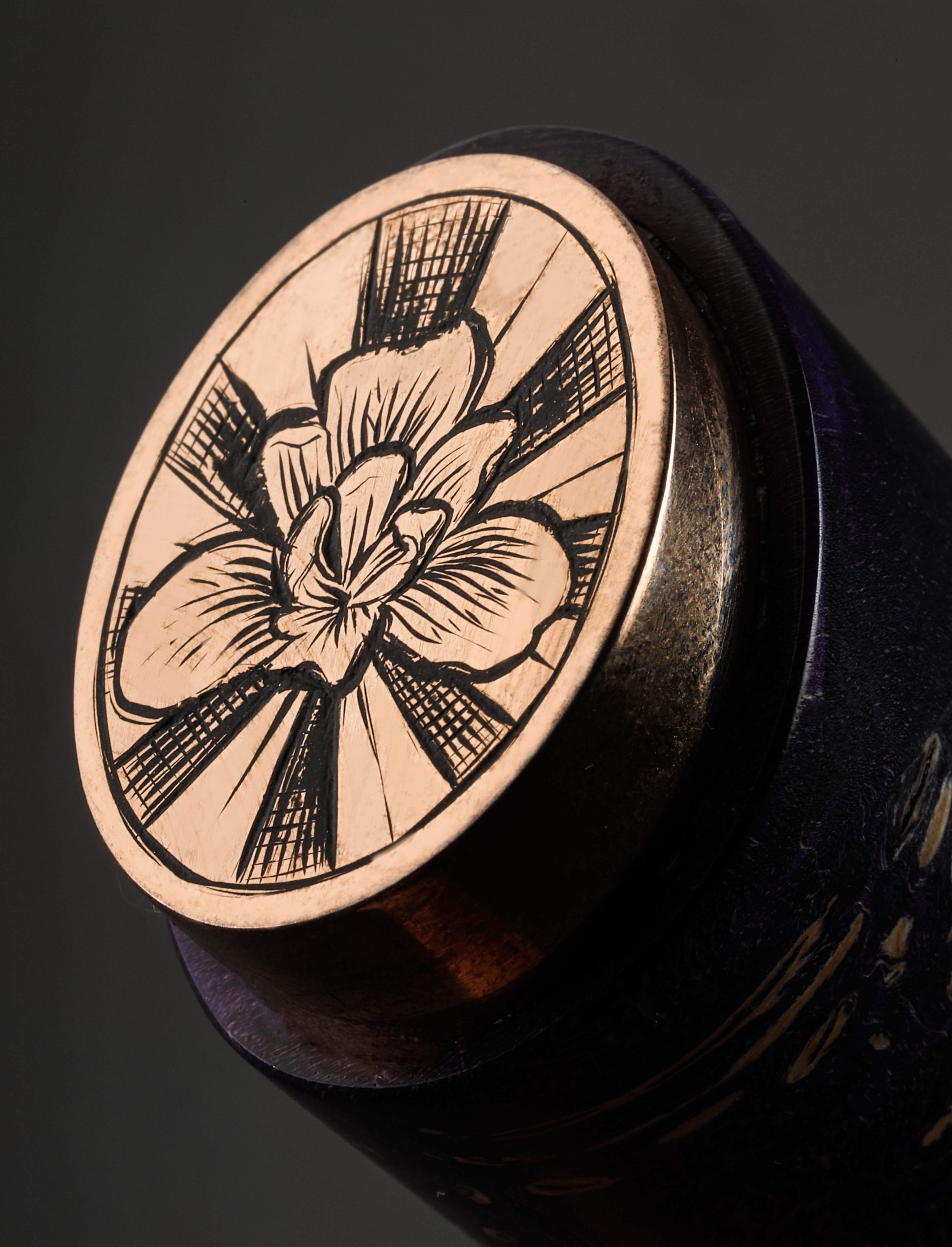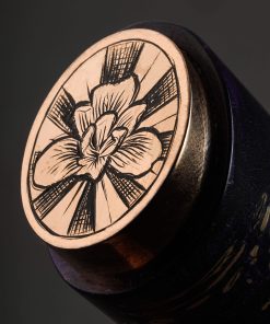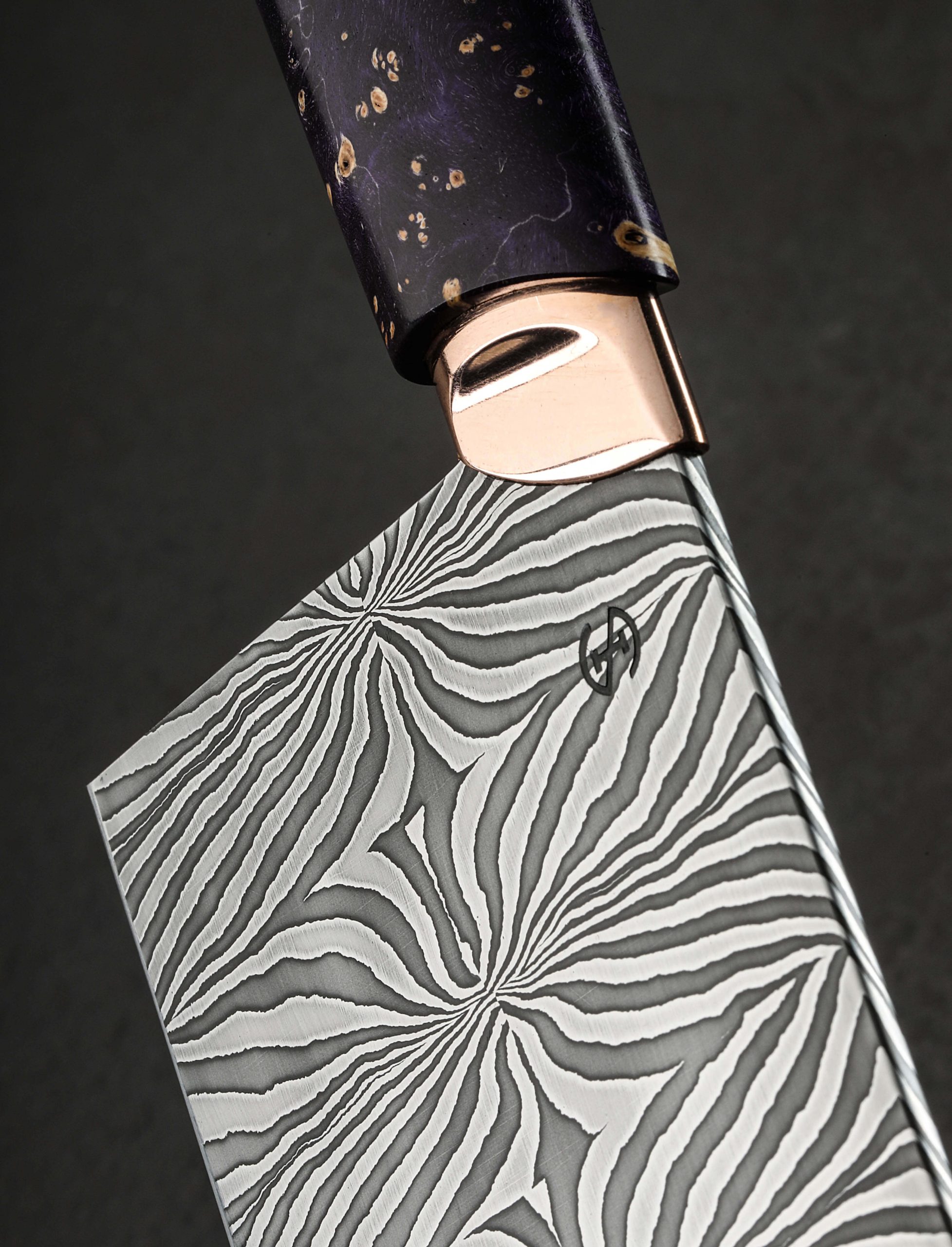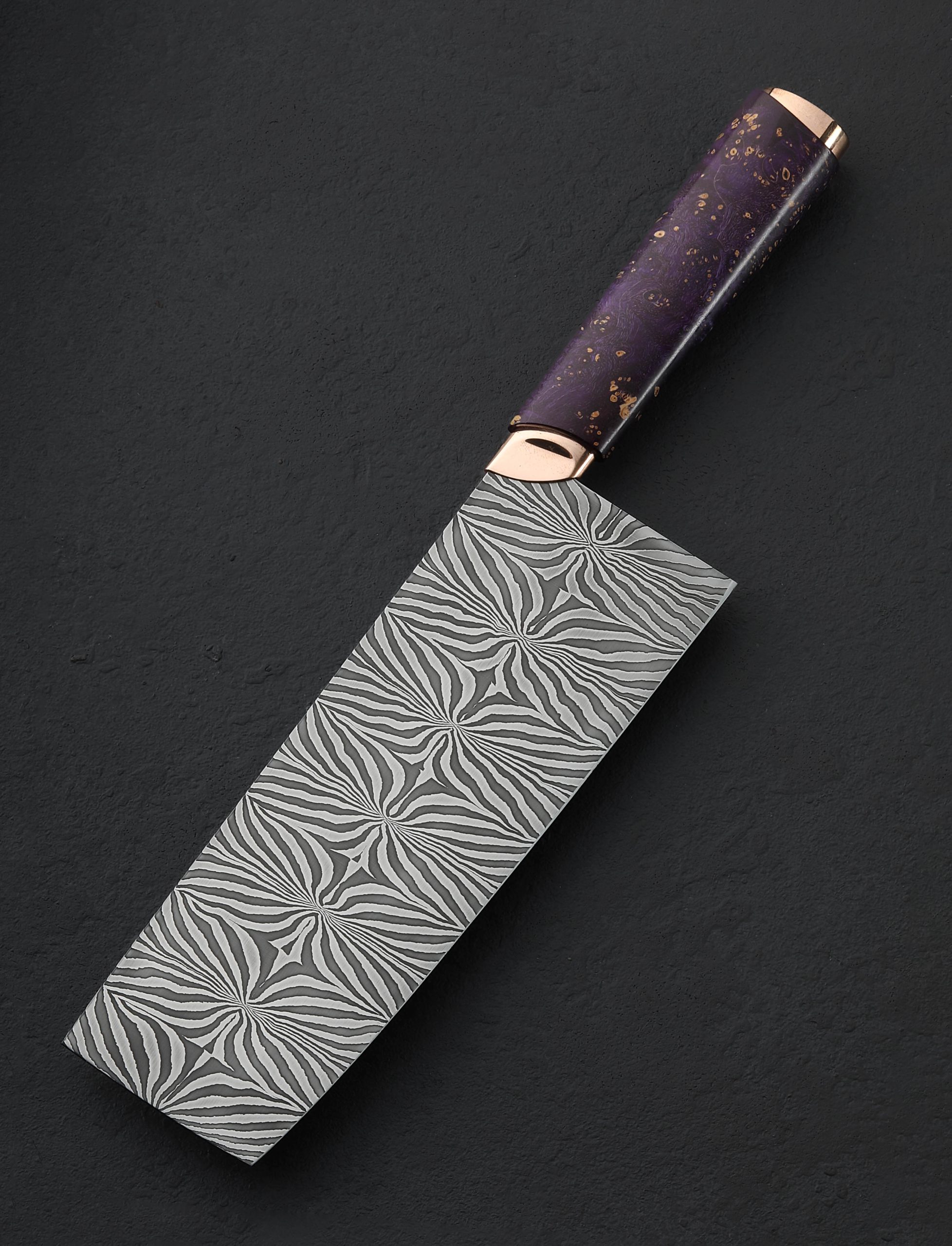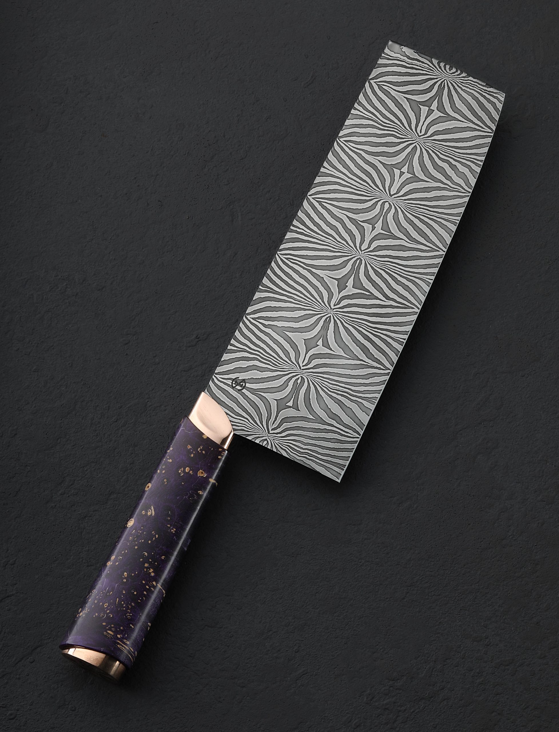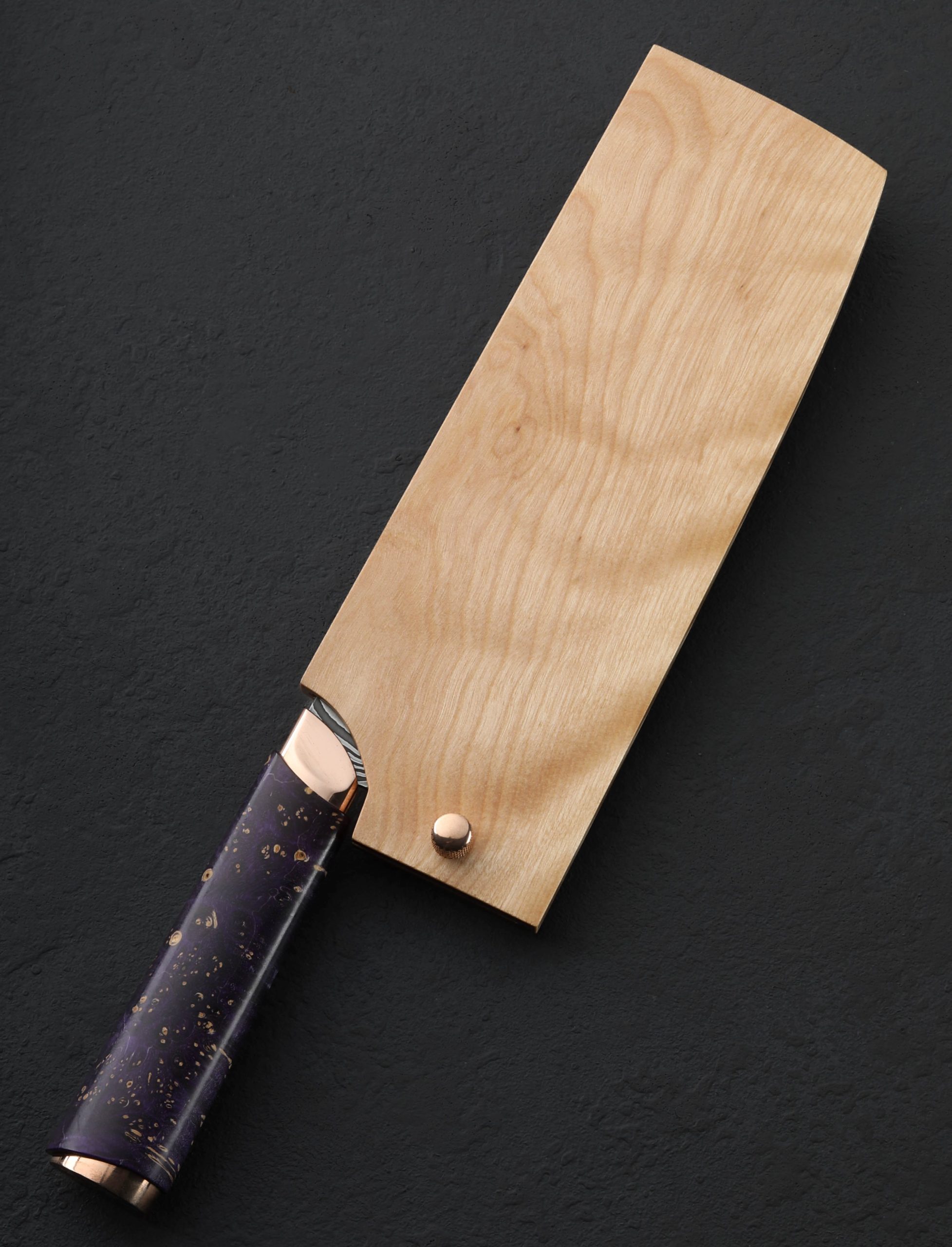 Artist Isaiah Schroeder never fails to take our breath away with the striking and unique functional objects he creates, and as is his way to push the limits with each build, the credit for our breathlessness in the case of this collaborative chef knife is shared with Rebecca Rettenmund, Isaiah’s talented wife and partner. First the blade, in a carbon mosaic damascus steel pattern of Isaiah’s design and making, compiled and finished with incredible control and beauty, is tall and powerful, solid, and weighted at the rounded spine, and wonderfully thin, sharp, and hard at an edge that sits below convex bevels shaped purposefully for efficient vegetable chopping. As a traditional nakiri, the edge profile is flat from the 70mm tall heel forward for push-pull cuts, before curving up just slightly toward the flat front for added versatility. Then, there is the handle. The first element to merge with the damascus is a sculpted collar of shibuichi, a copper and silver alloy of Isaiah’s own making, a material traditionally used in Japanese art, and one which Isaiah has been known to cast, carve, and shape to adorn his more incredible knives. The high-polished collar then disappears into a piece of purple dyed and stabilized box elder burl with a comfortable, elegant, oval profile with which to control the cutting edge. Finally, enter Rebecca and her exquisite engraving: the handle’s end cap, in the same house-made shibuichi, is engraved across the rear face by her experienced hands with the image of a blooming iris, imparting on this one-of-a-kind tool an organic air and warmth that only this couple can offer. For protection and transport, a handmade flame birch saya with shibuichi pin is included.