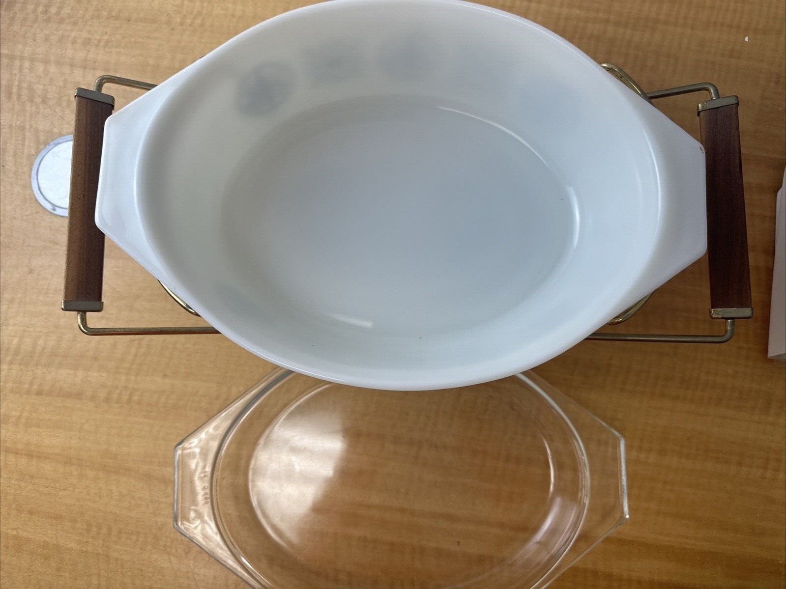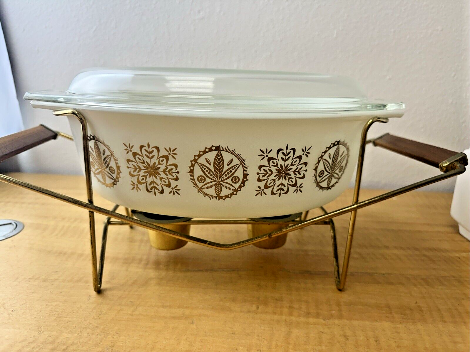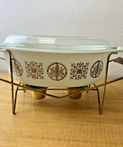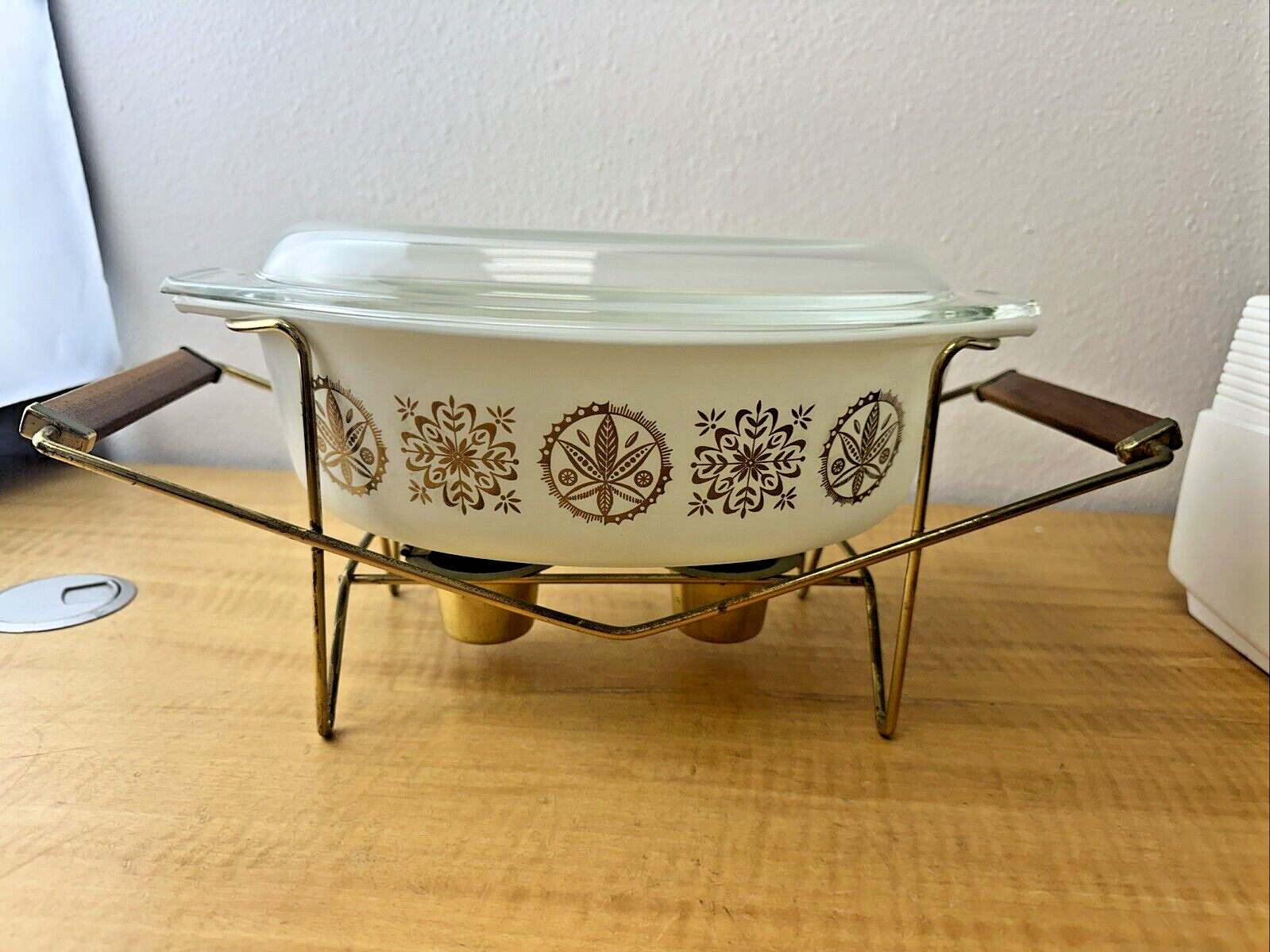 Pyrex 2.5qt Hex Signs Pattern White-Gold Dish With Lid & Candle Warmer Cradle