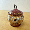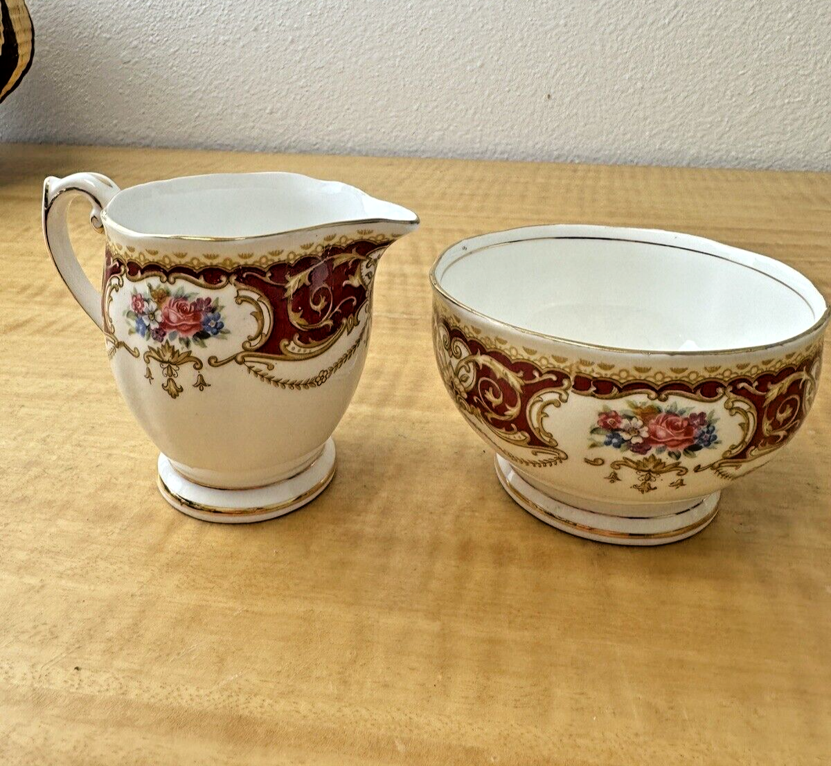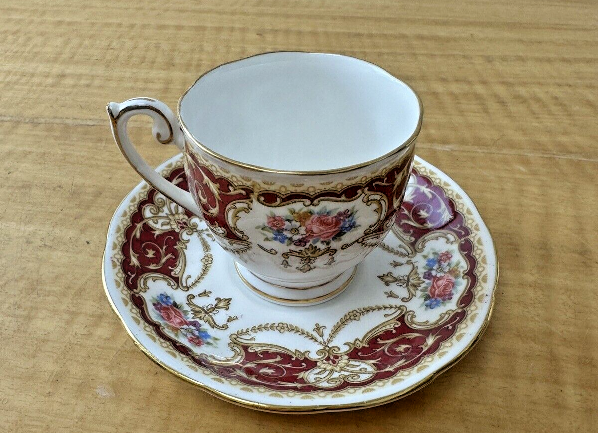 Queen Anne red and gold collectible tea set including matching teapot, cup and saucer, cream and sugar bowls.