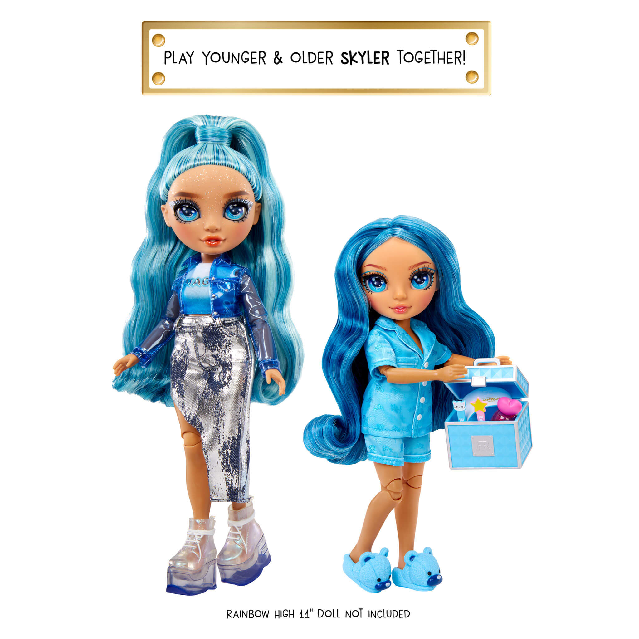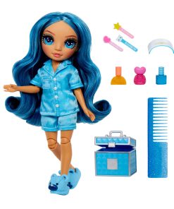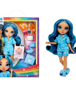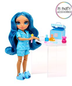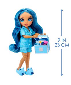 Rainbow High Jr High PJ Party Skyler is dressed in an adorable two-piece satin pj set and matching blue bear slippers. She has an adorable younger face sculpt, beautiful long blue hair with curls, long eye lashes and glass eyes.