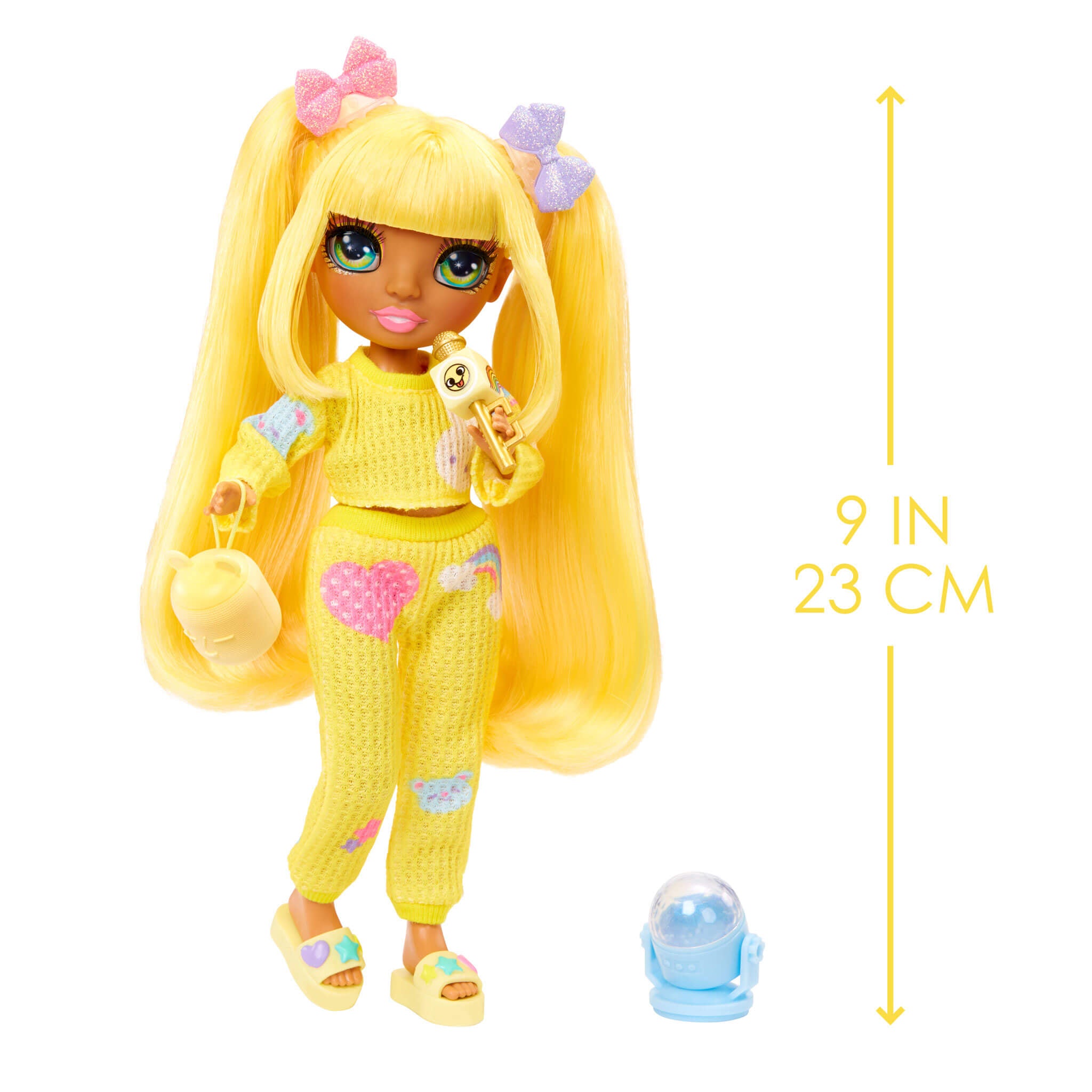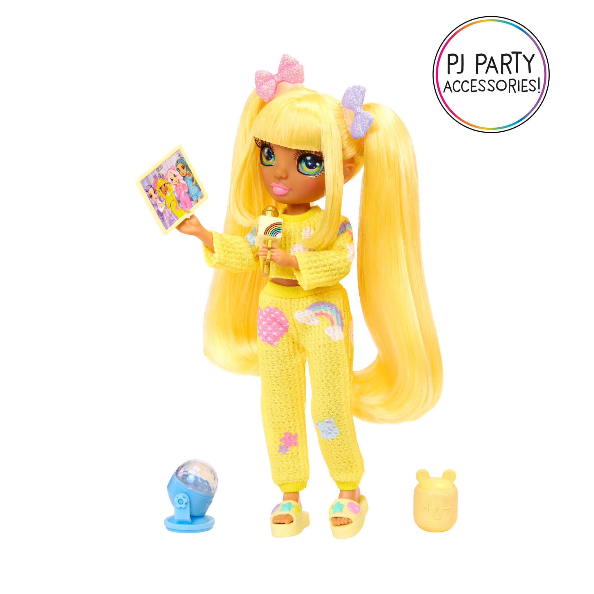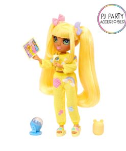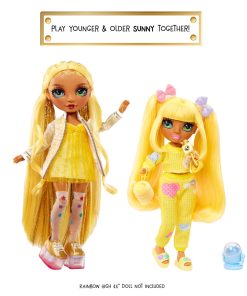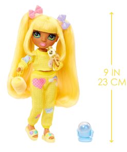 Rainbow High Jr High PJ Party Sunny is dressed in an adorable two-piece, yellow, pj set and matching yellow slippers. She has an adorable younger face sculpt, beautiful long straight hair in two ponytails with bow clips, and short bangs, long eye lashes and glass eyes.