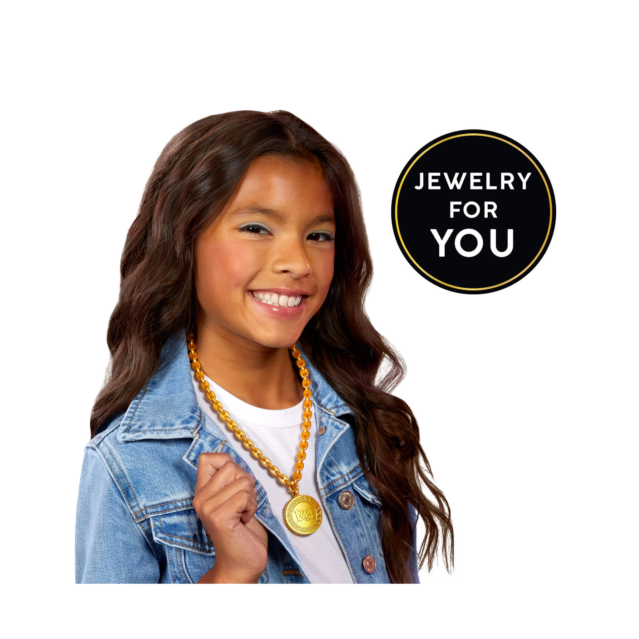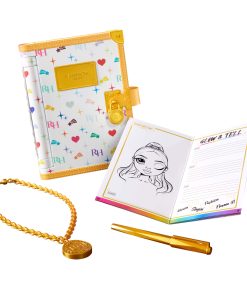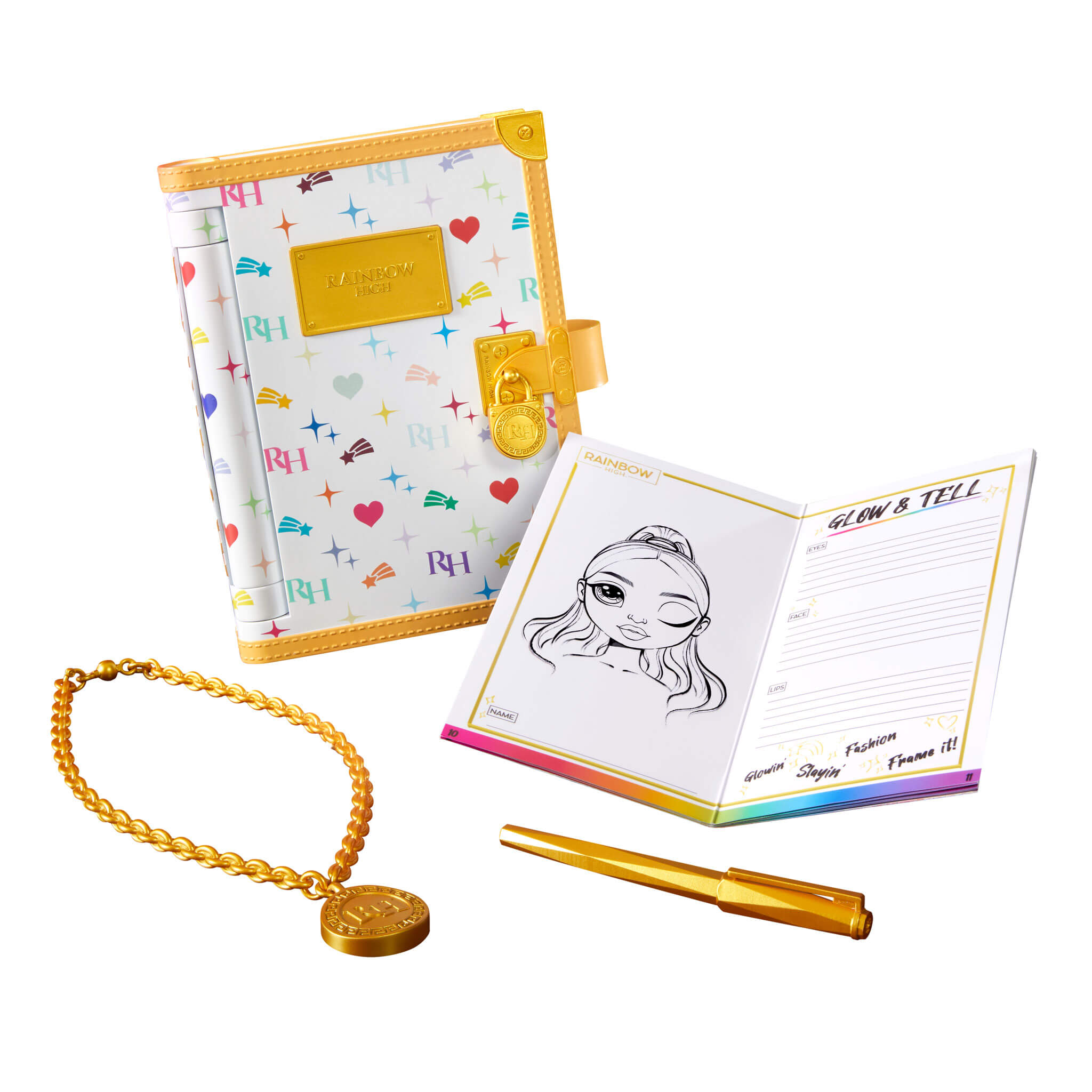 Lock doubles up as jewelry for you. Accessorize yourself with the necklace with Rainbow High charm! This journal includes an activity book and matching gold pen, perfect for doodles, photos, fashion designs, activities and more. The secret journal is in the iconic Rainbow High Trunk design and can store your activity book pen, and more.