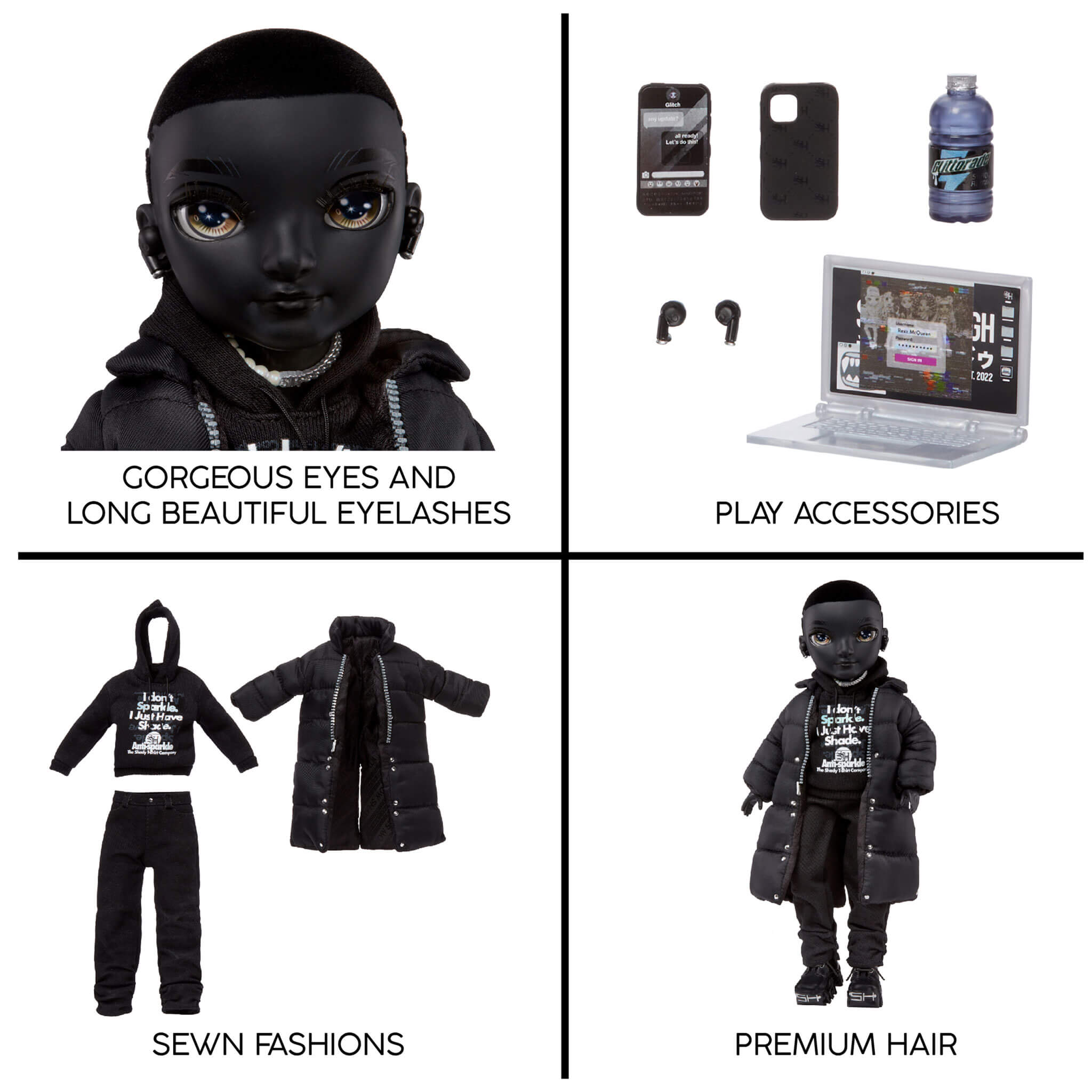 Collect all 6 Rainbow High Shadow High Fashion Dolls: Karla Choupette, Zooey Electra, Dia Mante, Monique Verbena, Reina “Glitch” Crowne, Rexx McQueen.