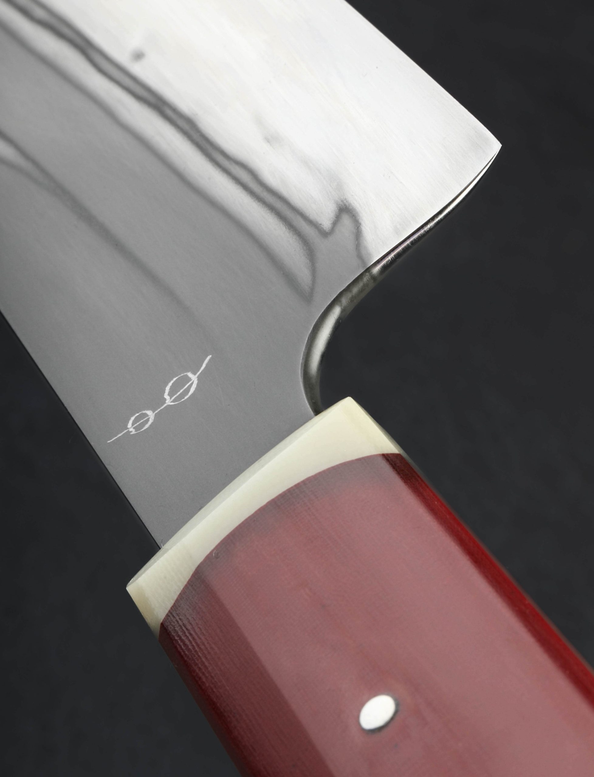 With the blade’s striking rainbow quench and handle sculpted from modern red linen micarta and rare vintage Westinghouse glass epoxy-laminate, this chef knife by Don Carlos Andrade represents functional art for the kitchen at its finest. To achieve the remarkable differential blade hardening and etched finish, Don selected, for the first time in his long tenure as a bladesmith and artisan, 26c3 ‘spicy white’ high-carbon steel, an alloy prized for its clean, low-alloying formula and fine grain structure. A versatile, balanced, and dynamic chef’s workhorse, as so many of Don’s creations are, the 172mm / 6.8″ blade is forged to shape in his ‘step gyuto’ profile and honed with pronounced convexity through the primary bevels above a thin, sharp edge. The result is a combination of toughness, durability, and finesse that Don’s loyal followers prize. A full-distal taper along the spine slims from 3.3mm above the 48mm-tall heel to 1.5mm an inch from the tip where the material has reduced in width even further to produce a fine profile perfect for detail work and precision slices. Its mass centered just behind the rounded blade choil, this knife is quick and nimble in the hand, its overall size ideal for nearly every cut in the kitchen while remaining compact enough for smaller cutting boards and workspaces. For comfortable and control in any grip, the handle, secured by a domed, polished, hand-peened steel pin, is shaped in Don’s well-loved wa handle rendition of a shield profile that includes a combination of flat faces, rounded sides, a back-to-front taper, and thoughtful details at every turn. A customer cloth-covered saya is included.