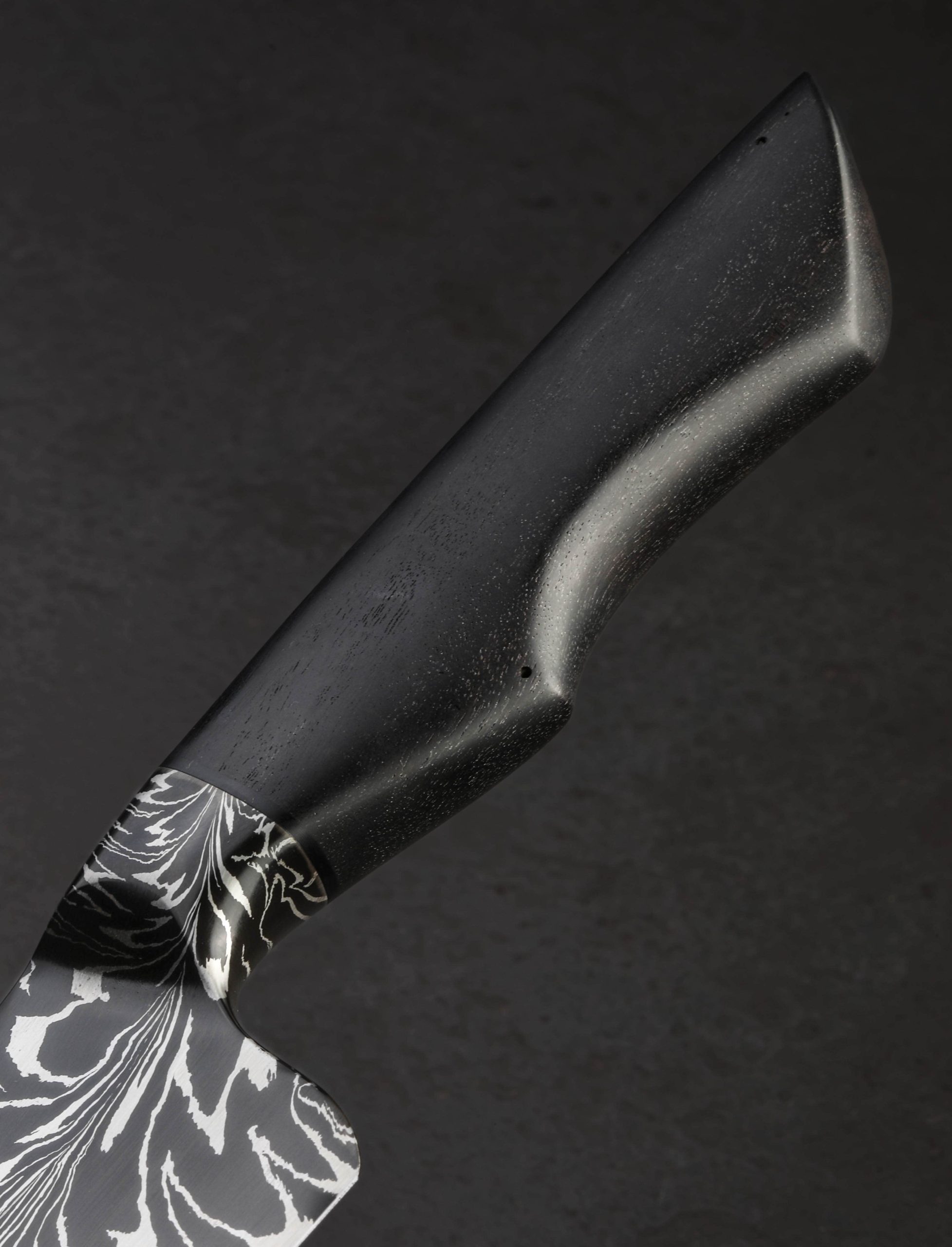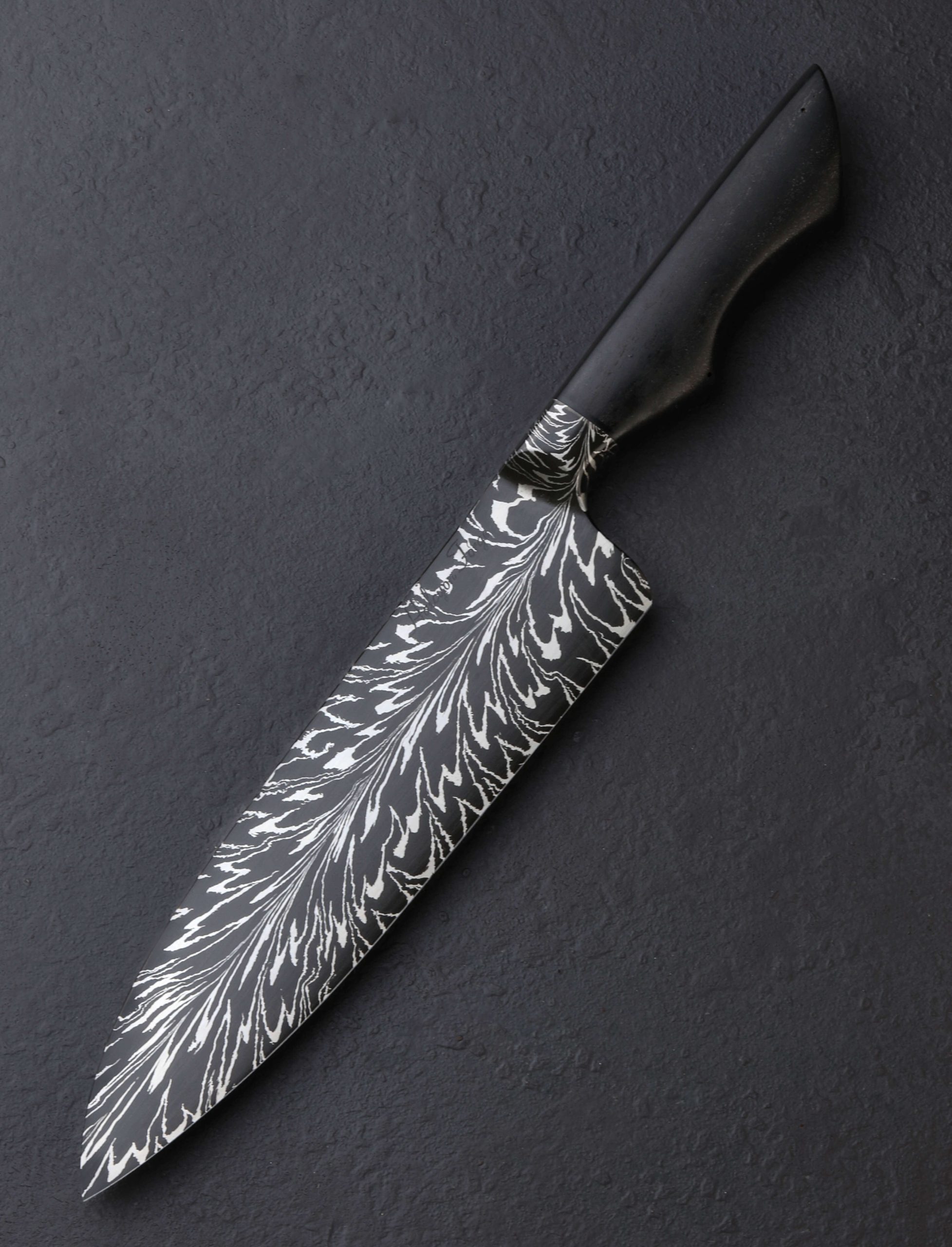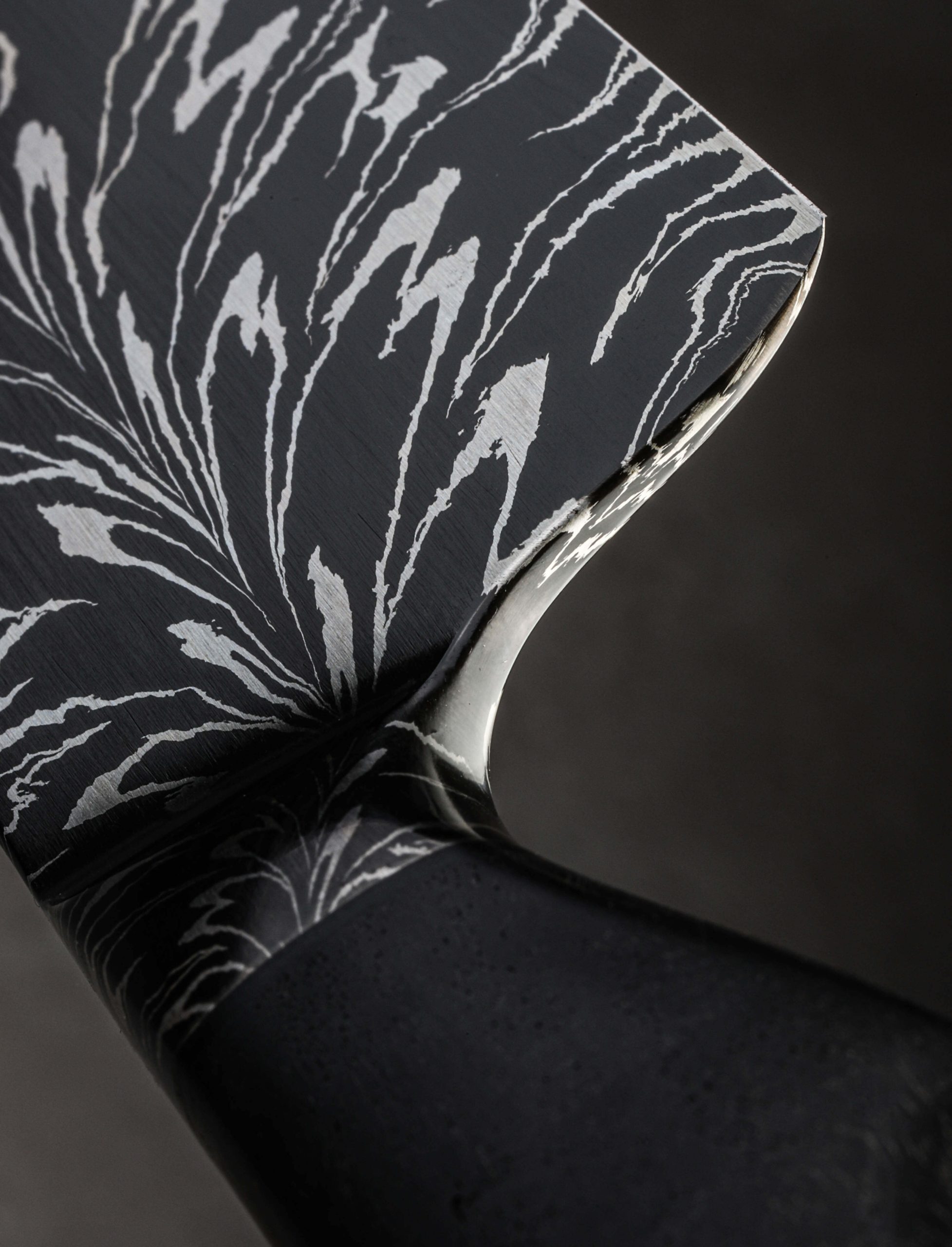 This kitchen’s show-stopper is a feathered damascus steel gyuto forged at the hands of bladesmith Joseph Schrum. At his studio in Missouri, Joseph combines CruForgeV and 15n20 carbon steel alloys to form a bold pattern of concentric layers which he then drives a wedge-shaped forging die through to produce the beautiful feathering effect that stretches from the center of the integral forged bolster to the tip of the blade. Etched and polished, the CruForgeV darkens to a near black, while the nickel-rich 15n20 contrasts it with a bright sheen. Fully convex and boasting the superbly honed, versatile geometry he is known for, Joseph delivers a balanced, workhorse blade to the chef’s kitchen with a thin, razor sharp, near-zero edge, pronounced convexity just above it, and a distal taper along the rounded spine that culminates at an especially fine, needle-like tip. Its center of mass lying just at the edge’s 53mm-tall heel, with an overall weight of 9.3oz / 262g, the knife is powerful and steady, moving purposefully in the hand. Outstanding fit-and-finish all around provides a comfortable cutting experience, the sculpted integral bolster, rounded choil, and spine all adding to the rewarding feel. Completing an ergonomic and handsome Western-style handle is a beautiful piece of ancient redgum wood in which Joseph has left the small voids where ancient organisms feasted.