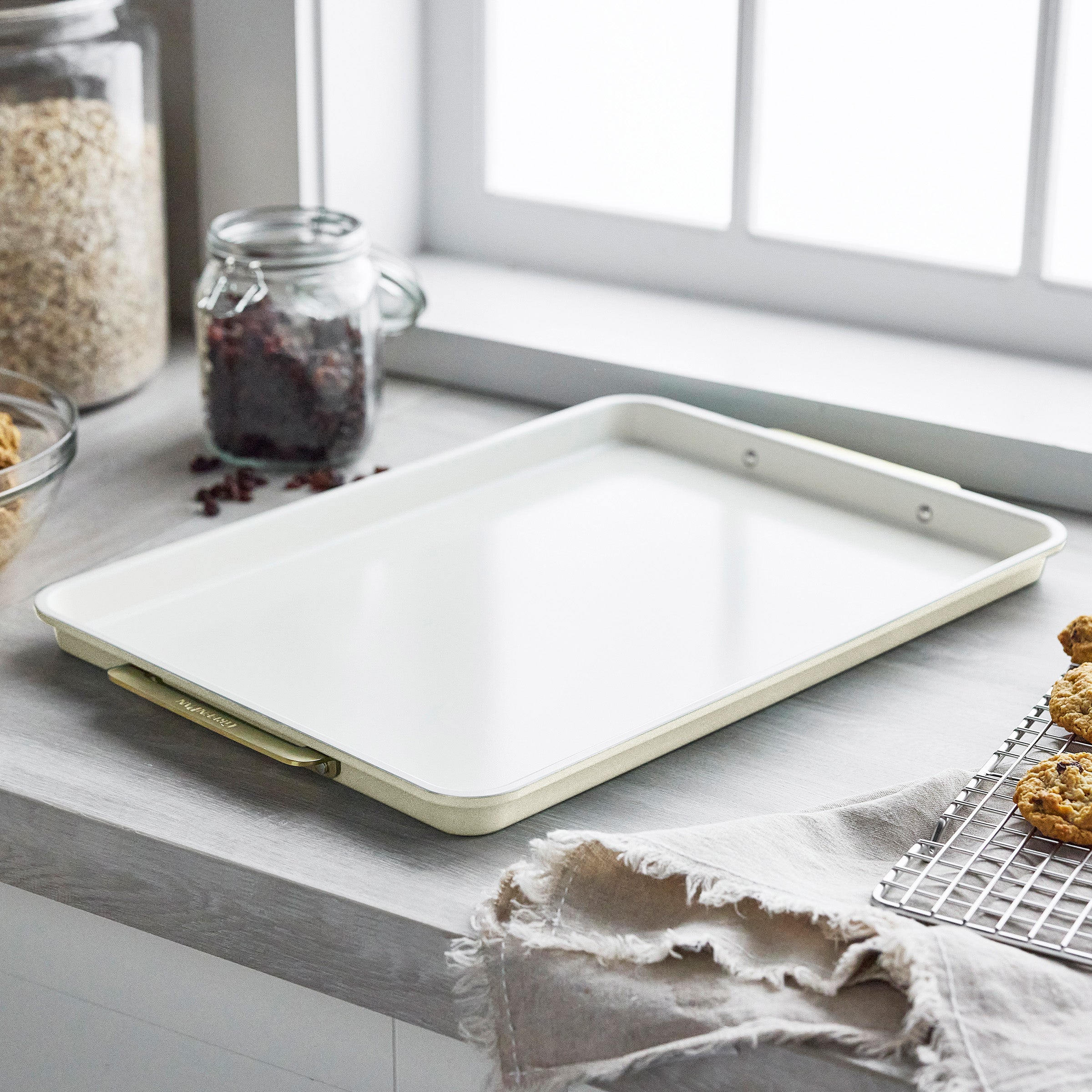 Perfect for cookies, sheet cakes, or roasted veggies, this pan features heavy-gauge aluminized steel for even heat distribution and daily durability. Our PFAS-free nonstick provides effortless food release, while the gold-tone handles offer a strong and stylish touch.