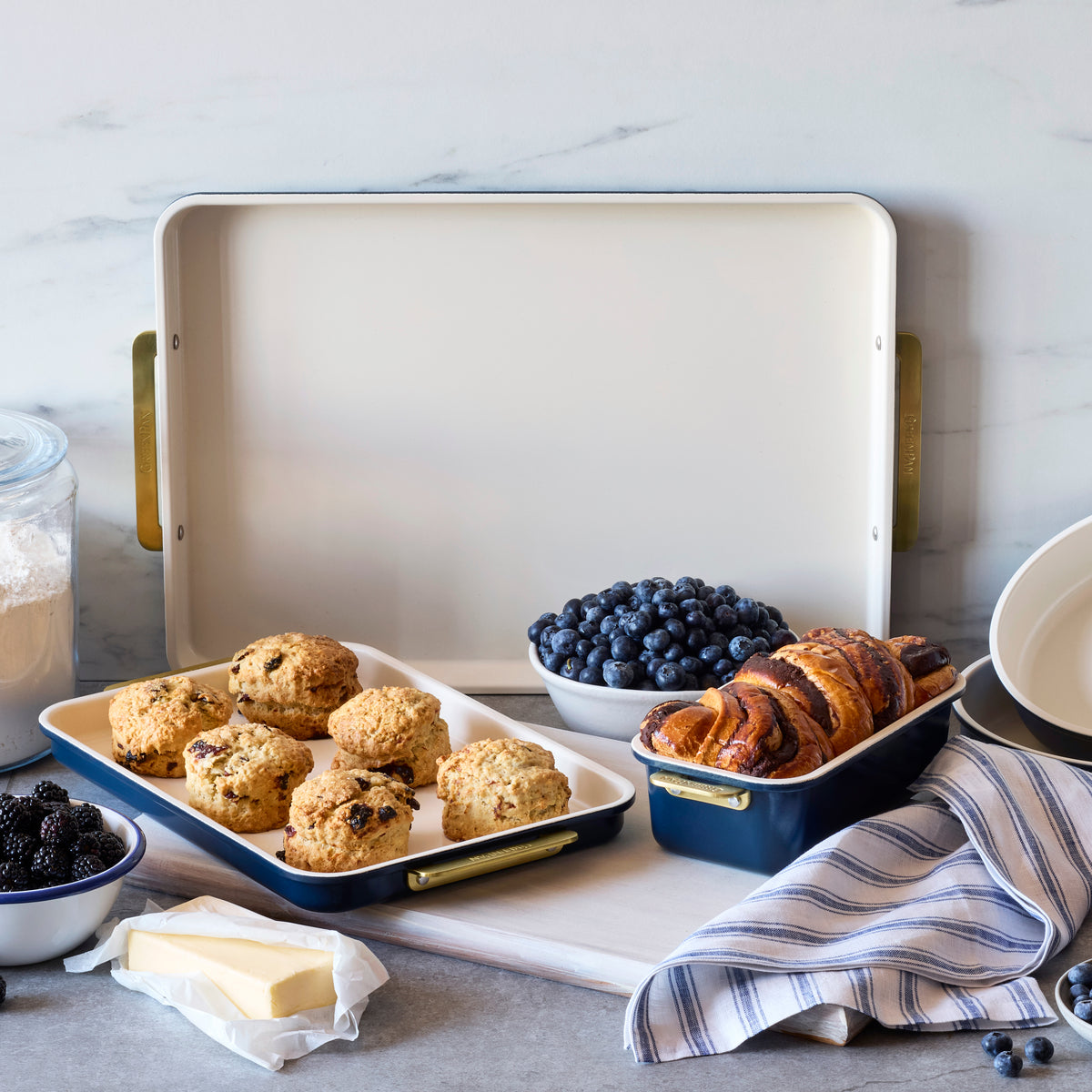 Transform your oven cooking with the resilient Reserve collection. Made from heavy-gauge aluminized steel, these pans feature our PFAS-free nonstick for easy release and healthier meals. Plus, the gold-tone handles are both stylish and wear- and corrosion-resistant.