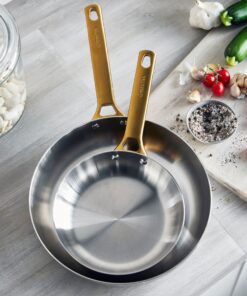 A perfect pairing of innovative design and superior performance, this frypan set features both a 10″ and 12″ pan, each made from premium stainless steel for outstanding durability and heat distribution. From quick weeknight dinners to more intricate cooking techniques like browning and oven finishing, this set delivers professional-quality results with ease.