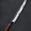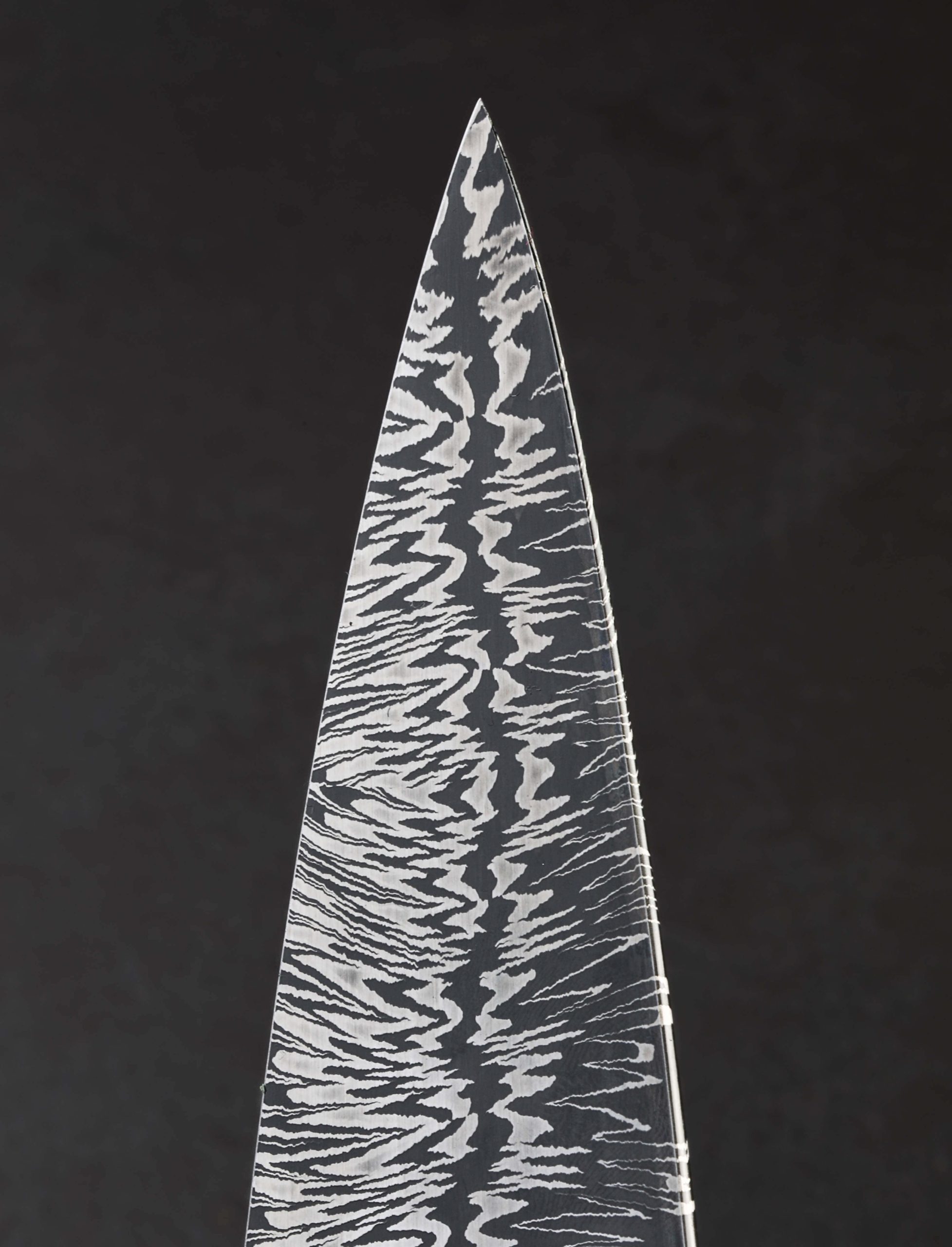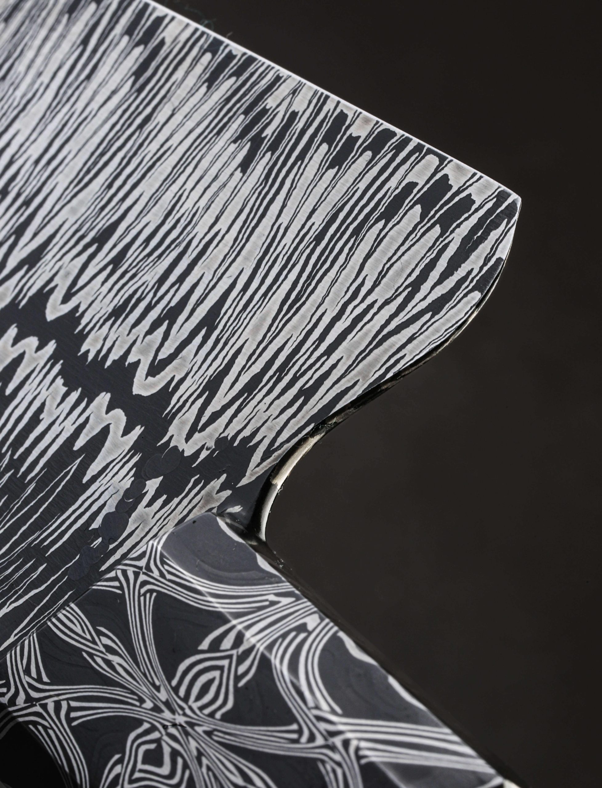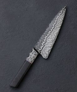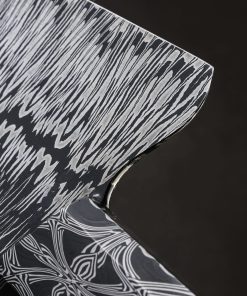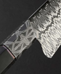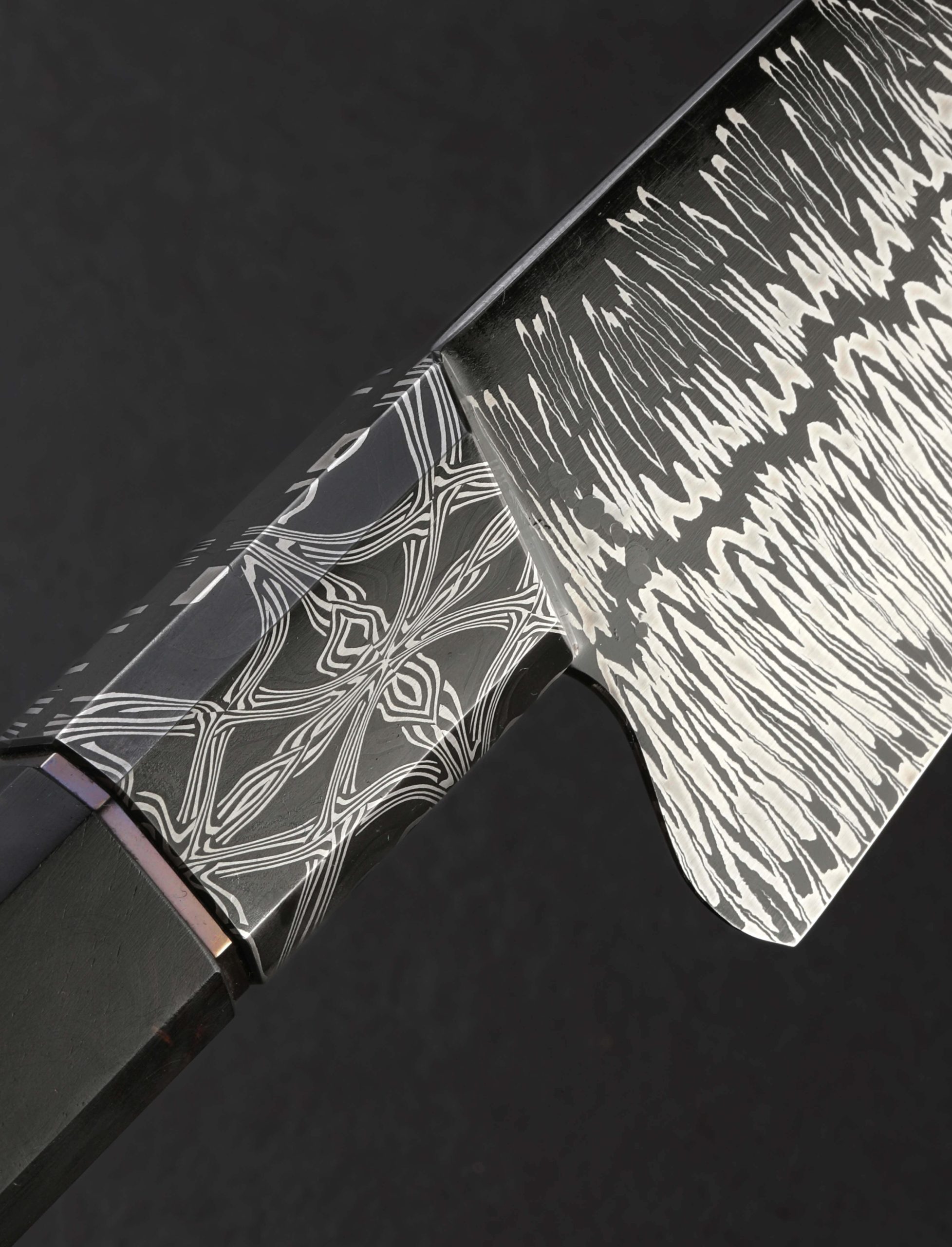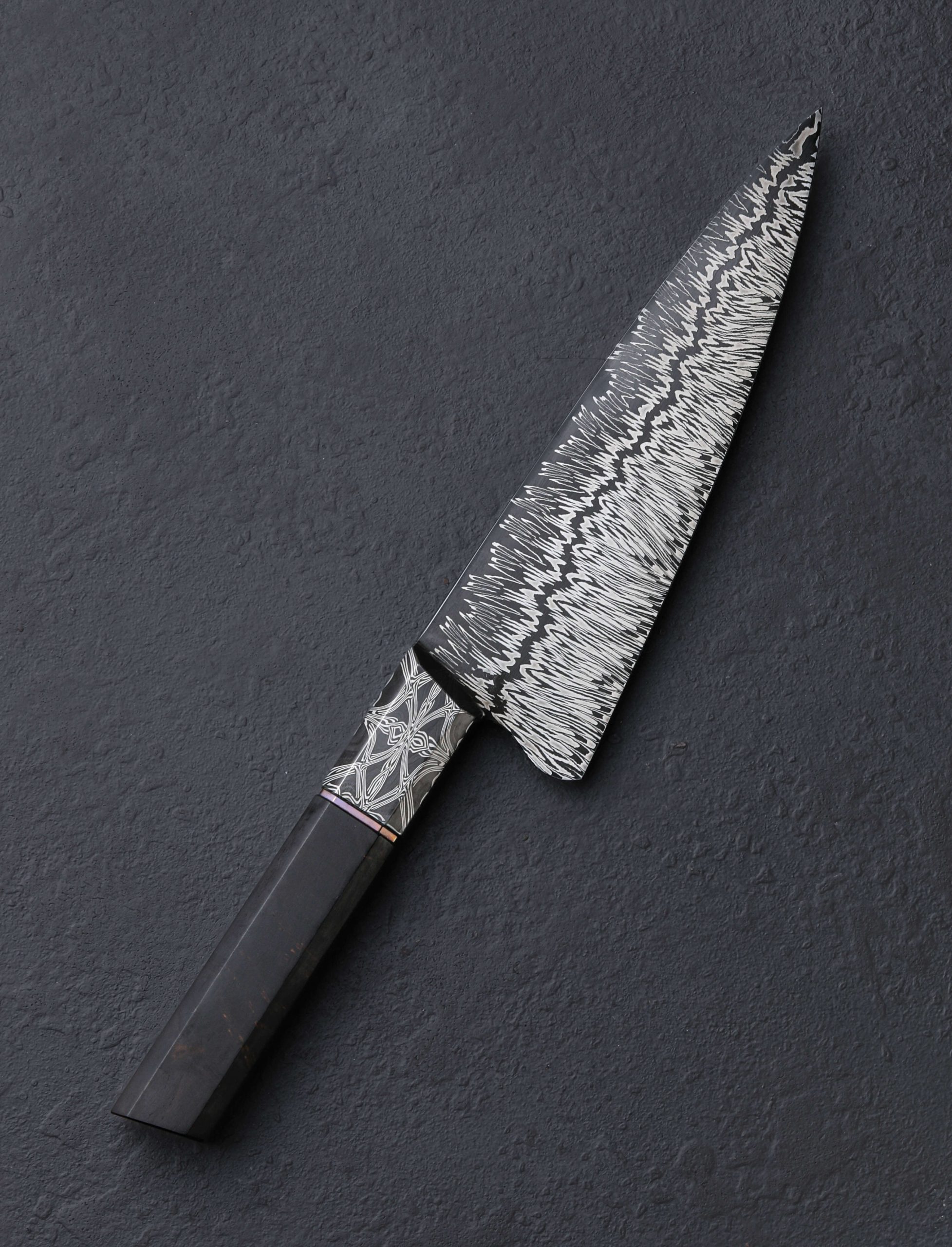 In the latest chef knife designed and built by Colorado artist Jayden Simisky is a confluence of materials, patterns, and thoughtful details that together form a deliciously artful kitchen tool. On the sharp side of things is Jayden’s head-turning Richter pattern damascus steel, inspired by Gerhard Richter, the German painter who experimented with the concept of dividing and recompiling an abstract work along its vertical axis. The fissure in the center of the damascus’ pattern undulates from the very thin, needle-like tip back to the blade’s 57mm-tall heel where it disappears just at the point that blade steel meets handle steel. To ensure the blade’s performance on the cutting board is finely honed Jayden leaves no stone unturned: tall, slim, convex bevel geometry flows downward from the rounded spine to an especially thin, hard, and sharp edge. Tough and rigid in the rear, the blade will excel at larger chopping tasks, a relatively flat stretch of edge making quick work of vegetables. Jayden then tapers the spine progressively forward to produce a beautifully balanced and versatile finished product that is precise enough for the most delicate slices using the curved belly of the edge profile and tip, where a touch of lateral flexibility is present in the forward inches well. Its center of mass falling just behind the the blade’s choil, this hand-filling knife with its octagonal, integral bolster handle enjoys a rear-weighted balance point, resulting in quick and nimble blade movements. For comfort and control in any grip, a symmetrical wa-style handle pairs the knife’s second damacus pattern, a bold mosaic of Jayden’s design used for the bolster, to a dark, handsome piece of African Blackwood, separated by an heirloom-fit, anodized titanium ring. With attention paid to every transition and surface, from subtle contouring and mico-faceting of the handle’s edges, to the rounding of the choil, the blade’s etch and polish, and the copper retention bolt cap, Jayden hits the mark at every level.