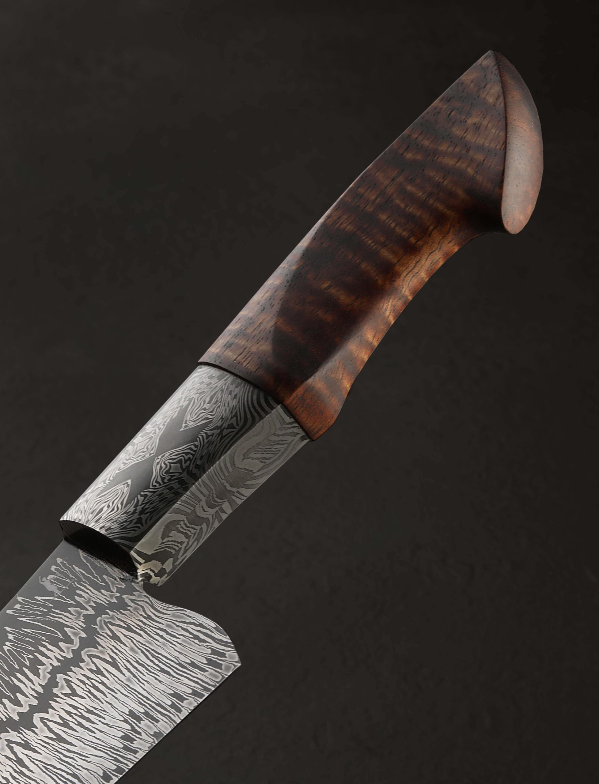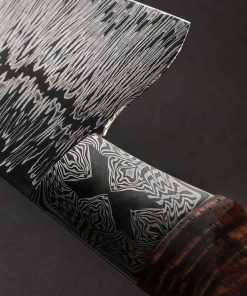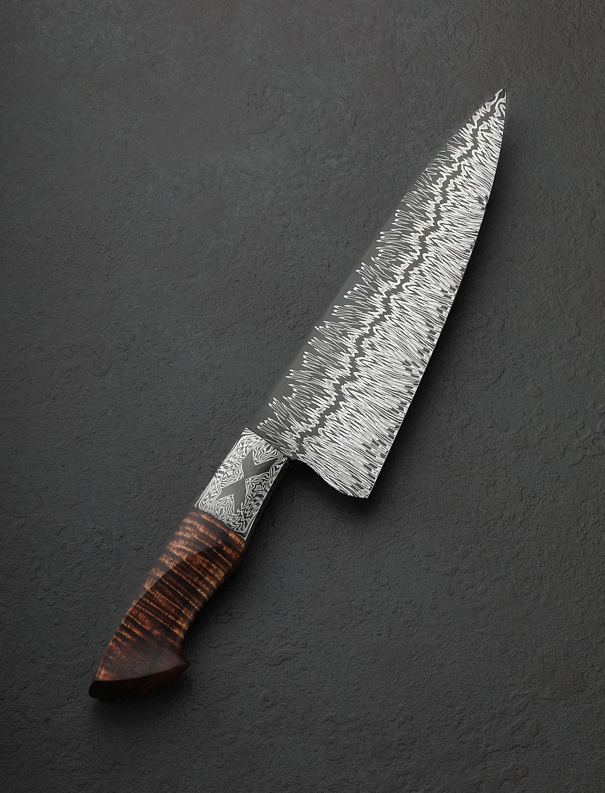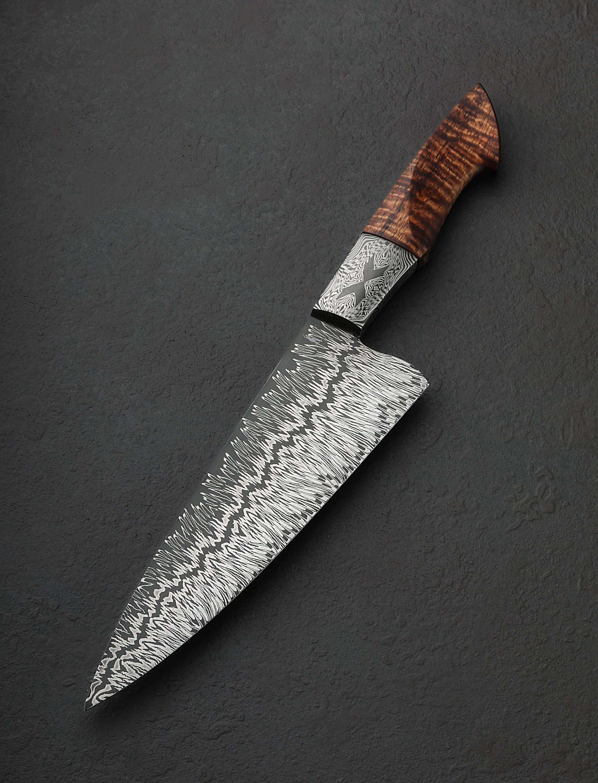 Inspired by the art of Gerhard Richter, the German painter who experimented with the concept of dividing and recompiling an abstract work along its vertical axis, is a damascus pattern and its ensuing transformation into a one-of-a-kind chef knife by bladesmith Jayden Simisky. The pattern of contrasting carbon alloys that forms the blade is a beautiful, metallic representation of the Richter style, the dense, undulating yet still parallel lines of nickel-rich 15n20 standing out on a backdrop of dark, 1084 carbon steel filling as much of the canvas as possible toward the edge, yet providing a mere outline of the corresponding space toward the blade’s spine, with a center line that leads the eye from choil to tip. Forged by hand at his Boulder, Colorado studio, Jayden has formed a 205mm / 8.1″ chef’s profile designed for all manner of daily meal prep, the hard, sharp, and thin edge balancing finesse and strength beautifully, while the spine slims to an extremely slim, needle-like tip for precision work, balancing the strong, sturdy, 59mm-tall heel that is ideal for chopping even the largest and densest ingredients. To begin a comfortable, ergonomic, and striking handle Jayden’s ‘X Marks the Spot’ mosaic damascus pattern forms forge-welded integral bolsters that wrap around the tang of the blade’s Richter pattern. To complete a culinary tool destined for greatness, with stepped-down, heirloom fit-up, the damascus bolsters converge with a breathtaking piece of Hawaiian Koa sculpted into a handsome, hand-hugging profile.