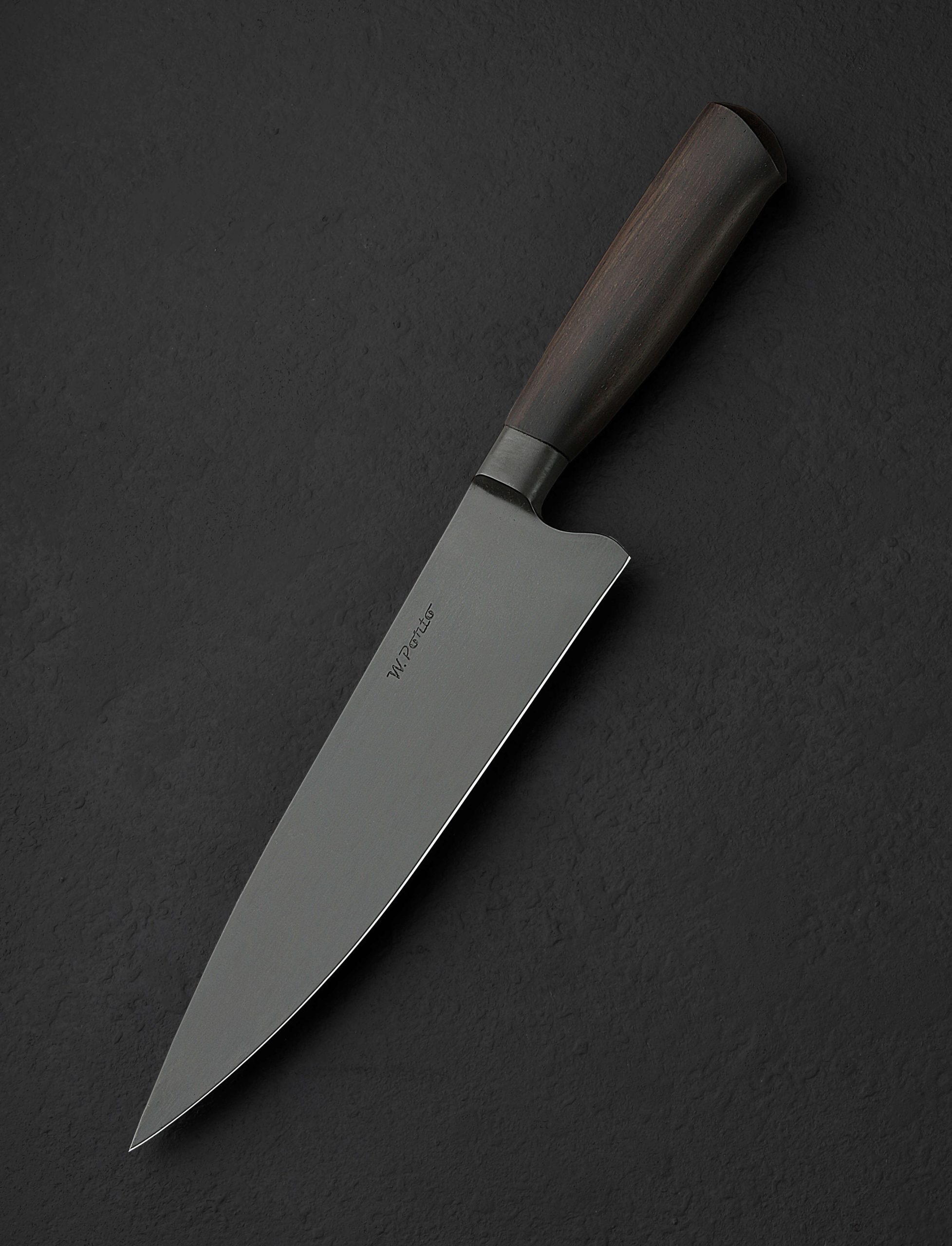 Forged by Brazilian artist and bladesmith William Porto, dressed in beautiful Brazilian Rosewood and delivering 215mm / 8.5″ of thin, hard, razor-sharp 5160 carbon steel edge to the cutting board, this is the Rosewood Shadow Chef. Tapering along its spine from the hand-forged integral bolster to a paper thin, needle-like tip, the 53mm tall blade is dynamic and versatile, offering a slight touch of lateral flexibility in a profile and with geometry designed to do it all in any kitchen. Convex primary bevels are beautifully balanced for both finesse and toughness throughout the demands of daily meal prep with a phosphate finish gives the blade a protective coating and a dark, shadowy look that we love. Balancing just as bolster meets blade, this knife is nimble and comfortable in the hand, the sculpted handle with heirloom fit-up providing control and unbridled cutting pleasure. A handmade buffalo leather saya is included.