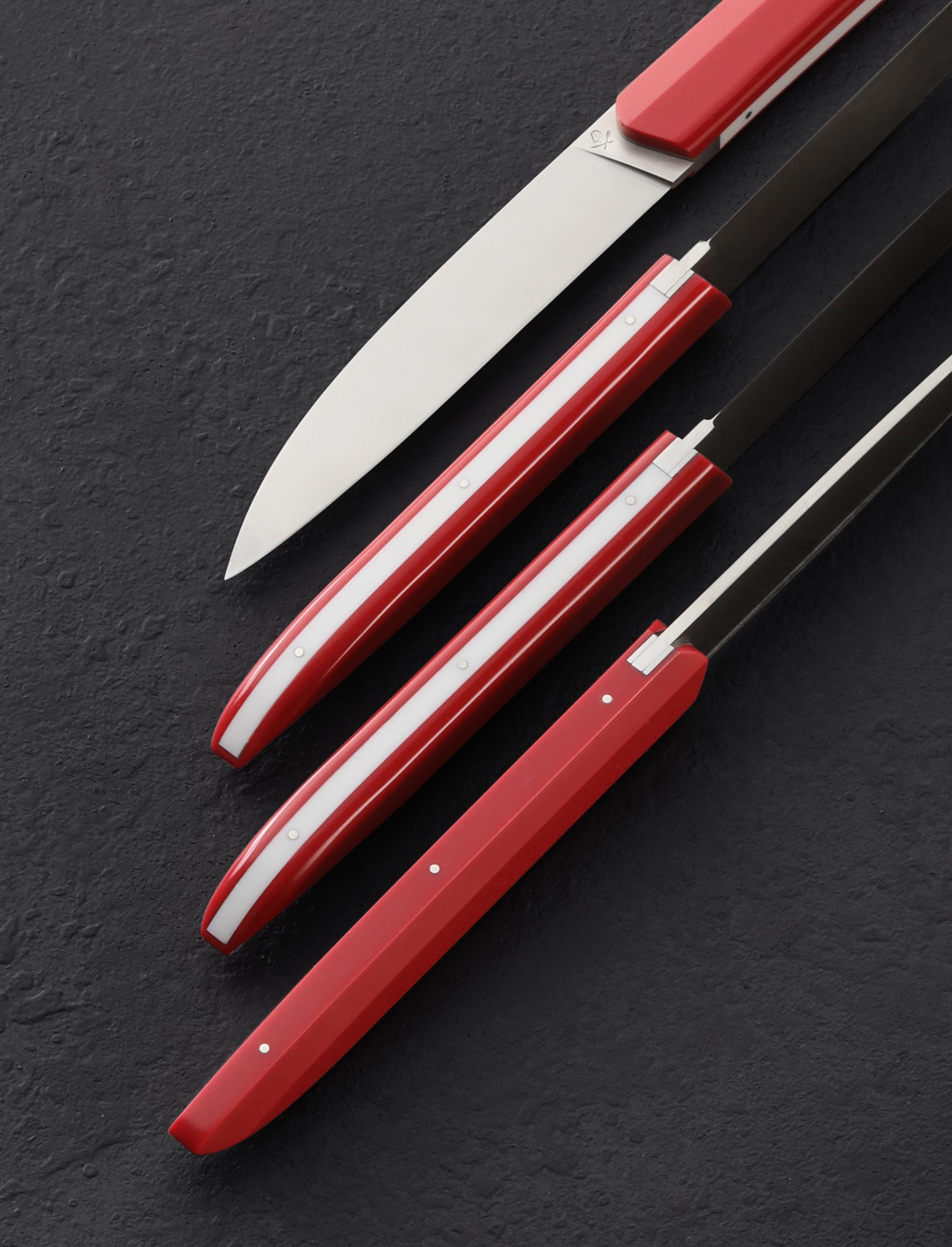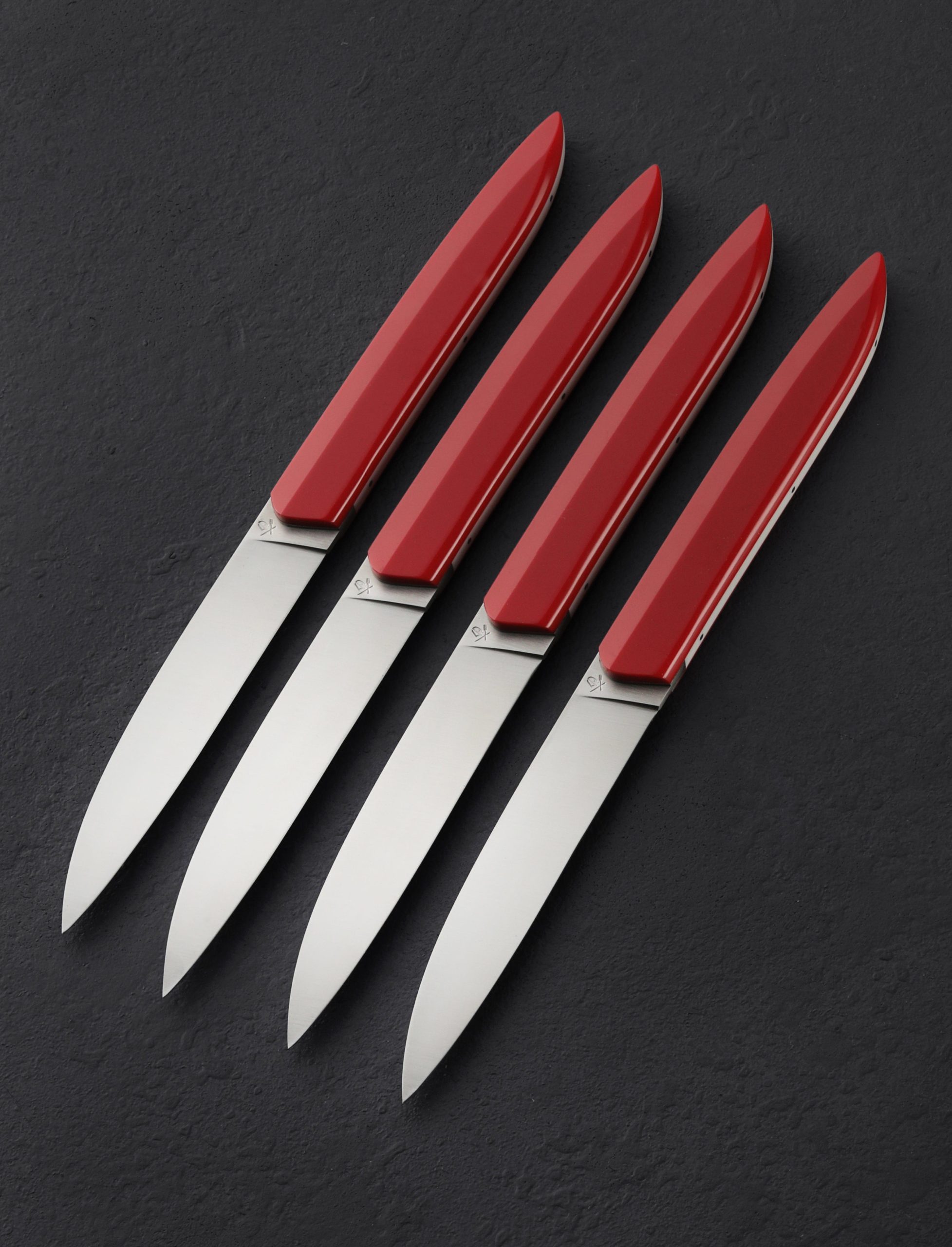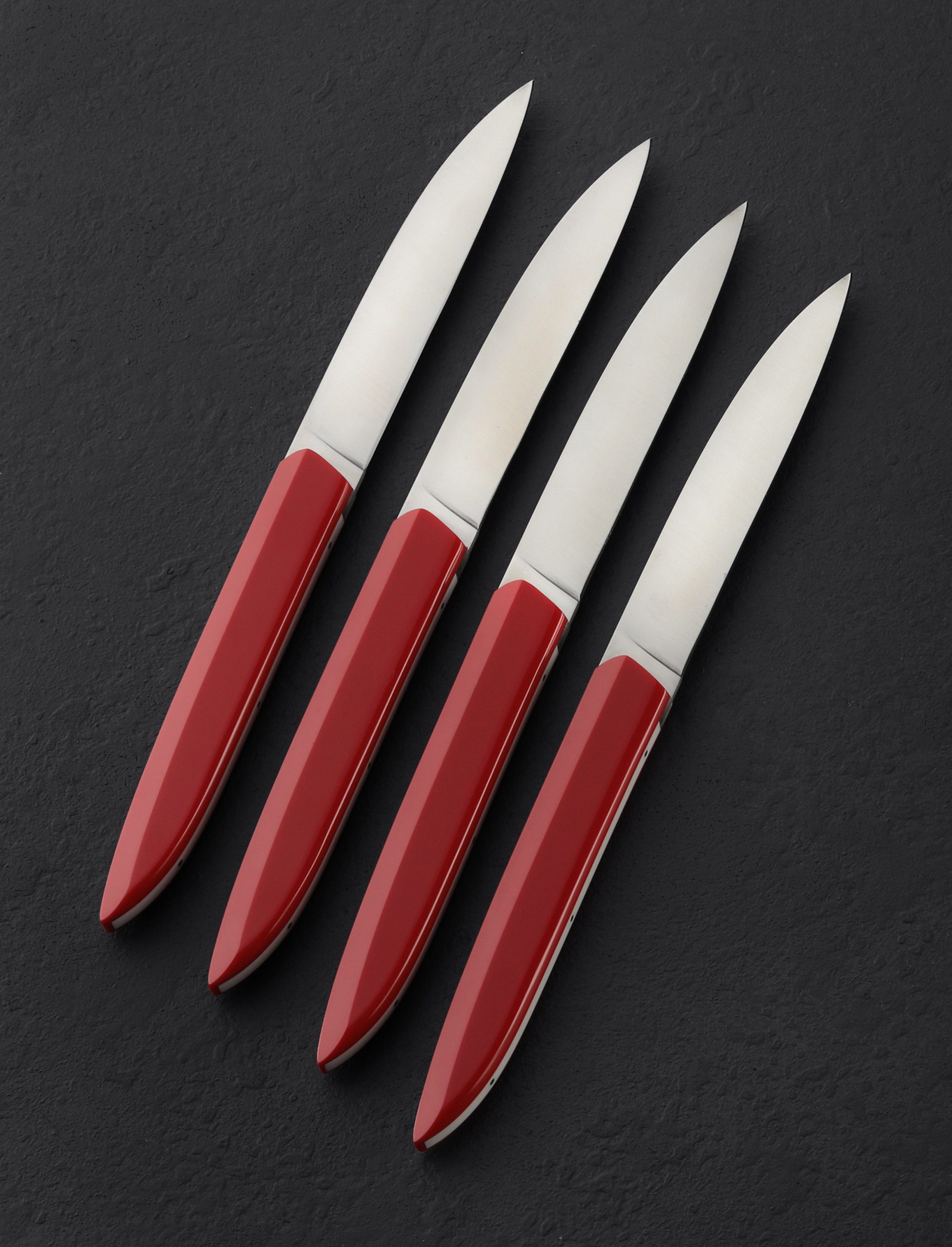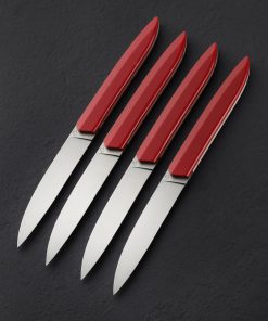 Let Royal Red add a pop of classic yet understated color to the dinner table with this 4pc set of steak knives, available here exclusively. The deep red tone accents virtually any decor with ease. Roland Lannier’s Tableware’s Not Dead collection of dinner knives, produced in small batches and hand finished at Roland’s shop in Thiers, France, is based on the premise that to fully experience a meal we must elevate ourselves from the monotony of the tableware found in the typical dining room. The tips’ reversed shape minimizes edge contact with the plate to increase the lifespan of the blade. Corian, an acrylic-stone composite, is reliable, sustainable, and waterproof. The Swedish-made Sandvik 14C18N stainless steel, hardened to 60 HRC offers excellent stain resistance and long-lasting edge. A 3D printed presentation case is included.