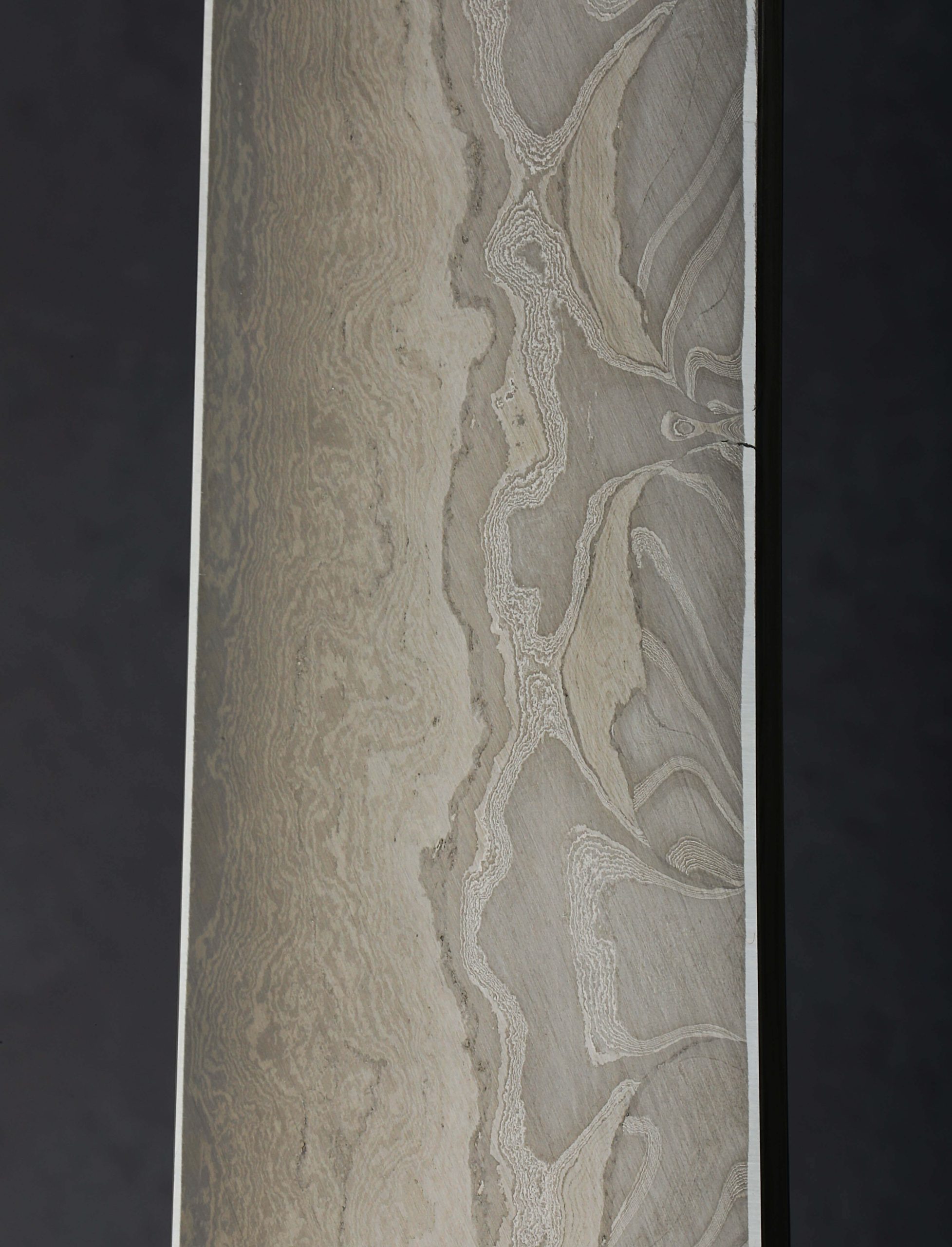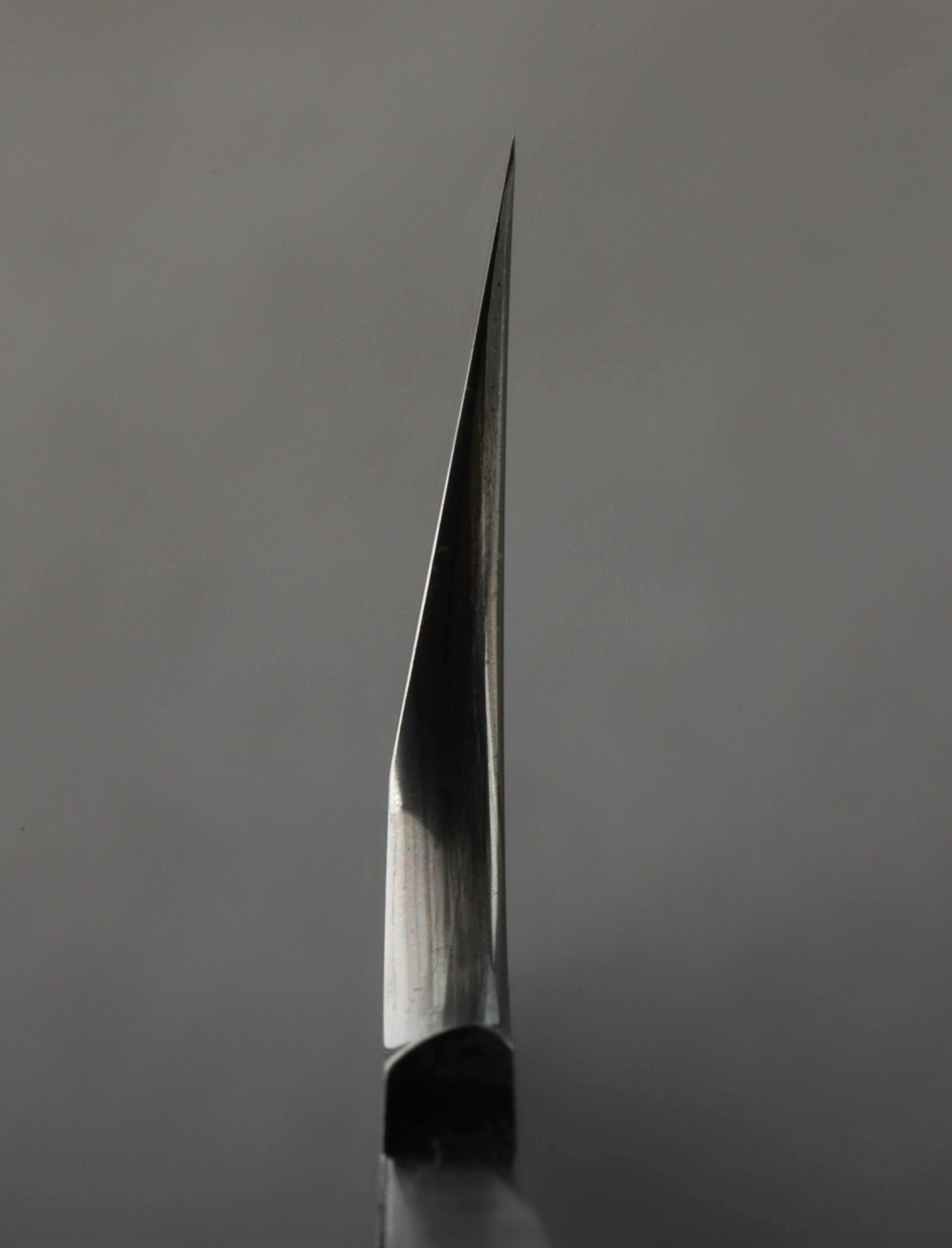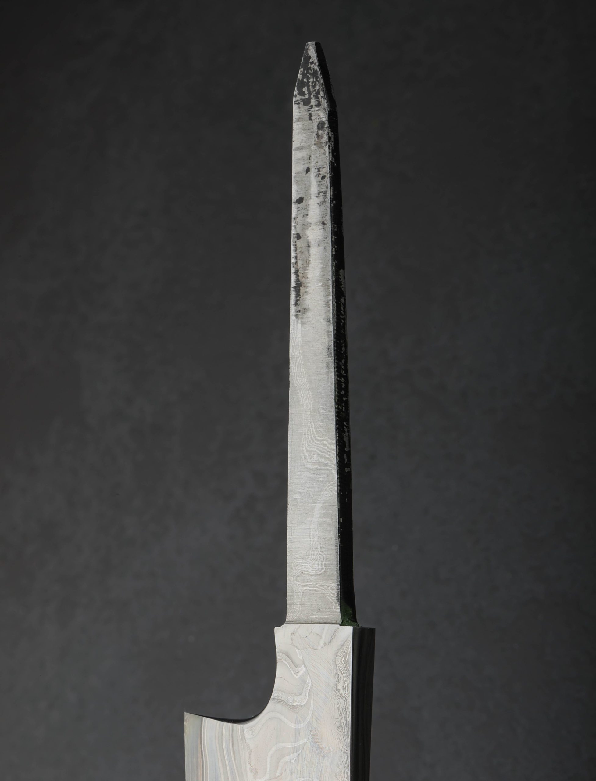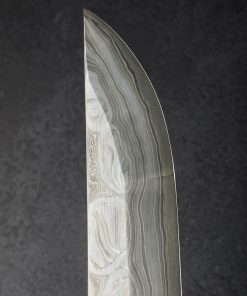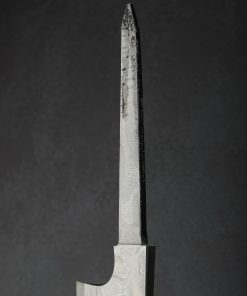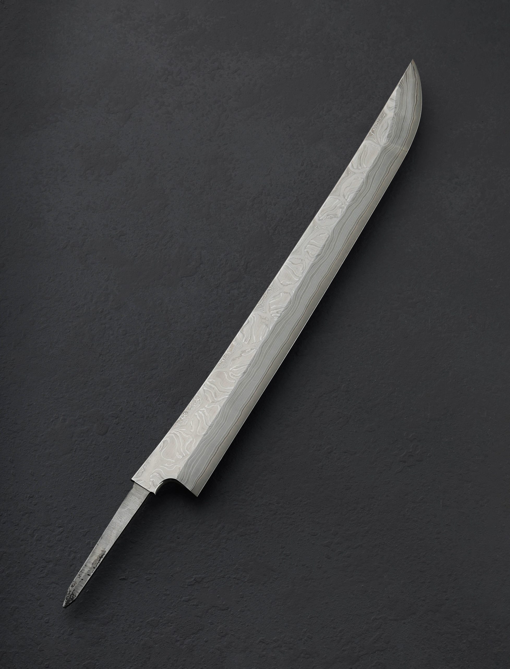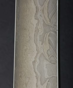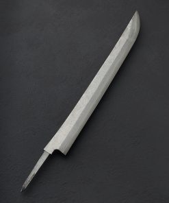 Over 350 years of bladesmithing and metallurgy expertise as one of Japan’s longest-running blacksmith shops reaches extraordinary heights with the Fantasy Line by Nigara Hamono. This single-bevel sakimaru sujihiki blade represents the pinnacle of the shop’s offerings, a culinary object as rare and exquisite as any in the world. The Nigara family began forging steel in the early Edo period, producing swords for the Tsugaru clan, and today it is run by the 7th-generation Mr. Toshiju Yoshizawa, and his son, the 8th-generation lead blacksmith Go Yoshizawa. This one-of-a-kind tool is designed for sashimi preparation by a right-handed chef, the long, slim edge and gently curved sakimaru-style tip made for cutting in one fluid motion in order to preserve the cellular structure of the fish. The hand-forged blade is constructed from a san-mai (three-layer) formula consisting of an edge in densely layered White No.2 and Blue No.2 carbon steels, with lightly etched damascus cladding of Go’s design and making. The blade comes without handle so that the owner can select the style, materials, and shape of their preference.