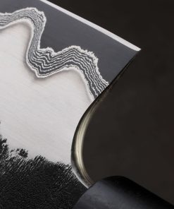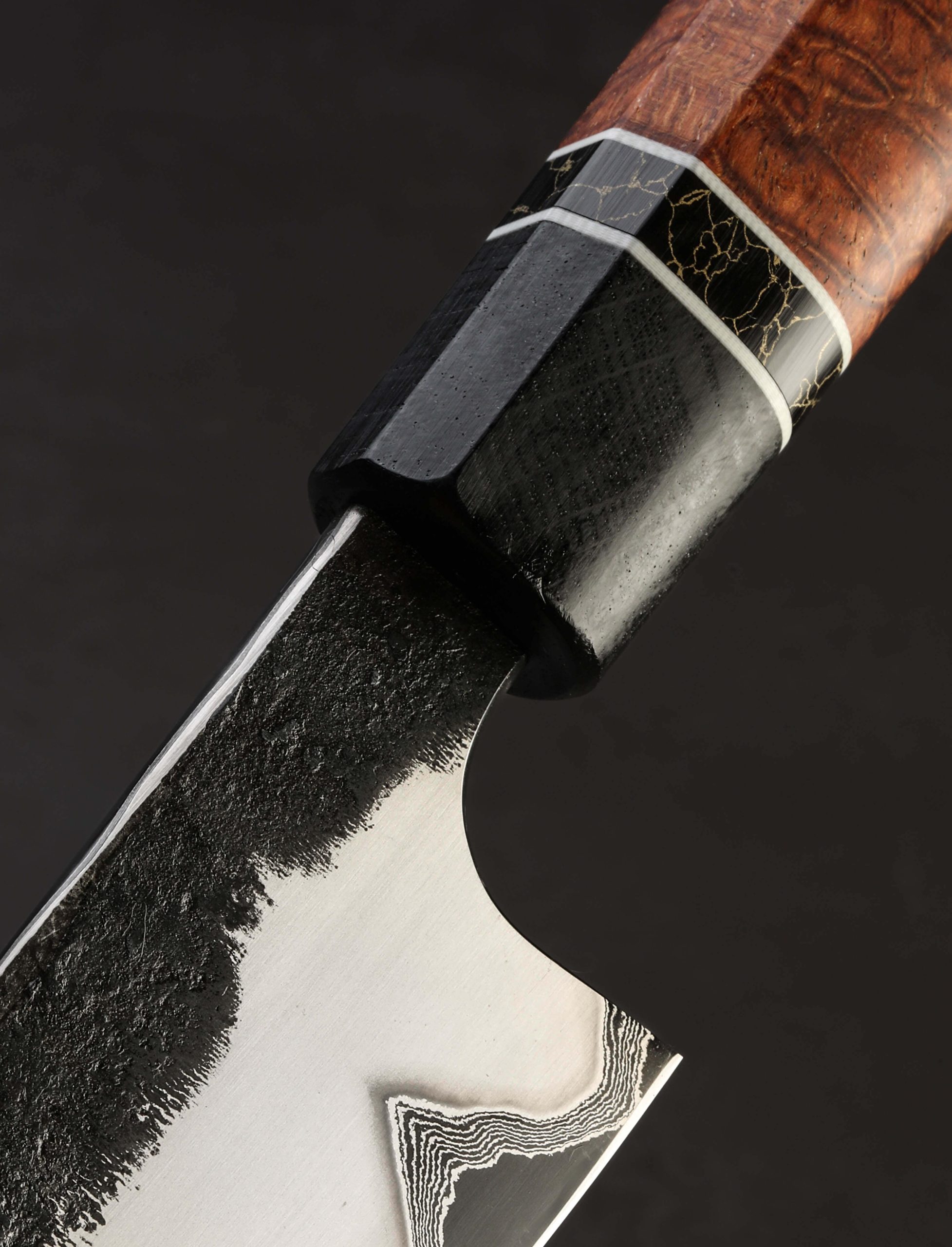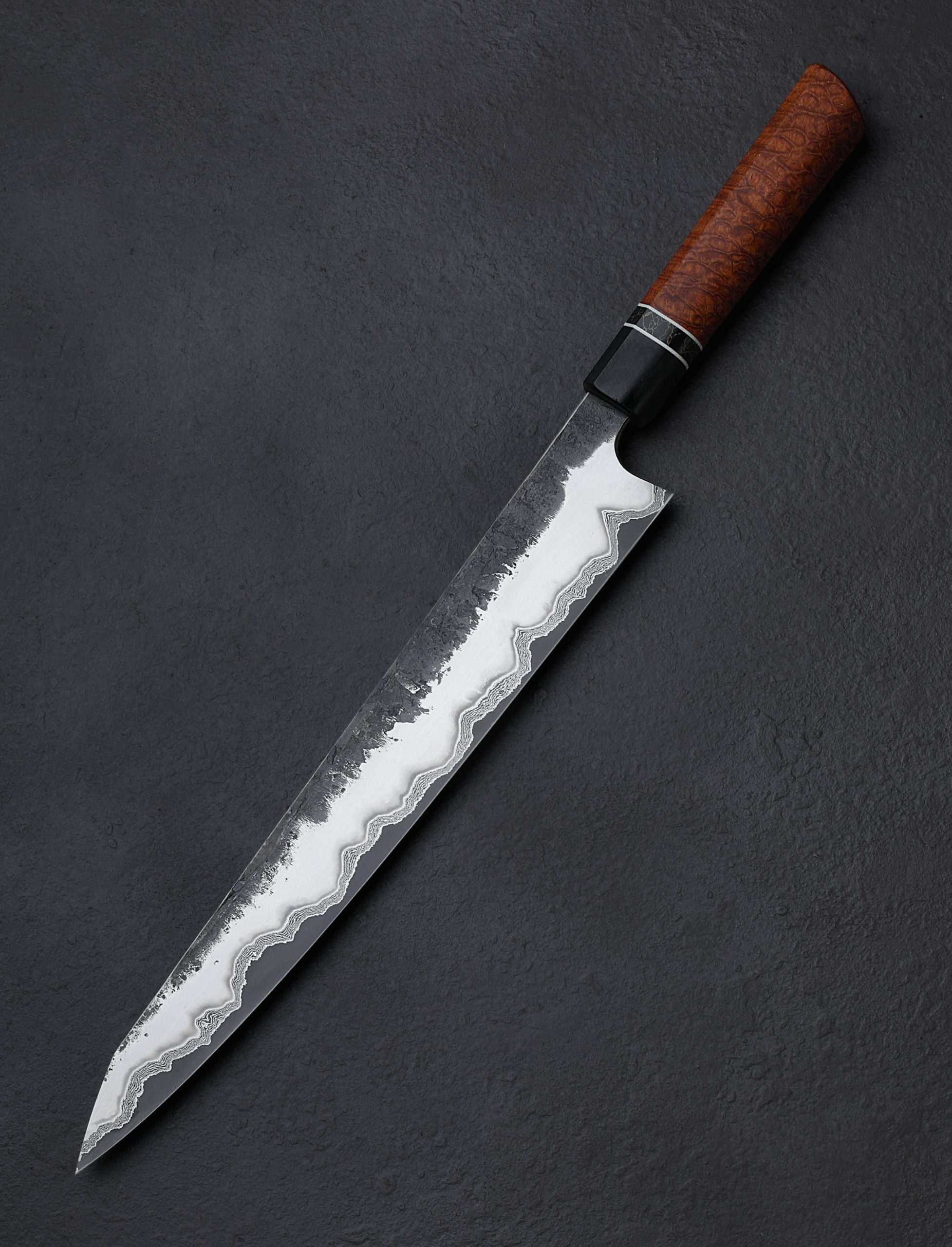 Forever innovating and dreaming, Austrian bladesmith Martin Huber’s unique material combinations and steel layering techniques have produced a robust and fearless sujihiki with a razor-sharp edge that stretches for 317mm from heel to tip. At the cutting edge with its deep, matte gray finish is the core of 1.2419 high-carbon steel. Atop the 1.2419 is inner cladding of 30-layer damascus created from pure nickel and O2 steel. Above that to complete the ‘San-Mai-Mascus’ formula is outer cladding of stainless steel that boasts a beautiful, silky hand-sanded satin finish as well as a dark, textured, forged-finish along the flats that tells the story of the blade’s hand forged origins. Standing a knuckle-clearing 47mm tall at the heel where Martin maintains tough and durable edge geometry, this knife can be used for gyuto-style chopping and prep work for chef’s who appreciate an especially large blade. That stout edge geometry in the rear of the profile then begins to taper, becoming steadily and progressively slimmer moving toward the tip, producing a versatile tool that will perform the fine slicing and carving duties of a sujihiki slicer with flying colors. A touch of lateral flexibility is present in the final inches, and then, the paper-thin, needle-like tip is reached. For comfort and control over this potent, one-of-a-kind object is a handle that shines with the grain and natural beauty of a hardwood we rarely see: afzelia xylay. Seeming to mimic the grain of the wood is a piece of black and gold TruStone, a sustainable composite made from crushed stones and resin, jacketed between rings of white G10, and capped with a bolster of ancient bog oak. Tipping the scales at just 10.5oz / 296g overall, the power and steadiness felt when holding this tool is difficult to put into words.