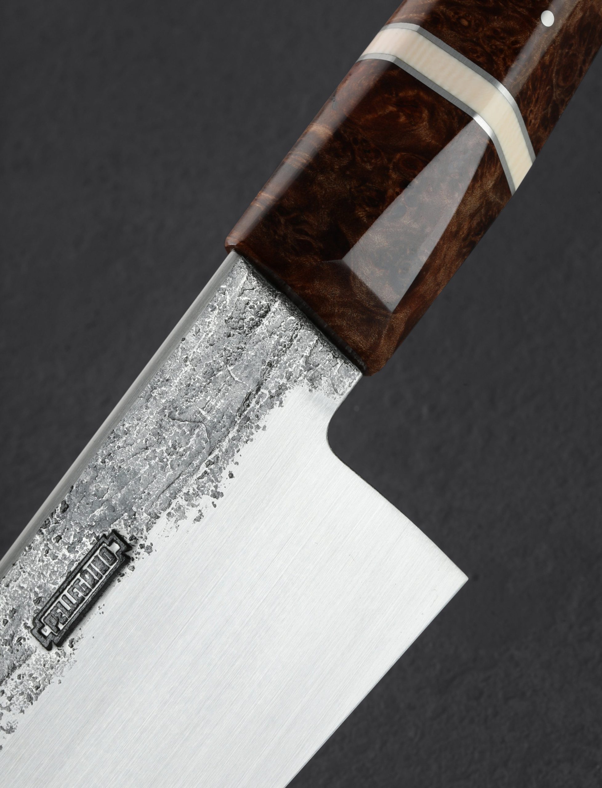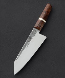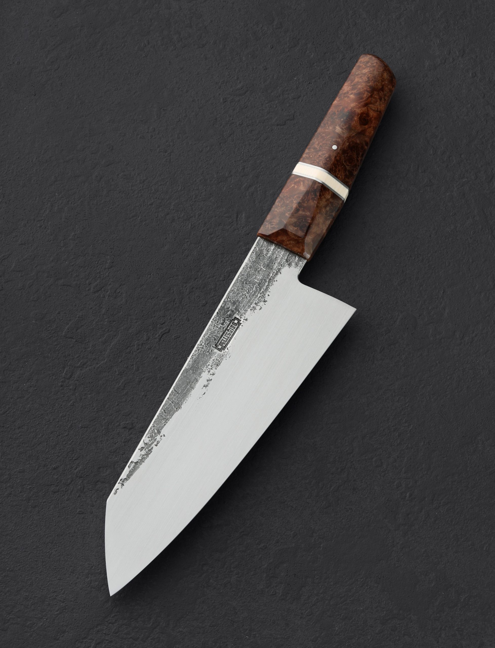 With its silky, lustrous hand-sanded satin finish along the tall, wide bevels contrasting forge-finished flats that lead into the blade’s hidden tang, this handsome bunka chef’s knife by Steve Pellegrino is as versatile in the kitchen as it is easy on the eyes. Standing 63mm tall at the heel with a very thin edge and subtly convex primary bevel geometry, Steve has built a knife to move effortlessly through ingredients large and small, delicate, and dense. Maintaining strength and rigidity along the rounded spine, the blade is tough and ready to chop, while the final inches slim to a needle-like tip that sits low relative to the handle, perfect for detail carving and precision slicing. For home and working kitchens alike the AEB-L high-performance stainless steel is an excellent choice for this hardworking culinary tool. A uniquely shaped handle of converging and tapering facets with gently curved edges, carved from maple with rings of steel and Elforyn, offers comfort and control in any grip.