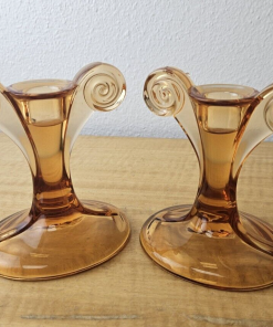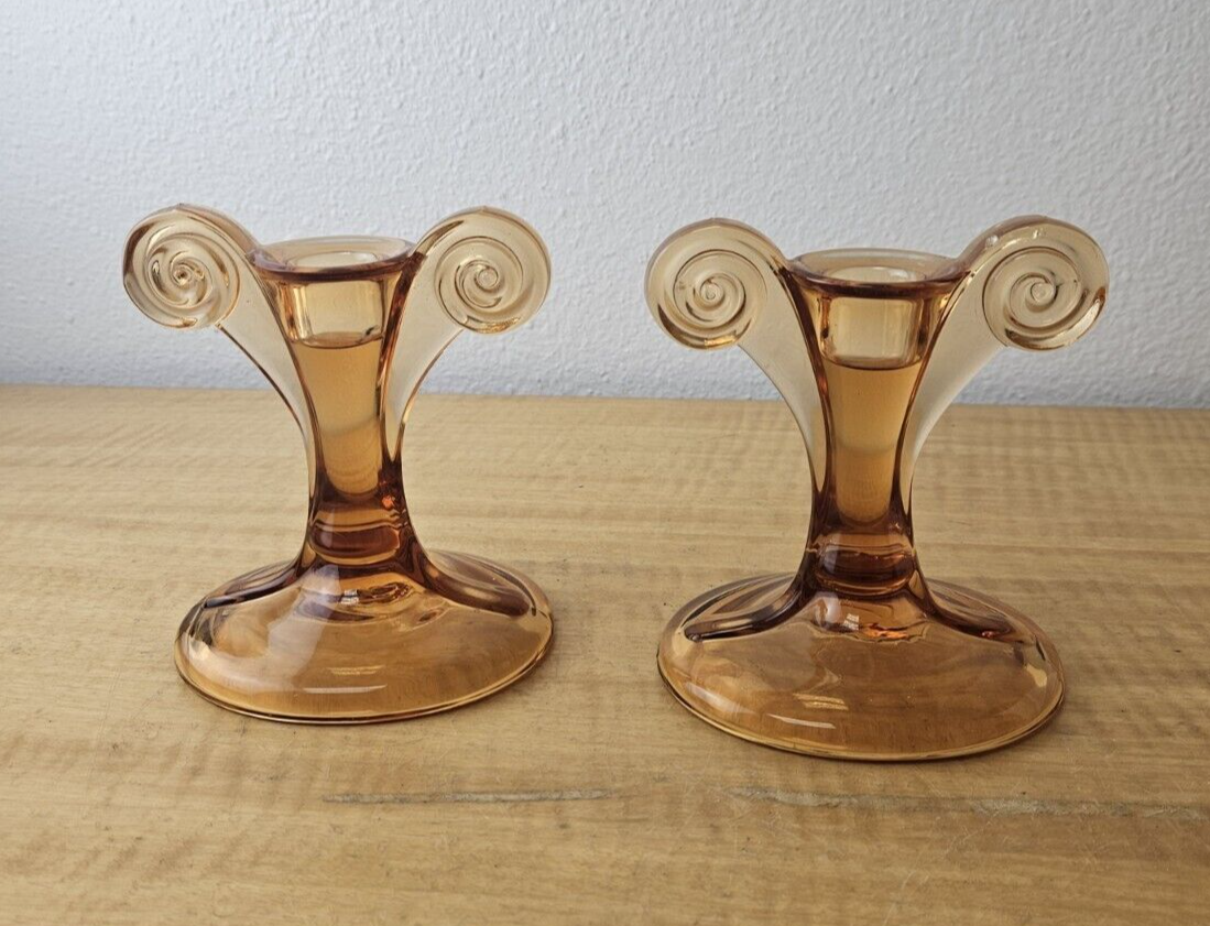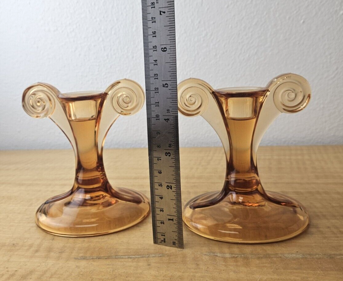 Scroll Glass Candle Holders Amber Orange Art Deco set of 2