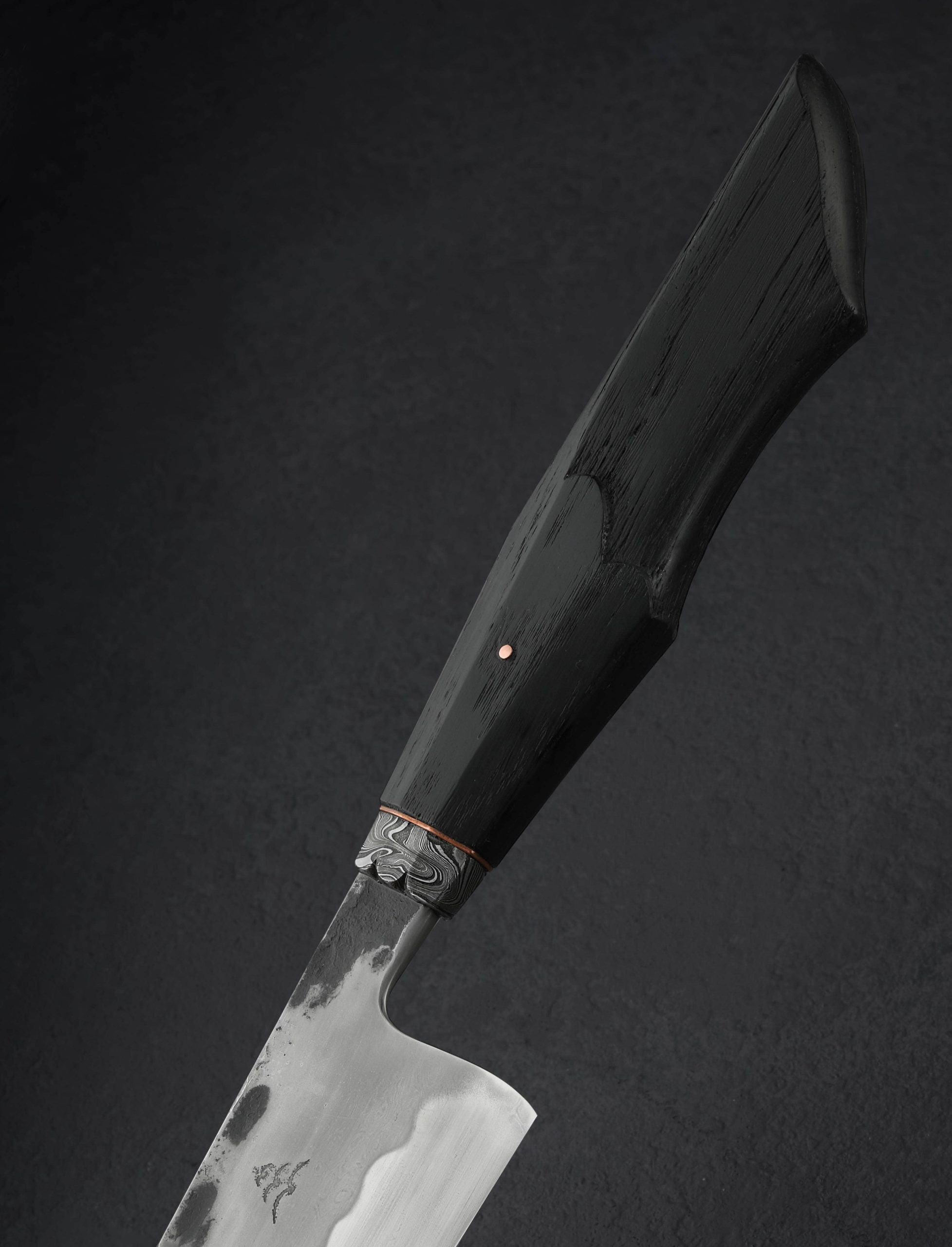 With its beautifully sculpted, ancient bog oak handle, carved damascus ferrule, and forged 26c3 ‘Spicy White’ blade, this heirloom gyuto from Romania’s Toma Fenes is a one-of-a-kind sculptural tool to treasure, and use. The head-turning looks are complemented by versatile performance on the cutting board. Designed for daily cooking in kitchens large and small, the 200mm / 7.9″ blade delivers a sharp, thin edge below superb compound ‘S-grind’ geometry, that, with its Eastern-inspired profile, will excel at both push-pull chopping tasks, and long, precise slices with the hard edge and fine, pointed tip that sits low in relation to the handle. The profile has enough belly to rock nicely on the board, and the blade spine and choil are both rounded for comfort in any grip. Etched and polished to a silky, satin finish, the blade reveals Toma’s excellent hardening process and the resulting hamon line. To control the knife that moves like butter in the hand with its balance point about a centimeter in front of the choil is an elegant, long, and comfortable handle that we cannot get enough of. Bog oak is carved into a hybrid Eastern-Western form with understated details, secured by a domed copper pin, and matched to a copper ring and forged damascus ferrule that each feature a wonderful, museum-style fit. Whether for daily meal prep or tableside carving for special occasions, our newest bladesmith, at just 19 years old, has delivered an outstanding piece of culinary art. A custom, coal-finished poplar saya is included.