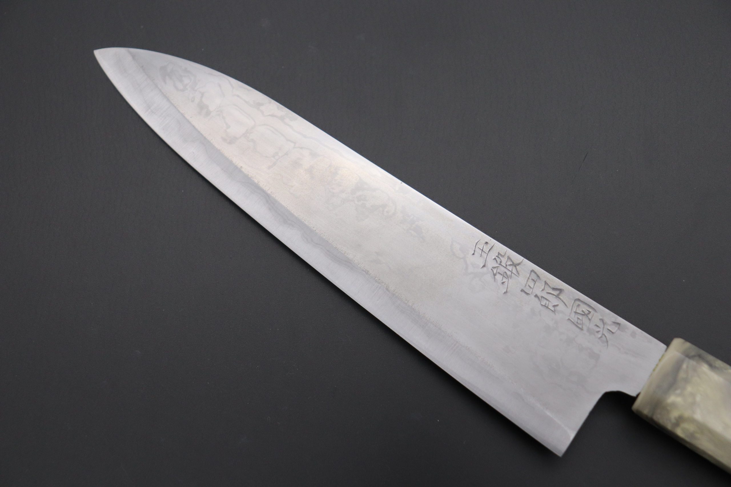 One of our knife experts, who has used and owned Tamahagane knives, stated although Tamahagane steel knives has several demerits —Such as being very prone to discoloration and rust, and not reaching the same Rockwell hardness as popular Japanese carbon steels (e.g. White Steel No.2, Blue steel No.2 and Aogami Super)— he personally felt Tamahagane knives have their own unique appealing warmth and spirit, and their own ‘mysterious’ cutting power. Even though our knife expert is very experienced, he was still very excited to spend time with the Tamahagane steel knives and sharpen them.
