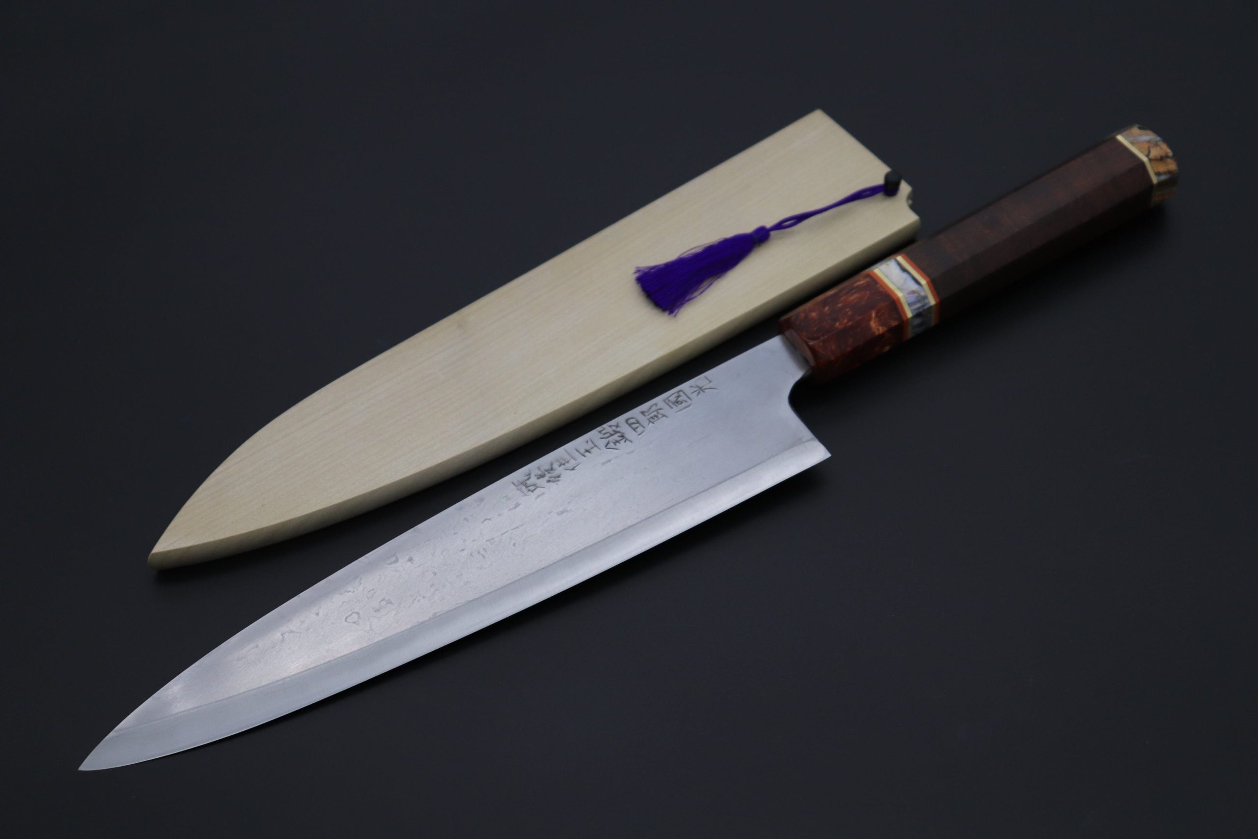 This Custom Limited Edition SHIROU-KUNIMITSU TAMAHAGANE Wa-Gyuto 240mm knife was produced in collaboration with a Custom Handle Maker, who makes beautiful “one-of-a-kind” handles.