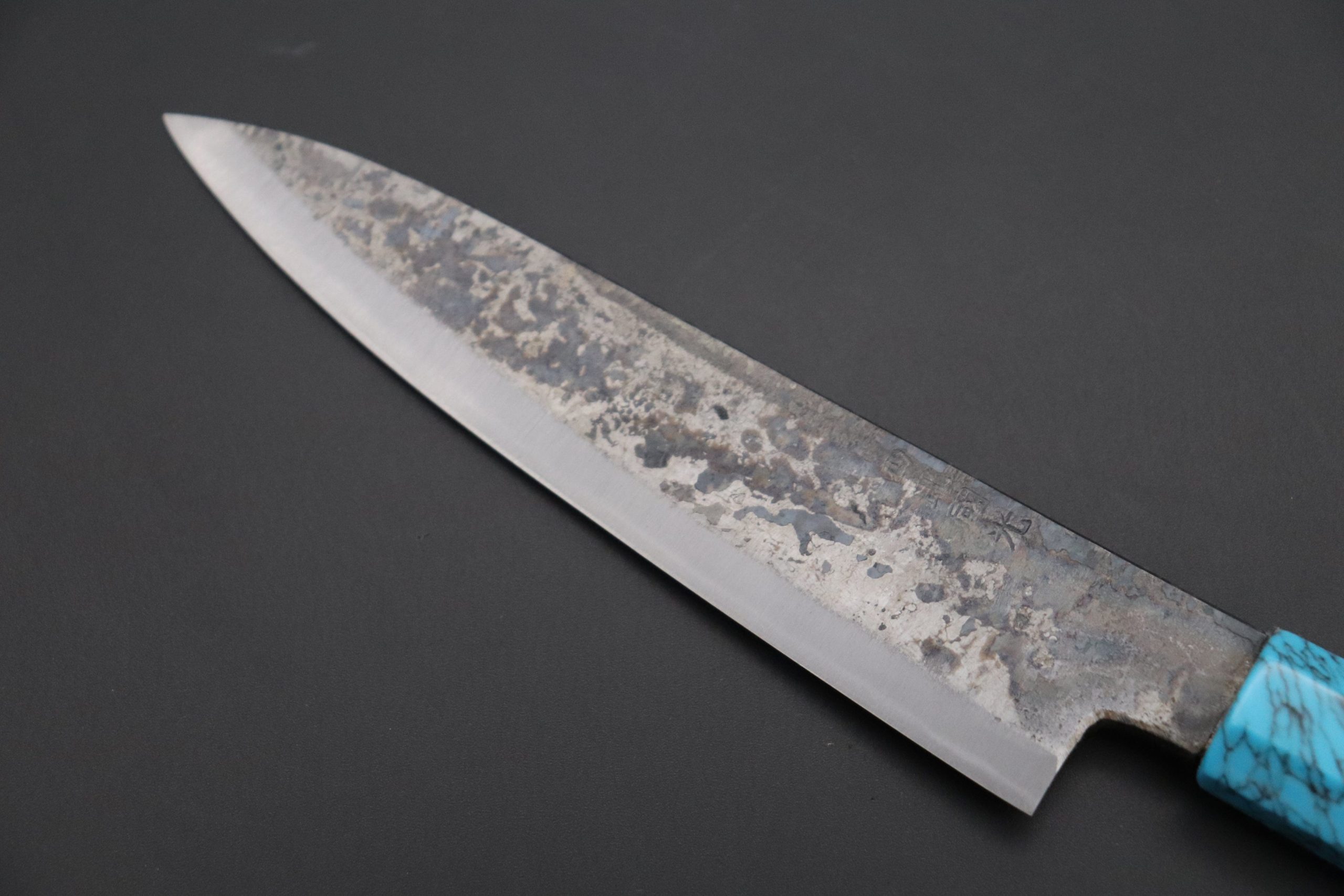 This Special Edition Wa Petty Knife with Contemporary, Stylish Wa Handle. The Innovative Octagonal Ebonywood handle with Turquoise Gem-Composite Stone Ferrule & Butt with Nickel Silver Spacers.