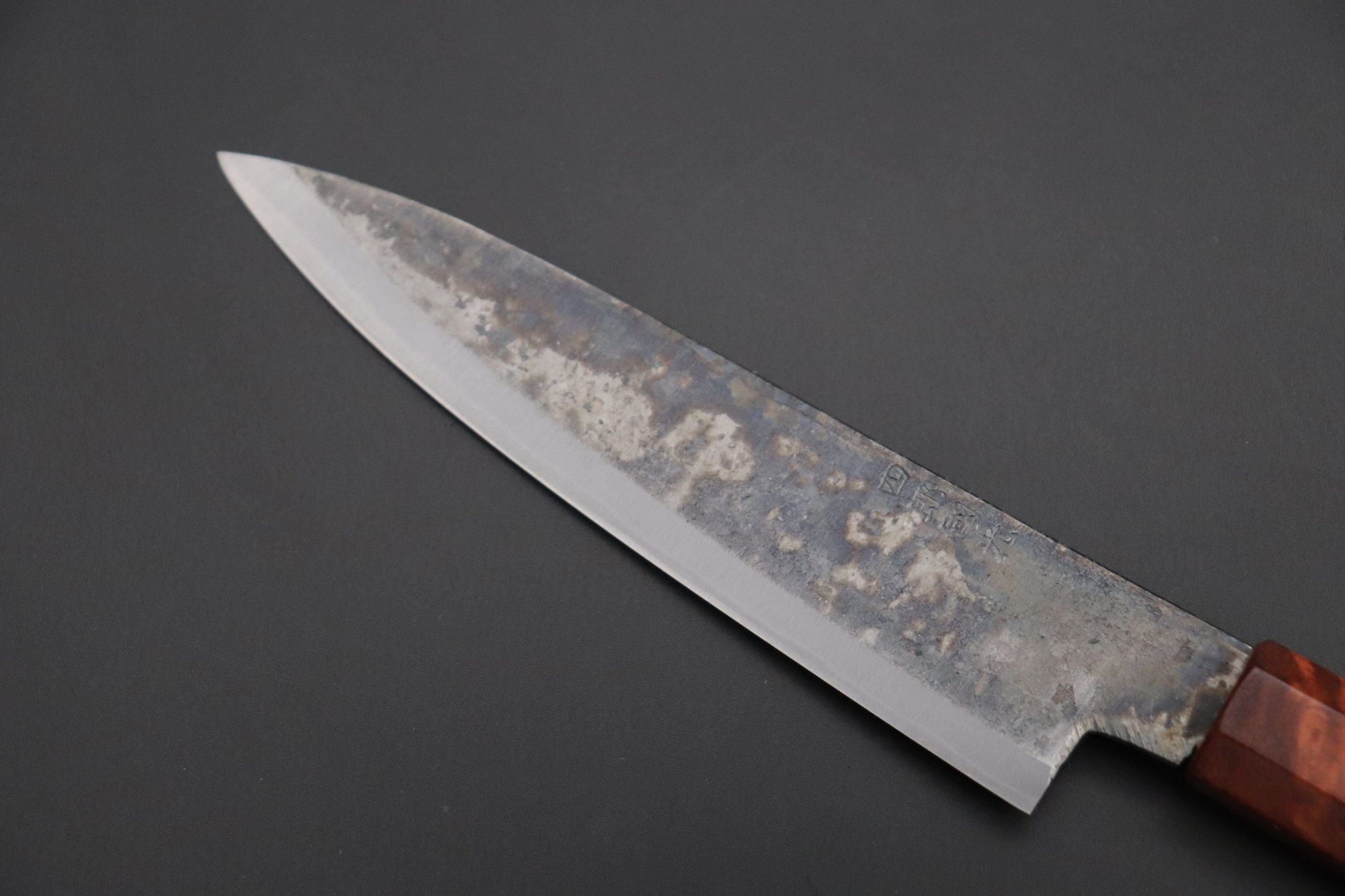 Each one of the unique Kurouchi (“Black forged”) finished blades has an uneven surface and a non-uniform finish. So, if you are looking for a very neat knife, with precise details and great ‘fit & finish’, these Shirou-Kunimitsu handmade traditional forged knives are not well suited to your preferences. However, at the same time, we really appreciate the originality and artisanal spirit of these knives and we think the traditional Kurouchi finish is something really special — We can feel the WABI-SABI aesthetics striking at our hearts and we hope our customers will feel the same way.