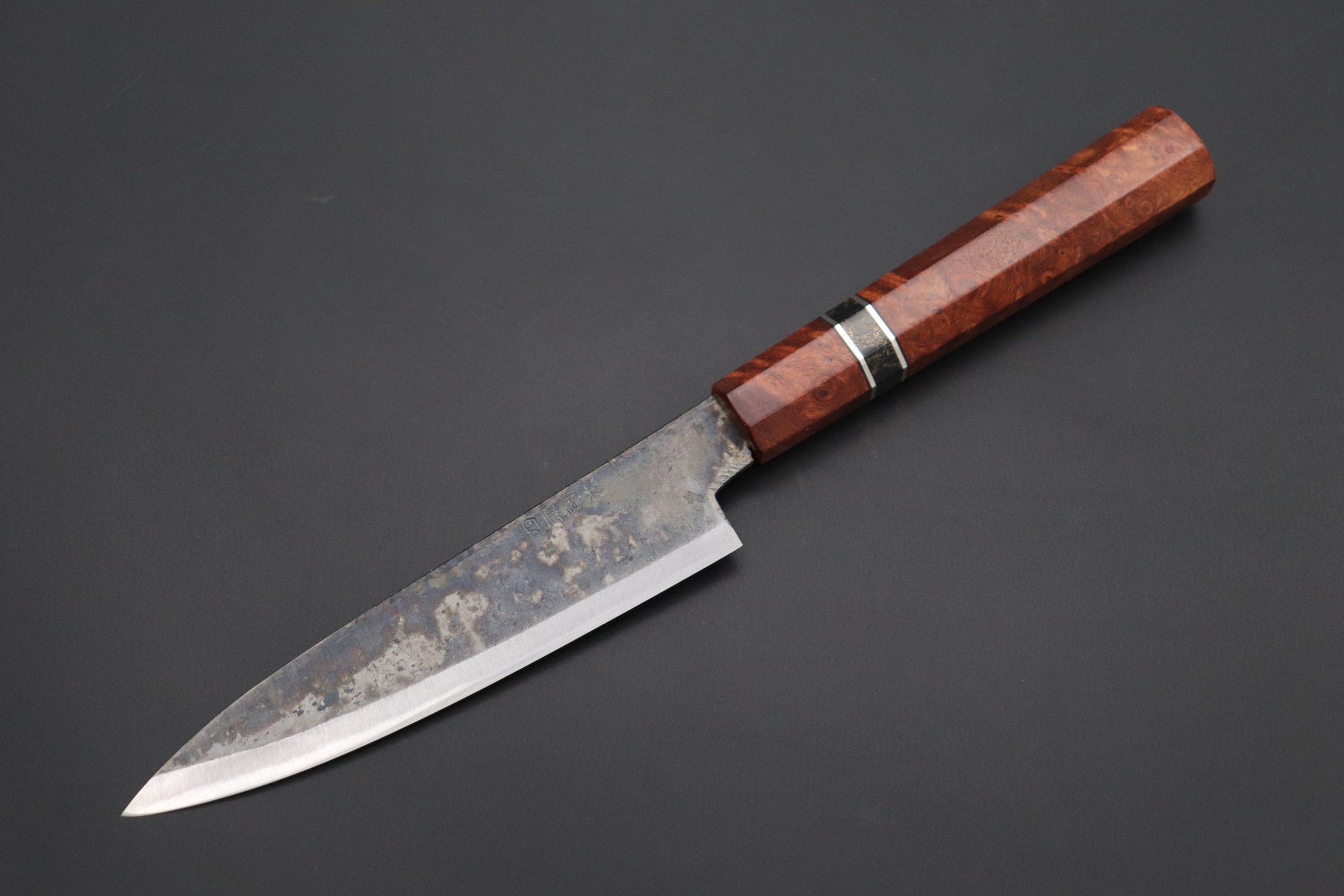This Special Edition Wa Petty Knife with Contemporary, Stylish Wa Handle. The Innovative Octagonal Bubinga Burl Wood Handle with Composite Black Turquoise Gemstone Ring and Nickel Silver Spacers.