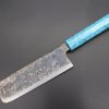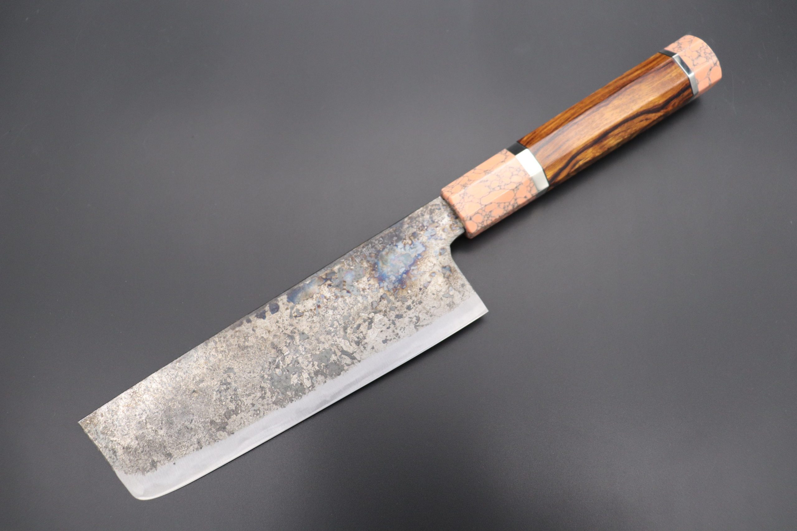 This Special Edition Nakiri Knife with Contemporary, Stylish Wa Handle. The Innovative Octagonal Desert Ironwood handle with Soft Pink Turquoise Gem-Composite Stone Ferrule & Butt with Nickel Silver Spacers.