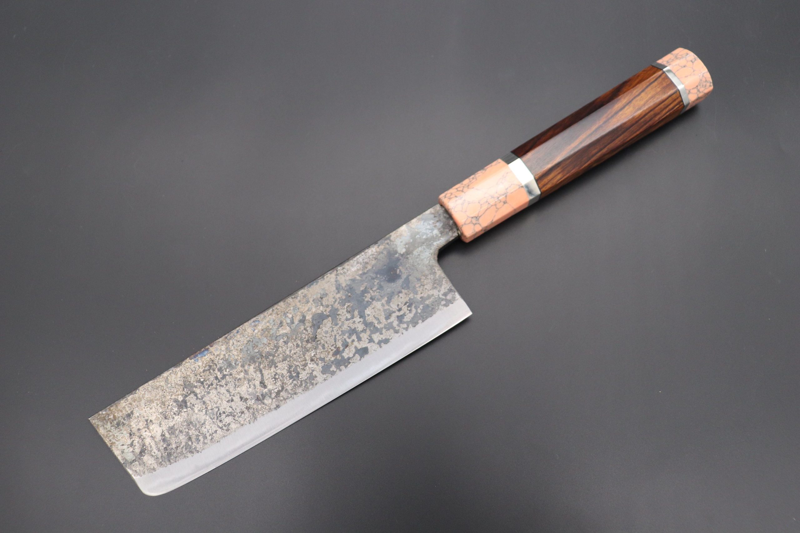 This Special Edition Nakiri Knife with Contemporary, Stylish Wa Handle. The Innovative Octagonal Desert Ironwood handle with Soft Pink Turquoise Gem-Composite Stone Ferrule & Butt with Nickel Silver Spacers.