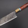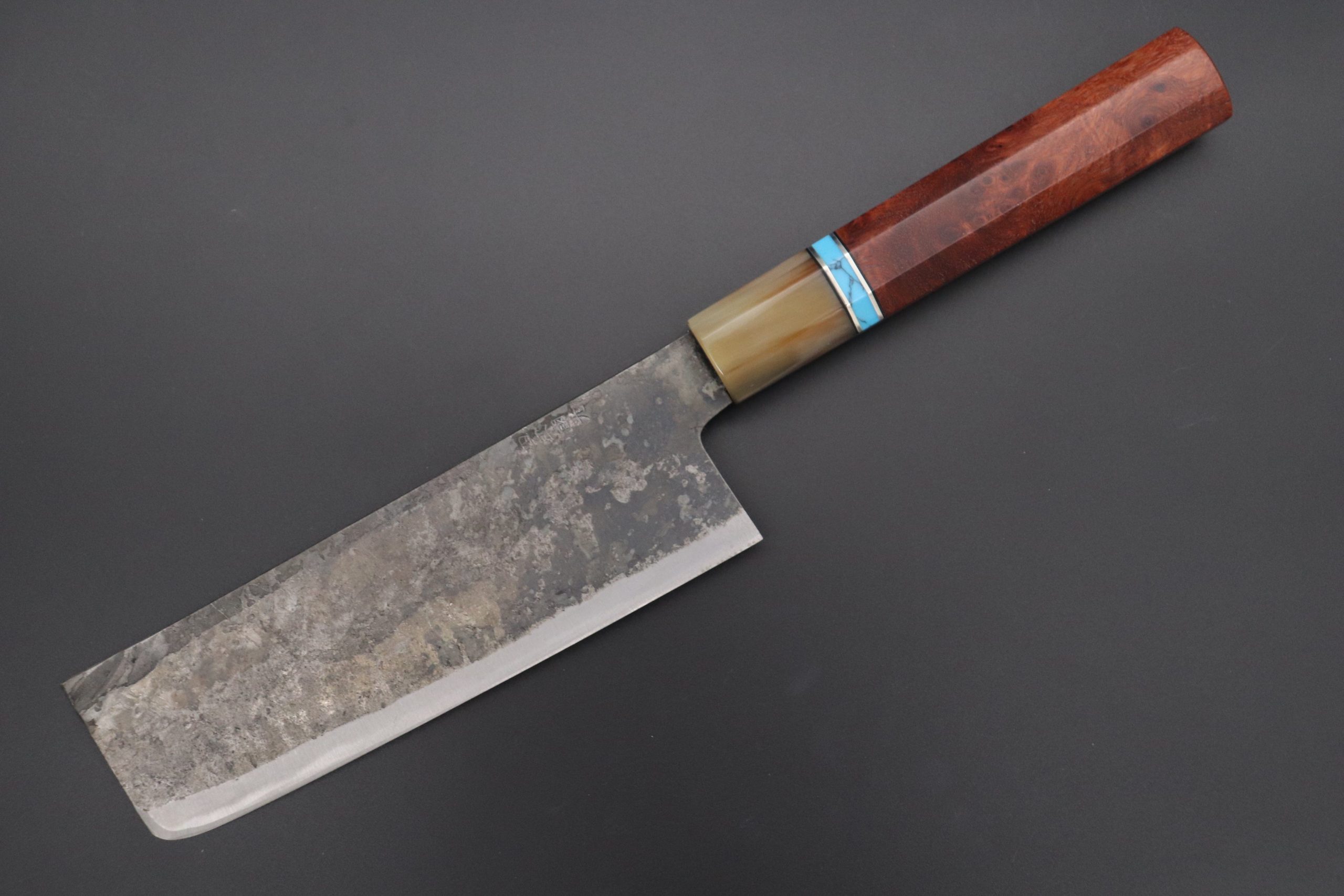 This Special Edition Nakiri Knife with Contemporary, Stylish Wa Handle. The Innovative Octagonal Bubinga Burl Wood Handle with Marble Color Water Buffalo Horn Ferrule and Composite Turquoise Gemstone Ring and Nickel Silver Spacers.