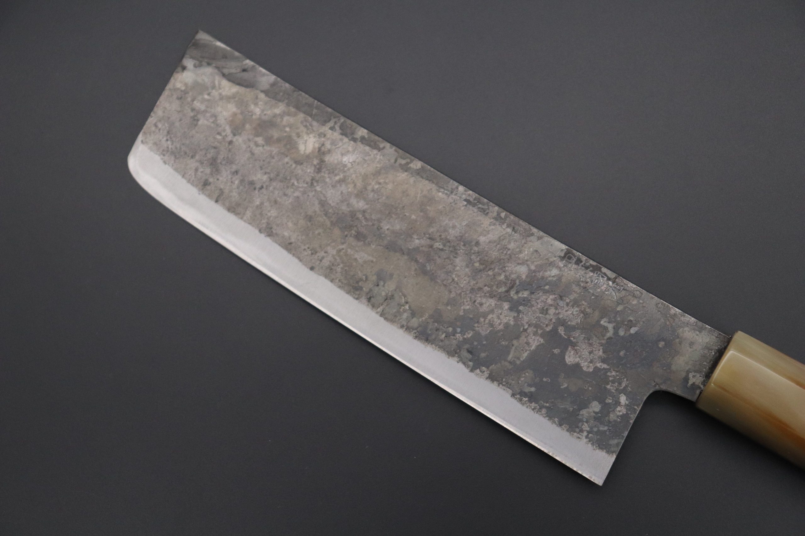 Each one of the unique Kurouchi (“Black forged”) finished blades has an uneven surface and a non-uniform finish. So, if you are looking for a very neat knife, with precise details and great ‘fit & finish’, these Shirou-Kunimitsu handmade traditional forged knives are not well suited to your preferences. However, at the same time, we really appreciate the originality and artisanal spirit of these knives and we think the traditional Kurouchi finish is something really special — We can feel the WABI-SABI aesthetics striking at our hearts and we hope our customers will feel the same way.