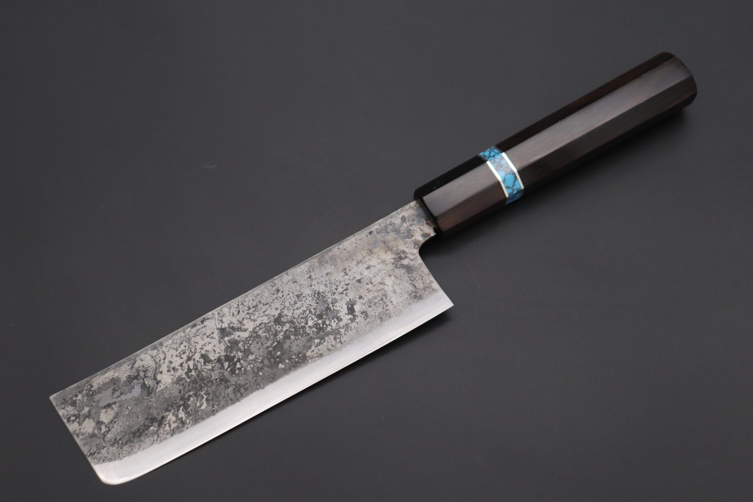 This Special Edition Nakiri Knife with Contemporary, Stylish Wa Handle. The Innovative Octagonal Ebonywood Handle with Composite Turquoise Gemstone Ring and Nickel Silver Spacers.