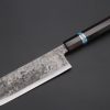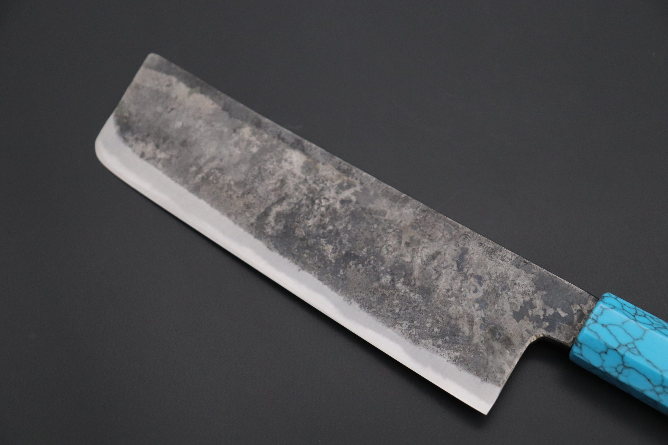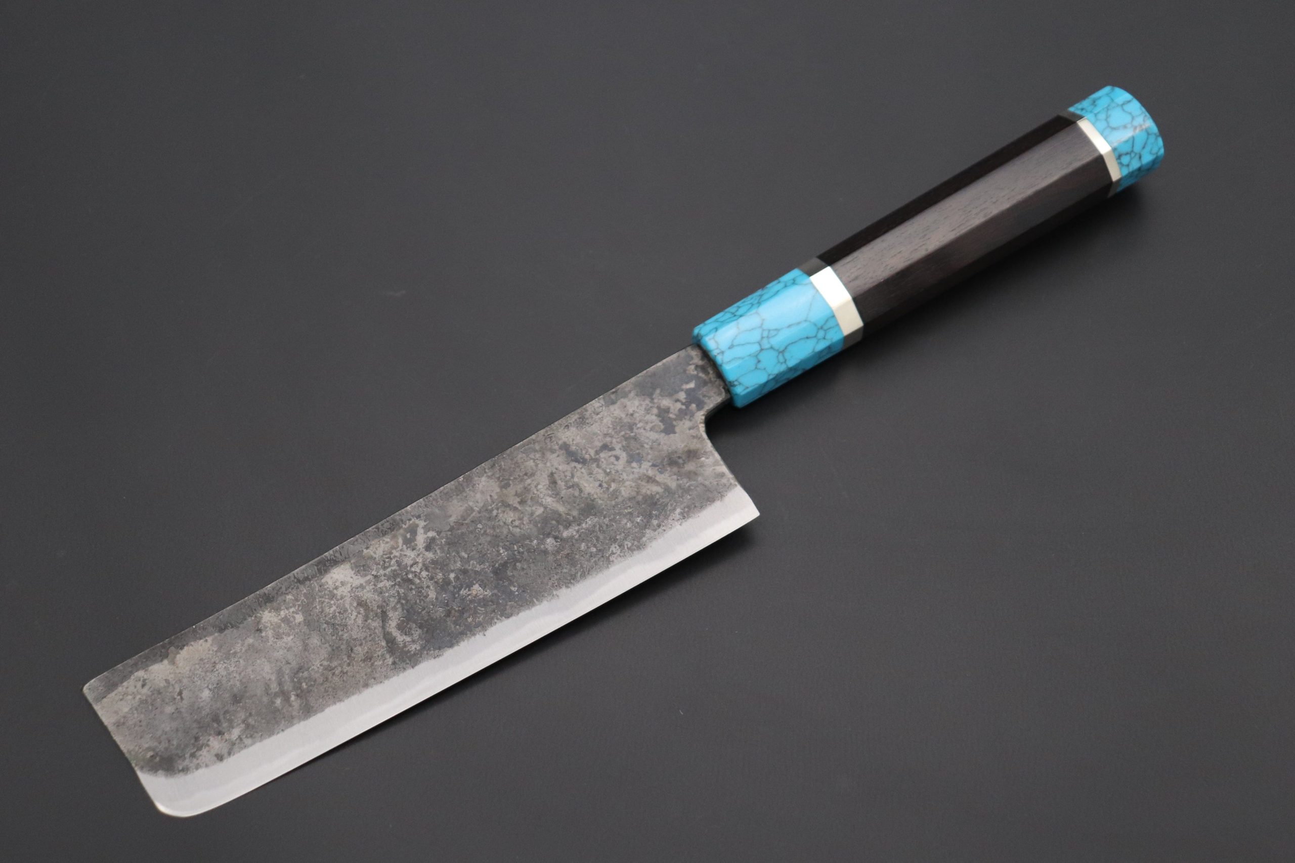 This Special Edition Nakiri Knife with Contemporary, Stylish Wa Handle. The Innovative Octagonal Ebonywood handle with Turquoise Gem-Composite Stone Ferrule & Butt with Nickel Silver Spacers.