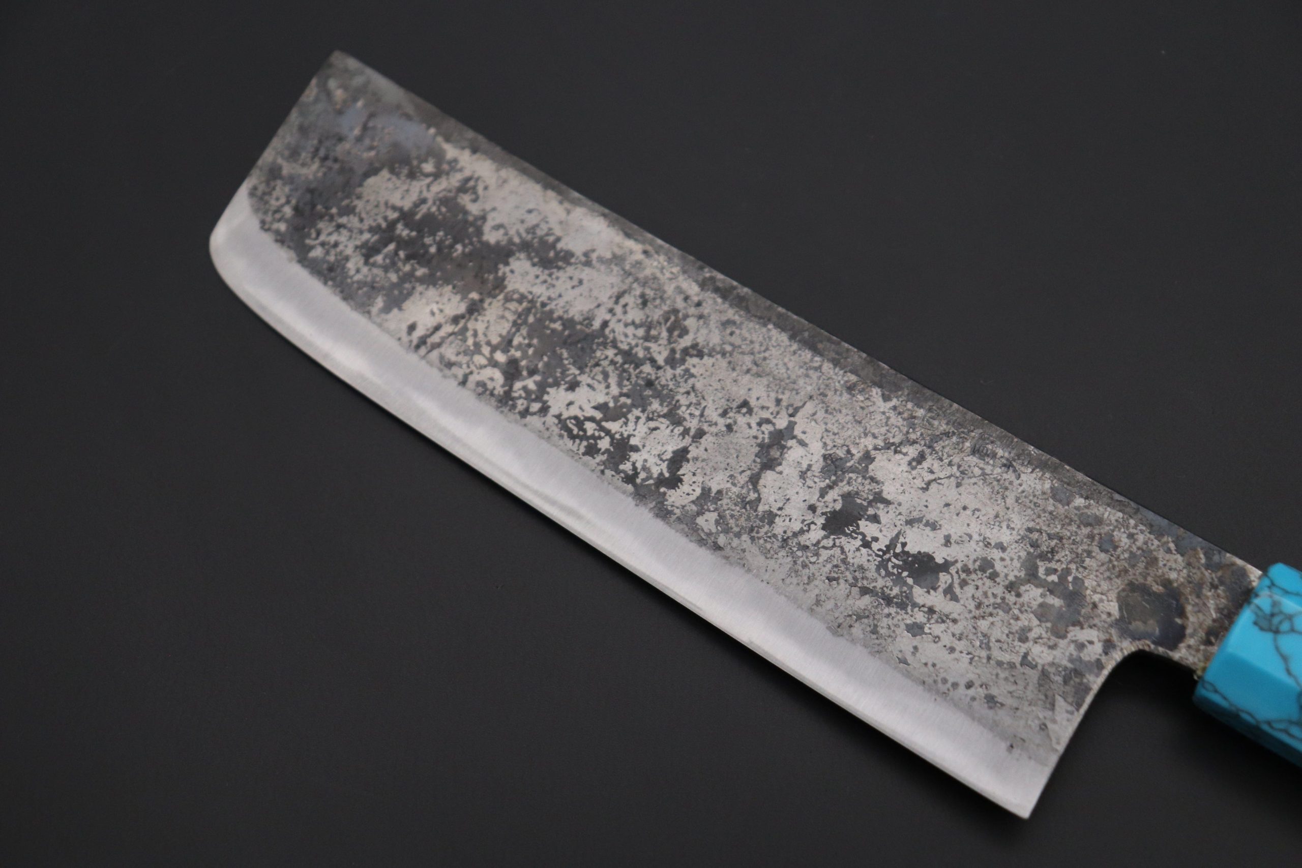 This Special Edition Nakiri Knife with Contemporary, Stylish Wa Handle. The Innovative Octagonal Desert Ironwood handle with Turquoise Gem-Composite Stone Ferrule & Butt with Nickel Silver Spacers.