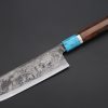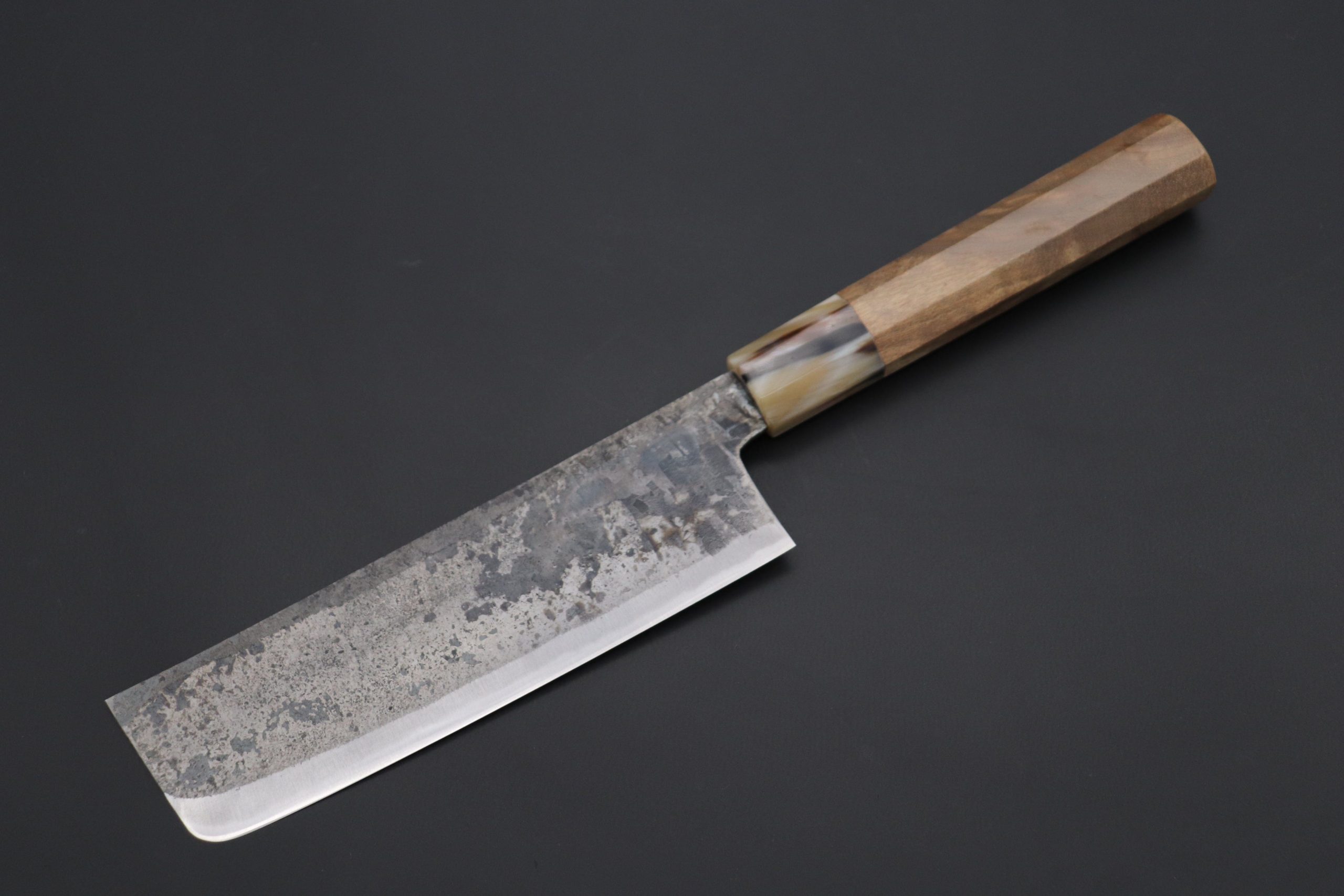 This Special Edition Nakiri Knife with Contemporary, Stylish Wa Handle. The Innovative Octagonal Camphor Burl Wood Handle with Marble Color Water Buffalo Horn Ferrule.