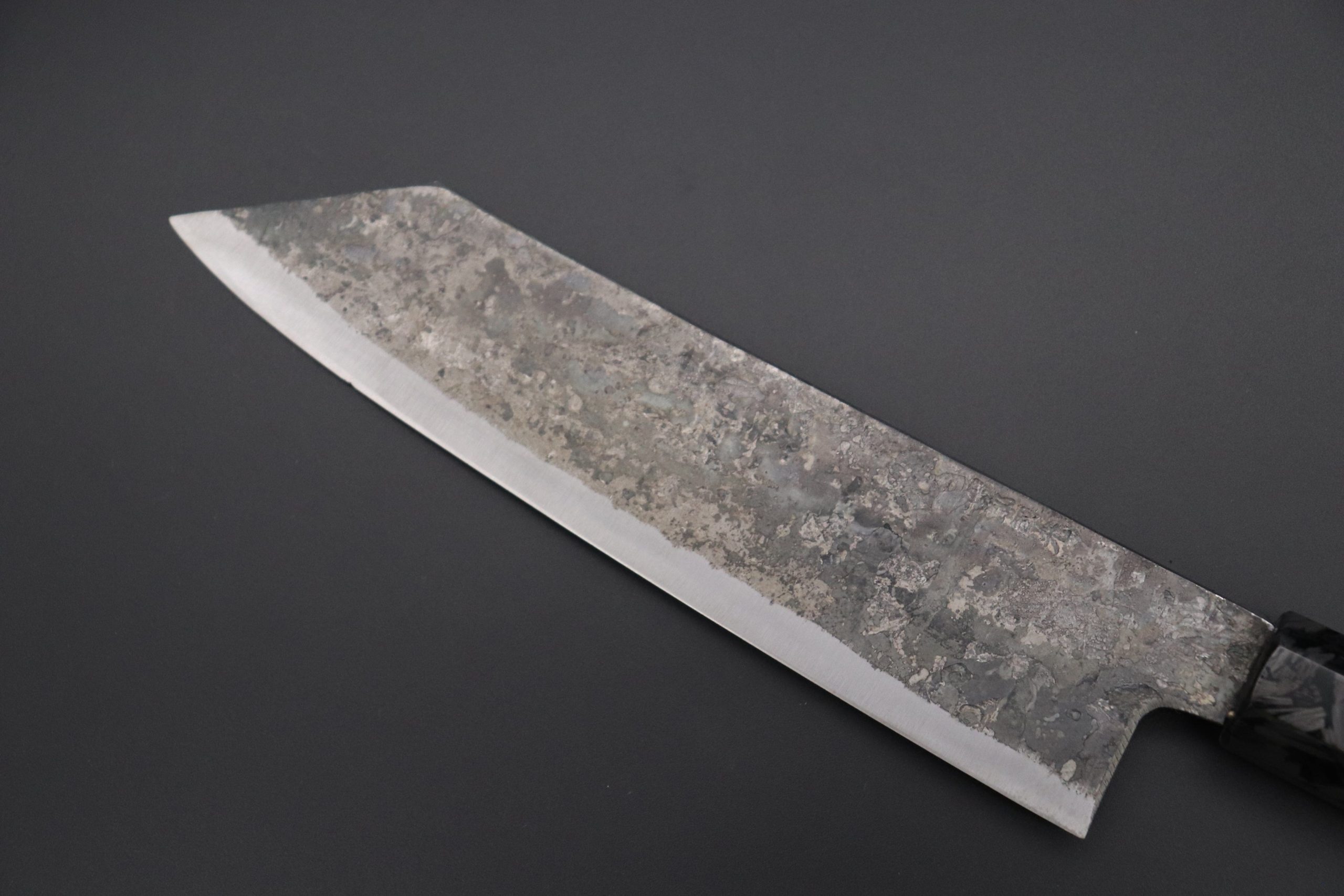 Each one of the unique Kurouchi (“Black forged”) finished blades has an uneven surface and a non-uniform finish. So, if you are looking for a very neat knife, with precise details and great ‘fit & finish’, these Shirou-Kunimitsu handmade traditional forged knives are not well suited to your preferences. However, at the same time, we really appreciate the originality and artisanal spirit of these knives and we think the traditional Kurouchi finish is something really special — We can feel the WABI-SABI aesthetics striking at our hearts and we hope our customers will feel the same way.