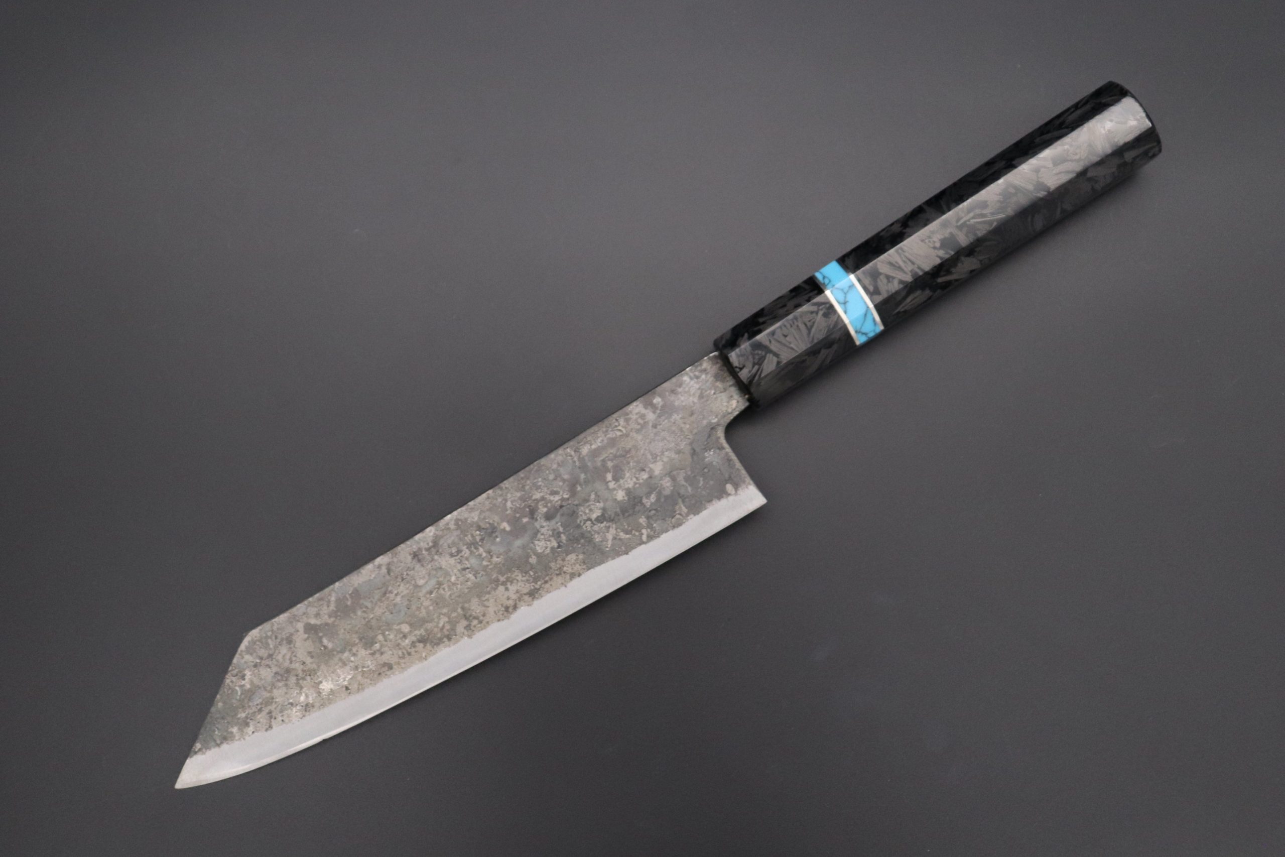 This Special Edition Bunka Knife with Contemporary, Stylish Wa Handle. The Innovative Octagonal Carbon Fiber Handle with Composite Turquoise Gemstone Ring and Nickel Silver Spacers.